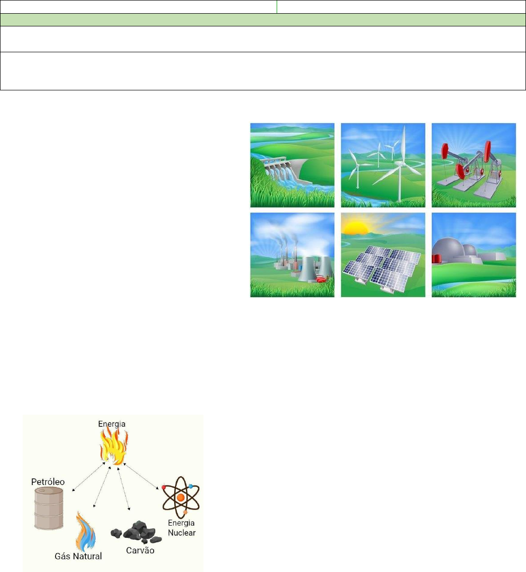 CIÊNCIAS DA NATUREZA TURMA: 8º ANO AULA 01/2023 Objeto de conhecimento: Matéria e Energia: Fontes, tipos e transformações da energia. Fontes de energia renovável e não renovável. Habilidade: (EF08CI01-A/B/C) Identificar e classificar diferentes fontes, renováveis e não renováveis, bem como tipos de energia utilizados em residências, comunidades ou cidades ao longo da história, demonstrando a matriz energética do Estado de Goiás. Fontes de Energia De onde vem a energia que nós utilizamos? A energia pode ser obtida a partir da transformação de variados recursos, que podem ter origens diversas. Existem as fontes de energia não renováveis que podem ser de Fontes Fósseis e Energia Nuclear, assim como existem as fontes de energia renováveis, que podem ser de Energia hidráulica, Energia solar, Energia eólica, Biomassa, Energia geotérmica, Energia oceânica e outras fontes, como o Hidrogênio. Fontes de energia não renováveis As fontes de energia que pertencem a este grupo são finitas ou esgotáveis. Para a maioria delas, a reposição na natureza é muito lenta, pois resulta de um processo de milhões de anos sob condições específicas de temperatura e pressão. Quanto mais usamos as fontes de energia não renováveis, menos teremos no estoque total. São exemplos de fontes não renováveis de energia: petróleo, carvão mineral, gás natural e nuclear. As fontes de energia não renováveis também são conhecidas como fontes de energia convencionais, quando formam a base de suprimento (fornecimento) de energia. Como podemos usá-las sem que o estoque acabe rapidamente? Explorando racionalmente os recursos existentes; promovendo a eficiência no uso e investindo em ciência e tecnologia para o desenvolvimento de fontes renováveis (eólica, hidrelétrica, solar, entre outras) que possam substituir as não renováveis. Atualmente, grande parte de energia consumida no mundo é proveniente de fontes não renováveis, porque as características dessas fontes são bem conhecidas, possuem um rendimento energético elevado (poucas perdas de energia no processo de transformação), preços atrativos, geram muitos empregos e possuem infraestrutura construída para geração e distribuição (usinas, dutos, ferrovias e rodovias). Os principais usos das fontes não renováveis são: • Na geração de eletricidade; • Como combustível nos transportes de cargas e de pessoas • No aquecimento de casas. Algumas fontes não renováveis de energia, como o petróleo e o carvão mineral, são responsáveis por grande parte da emissão (liberação) de gases de efeito estufa na atmosfera, visto que estas fontes são combustíveis (precisam ser queimadas para gerar energia) e liberam gases poluentes, que impactam a saúde e o meio ambiente. Fontes Fósseis: As fontes fósseis são: o carvão mineral, o gás natural e o petróleo e seus subprodutos. Estes recursos foram formados há milhões de anos, a partir do depósito de matéria orgânica (plantas e animais mortos) submetida a condições especiais de temperatura e pressão. Energia Nuclear: A energia nuclear é proveniente de reações que ocorrem no núcleo de certos átomos chamados de radioativos. Estas reações, em geral, dividem um átomo de um elemento químico em dois átomos diferentes liberando uma grande quantidade de energia. Quando isso acontecesse, dizemos que ocorreu a "fissão nuclear". Na natureza, o único elemento natural que encontramos para realizar a fissão nuclear é o Urânio. O urânio é um mineral encontrado na natureza com relativa abundância e antes de ser usado, passa por processos de purificação e concentração (chamados enriquecimento). A energia liberada durante o processo de fissão aquece um líquido, geralmente a água, produzindo vapor, que em alta pressão movimenta as turbinas que, por sua vez, acionam geradores elétricos. Fontes de energia renováveis As fontes de energia que pertencem a este grupo são consideradas inesgotáveis, pois suas quantidades se renovam constantemente ao serem usadas. São exemplos de fontes renováveis: hídrica (energia da água dos rios), solar (energia do sol), eólica (energia do vento), biomassa (energia de matéria orgânica), geotérmica (energia do interior da Terra), oceânica (energia das marés e das ondas) e hidrogênio (energia química da molécula de hidrogênio). Algumas dessas fontes apresentam variação na geração de energia elétrica ao longo do dia ou do ano, como é o caso da eólica, que não é usada quando não há ventos e a energia solar, à noite. No caso da fonte hídrica, podem ocorrer estiagens (secas). As fontes renováveis de energia são consideradas limpas, pois emitem menos gases de efeito estufa (GEE) que as fontes fósseis e, por isso, estão conseguindo uma boa inserção no mercado brasileiro e mundial. Energia Hidráulica: A energia gerada por esta fonte vem do aproveitamento da água dos rios. Nas usinas hidrelétricas, as águas movem turbinas que transformam a energia potencial (da água) em energia mecânica e, por fim, em elétrica. Esta fonte é variável ao longo do ano, porque depende do quanto chove nas cabeceiras dos rios, afinal, é essa água que irá mover as turbinas. Também devemos considerar que, para que haja bom funcionamento de uma usina hidrelétrica, a ação de conservação ambiental na bacia hidrográfica é essencial. Ao longo dos anos, animais e plantas mortos foram se depositando no fundo dos mares Esses animais e plantas foram cobertos por camadas de sedimentos, sendo pressionado sob elas Após milhares de anos, essa matéria orgânica se transformou em petróleo e gás natural, ficando em reservatórios. Energia Solar: A energia solar é uma fonte inesgotável que pode ser aproveitada na forma de calor ou na forma de luz. Para aproveitamento do calor, os raios do sol atingem a superfície dos painéis coletores térmicos, que aquecem a água no seu interior. A água quente pode ser