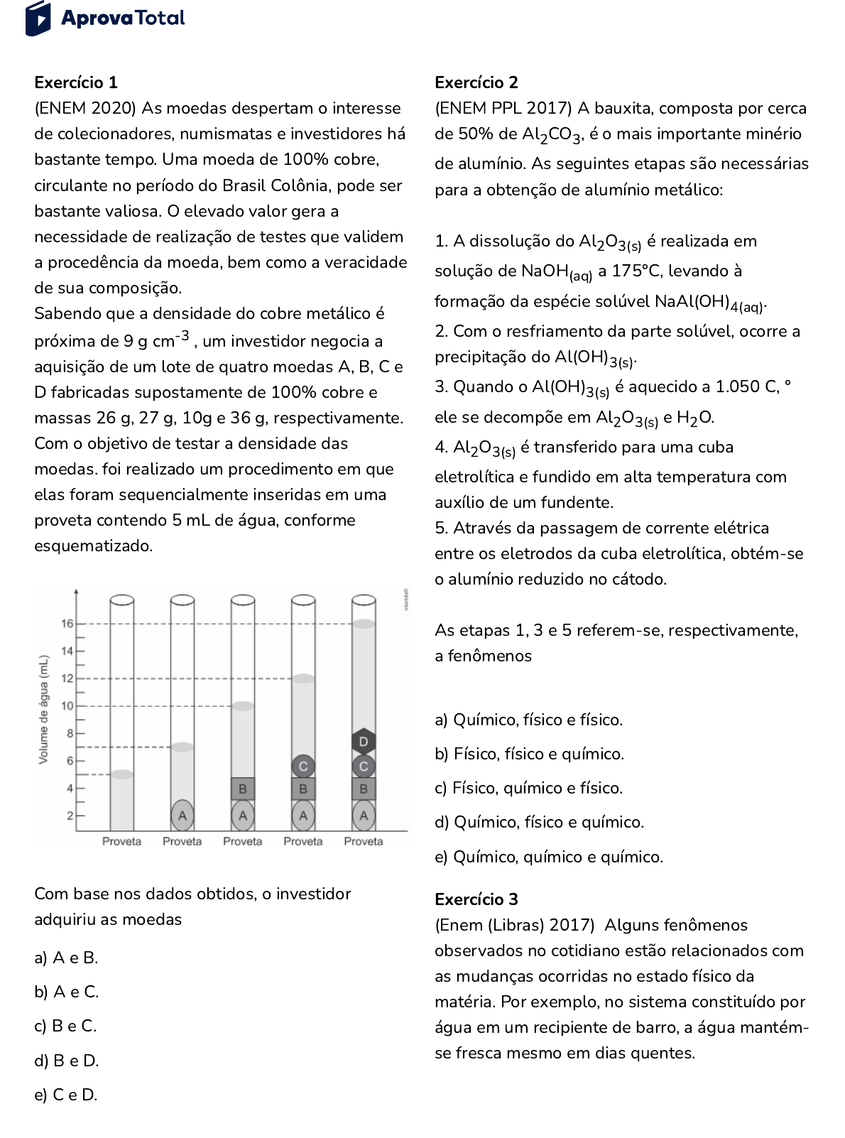 Exercício 1 (ENEM 2020) As moedas despertam o interesse de colecionadores, numismatas e investidores há bastante tempo. Uma moeda de 100% cobre, circulante no período do Brasil Colônia, pode ser bastante valiosa. O elevado valor gera a necessidade de realização de testes que validem a procedência da moeda, bem como a veracidade de sua composição. Sabendo que a densidade do cobre metálico é próxima de 9 g cm-3 , um investidor negocia a aquisição de um lote de quatro moedas A, B, C e D fabricadas supostamente de 100% cobre e massas 26 g, 27 g, 10g e 36 g, respectivamente. Com o objetivo de testar a densidade das moedas. foi realizado um procedimento em que elas foram sequencialmente inseridas em uma proveta contendo 5 mL de água, conforme esquematizado. Com base nos dados obtidos, o investidor adquiriu as moedas a) A e B. b) A e C. c) B e C. d) B e D. e) C e D. Exercício 2 (ENEM PPL 2017) A bauxita, composta por cerca de 50% de Al2CO3, é o mais importante minério de alumínio. As seguintes etapas são necessárias para a obtenção de alumínio metálico: 1. A dissolução do Al2O3(s) é realizada em solução de NaOH(aq) a 175°C, levando à formação da espécie solúvel NaAl(OH)4(aq). 2. Com o resfriamento da parte solúvel, ocorre a precipitação do Al(OH)3(s). 3. Quando o Al(OH)3(s) é aquecido a 1.050 C, ° ele se decompõe em Al2O3(s) e H2O. 4. Al2O3(s) é transferido para uma cuba eletrolítica e fundido em alta temperatura com auxílio de um fundente. 5. Através da passagem de corrente elétrica entre os eletrodos da cuba eletrolítica, obtém-se o alumínio reduzido no cátodo. As etapas 1, 3 e 5 referem-se, respectivamente, a fenômenos a) Químico, físico e físico. b) Físico, físico e químico. c) Físico, químico e físico. d) Químico, físico e químico. e) Químico, químico e químico. Exercício 3 (Enem (Libras) 2017) Alguns fenômenos observados no cotidiano estão relacionados com as mudanças ocorridas no estado físico da matéria. Por exemplo, no sistema constituído por água em um recipiente de barro, a água mantém- se fresca mesmo em dias quentes. A explicação para o fenômeno descrito é que, nas proximidades da superfície do recipiente, a a) condensação do líquido libera energia para o meio. b) solidi�cação do líquido libera energia para o meio. c) evaporação do líquido retira energia do sistema. d) sublimação do sólido retira energia do sistema. e) fusão do sólido retira energia do sistema. Exercício 4 (ENEM 2010) A fonte de energia representada na �gura, considerada uma das mais limpas e sustentáveis do mundo, é extraída do calor gerado a) pela circulação do magma no subsolo. b) pelas erupções constantes dos vulcões. c) pelo sol que aquece as águas com radiação ultravioleta. d) pela queima do carvão e combustíveis fósseis. e) pelos detritos e cinzas vulcânicas. Exercício 5 (Enem 2010) Em nosso cotidiano, utilizamos as palavras “calor” e “temperatura” de forma diferente de como elas são usadas no meio cientí�co. Na linguagem corrente, calor é identi�cado como “algo quente” e temperatura mede a “quantidade de calor de um corpo”. Esses signi�cados, no entanto, não conseguem explicar diversas situações que podem ser veri�cadas na prática. Do ponto de vista cientí�co, que situação prática mostra a limitação dos conceitos corriqueiros de calor e temperatura? a) A temperatura da água pode �car constante durante o tempo em que estiver fervendo. b) Uma mãe coloca a mão na água da banheira do bebê para veri�car a temperatura da água. c) A chama de um fogão pode ser usada para aumentar a temperatura da água em uma panela. d) A água quente que está em uma caneca é passada para outra caneca a �m de diminuir sua temperatura. e) Um forno pode fornecer calor para uma vasilha de água que está em seu interior com menor temperatura do que a dele. Exercício 6 (Enem PPL 2021) A densidade é uma propriedade que relaciona massa e volume de um material. Um estudante iniciou um procedimento de determinação da densidade de uma amostra sólida desconhecida. Primeiro ele determinou a massa da amostra, obtendo 27,8 g. Em seguida, utilizou uma proveta, graduada em mililitro, com água para determinar o volume da amostra, conforme esquematizado na �gura. Considere a densidade da água igual a 1 g/mL. A densidade da amostra obtida, em g/mL, é mais próxima de a) 0,36. b) 0,56. c) 0,62. d) 0,79. e) 2,78. Exercício 7 (ENEM 2016) Algumas práticas agrícolas fazem uso de queimadas, apesar de produzirem grandes efeitos negativos. Por exemplo, quando ocorre a queima da palha de canade-açúcar, utilizada na produção de etanol, há emissão de poluentes como CO2,, SOx, NOx e materiais particulados (MP) para a atmosfera. Assim, a produção de biocombustíveis pode, muitas vezes, ser acompanhada da emissão de vários poluentes. CARDOSO, A. A.; MACHADO, C. M. D.; PEREIRA, E. A. Biocombustível: o mito do combustível limpo. Química Nova na Escola, n. 28, maio 2008 (adaptado). Considerando a obtenção e o consumo desse biocombustível, há transformação química quando a) o etanol é armazenado em tanques de aço inoxidável. b) a palha de cana-de-açúcar é exposta ao sol para secagem. c) a palha da cana e o etanol são usados como fonte de energia. d) os poluentes SOx, NOx e MP são mantidos intactos e dispersos na atmosfera. e) os materiais particulados (MP) são espalhados no ar e sofrem deposição seca. Exercício 8 (ENEM 2018) Usando um densímetro cuja menor divisão da escala, isto é, a diferença entre duas marcações consecutivas, é de 5,0 x 10- 2 g.cm-3 um estudante realizou um teste de densidade: colocou este instrumento na água pura e observou que ele atingiu o repouso na posição mostrada. Em dois outros recipientes A e B contendo 2 litros de água pura, em cada um, ele adicionou 100g e 200g de NaCl, respectivamente. Quando o cloreto de sódio 
