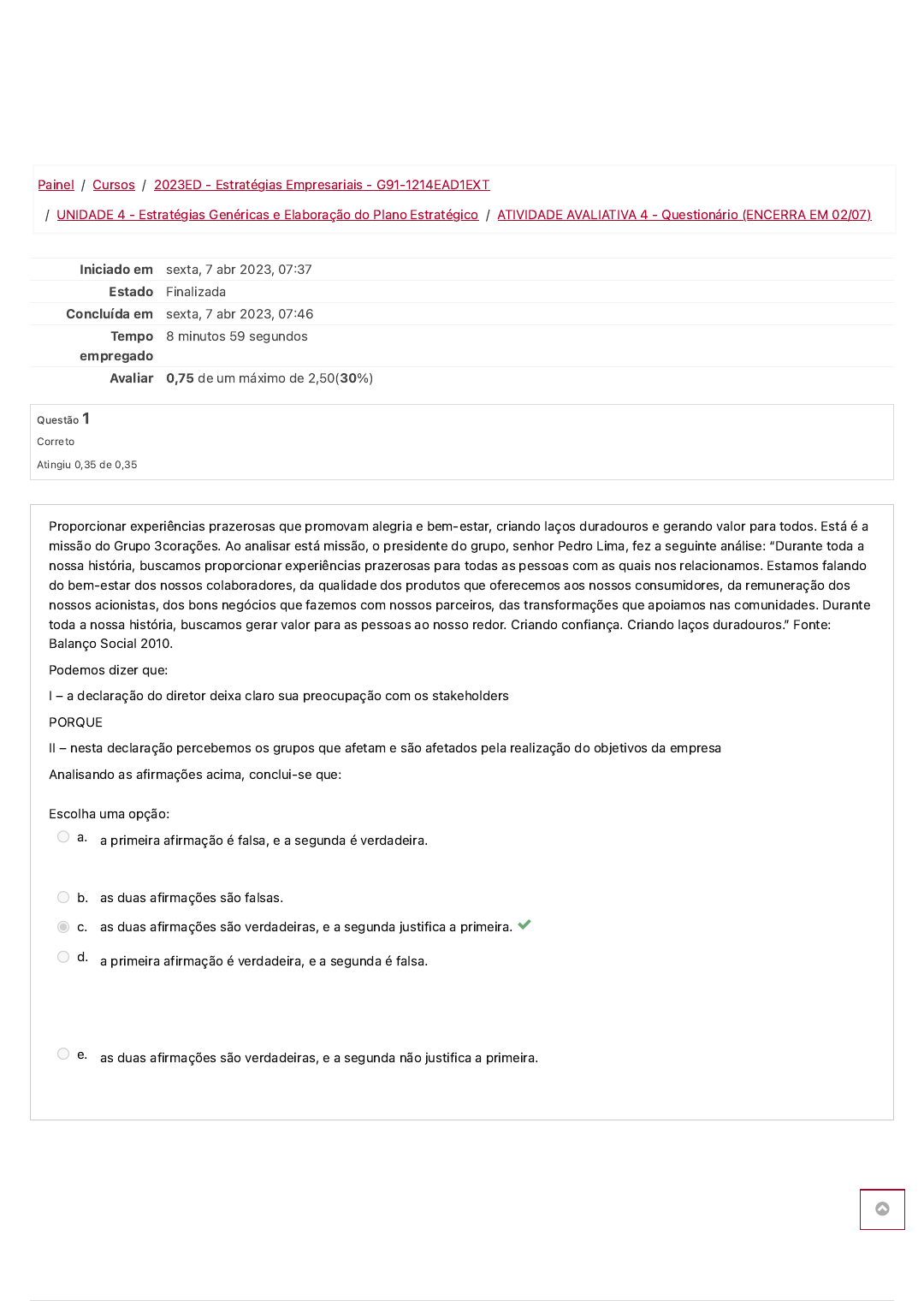 4/7/23, 7:46 AM ATIVIDADE AVALIATIVA 4 - Questionário (ENCERRA EM 02/07): Revisão da tentativa https://ava.uniftec.com.br/mod/quiz/review.php?attempt=33057&cmid=244578 1/6 Painel / Cursos / 2023ED - Estratégias Empresariais - G91-1214EAD1EXT / UNIDADE 4 - Estratégias Genéricas e Elaboração do Plano Estratégico / ATIVIDADE AVALIATIVA 4 - Questionário (ENCERRA EM 02/07) Iniciado em sexta, 7 abr 2023, 07�37 Estado Finalizada Concluída em sexta, 7 abr 2023, 07�46 Tempo empregado 8 minutos 59 segundos Avaliar 0,75 de um máximo de 2,50(30%) Questão 1 Correto Atingiu 0,35 de 0,35 Proporcionar experiências prazerosas que promovam alegria e bem-estar, criando laços duradouros e gerando valor para todos. Está é a missão do Grupo 3corações. Ao analisar está missão, o presidente do grupo, senhor Pedro Lima, fez a seguinte análise: “Durante toda a nossa história, buscamos proporcionar experiências prazerosas para todas as pessoas com as quais nos relacionamos. Estamos falando do bem-estar dos nossos colaboradores, da qualidade dos produtos que oferecemos aos nossos consumidores, da remuneração dos nossos acionistas, dos bons negócios que fazemos com nossos parceiros, das transformações que apoiamos nas comunidades. Durante toda a nossa história, buscamos gerar valor para as pessoas ao nosso redor. Criando confiança. Criando laços duradouros.” Fonte: Balanço Social 2010. Podemos dizer que: I – a declaração do diretor deixa claro sua preocupação com os stakeholders PORQUE II – nesta declaração percebemos os grupos que afetam e são afetados pela realização do objetivos da empresa Analisando as afirmações acima, conclui-se que: Escolha uma opção: a. a primeira afirmação é falsa, e a segunda é verdadeira. b. as duas afirmações são falsas. c. as duas afirmações são verdadeiras, e a segunda justifica a primeira. d. a primeira afirmação é verdadeira, e a segunda é falsa. e. as duas afirmações são verdadeiras, e a segunda não justifica a primeira. https://ava.uniftec.com.br/course/view.php?id=4149 https://ava.uniftec.com.br/my/ https://ava.uniftec.com.br/course/index.php https://ava.uniftec.com.br/course/view.php?id=4149 https://ava.uniftec.com.br/course/view.php?id=4149§ion=5 https://ava.uniftec.com.br/mod/quiz/view.php?id=244578 4/7/23, 7:46 AM ATIVIDADE AVALIATIVA 4 - Questionário (ENCERRA EM 02/07): Revisão da tentativa https://ava.uniftec.com.br/mod/quiz/review.php?attempt=33057&cmid=244578 2/6 Questão 2 Incorreto Atingiu 0,00 de 0,35 Faça uma análise da figura a seguir, que apresenta o Mapa Estratégico de uma instituição Considere que as linhas pontilhadas são divisoras dos quadros de um BSC e selecione a alternativa correta em relação a estruturação do mapa estratégico apresentado: Escolha uma opção: a. Perspectiva do Aprendizado (Quadro II), Perspectiva dos Processos Internos (Quadro III), Perspectiva dos Clientes ou Mercado (Quadro I), Perspectiva Financeira (Quadro IV) b. Perspectiva do Aprendizado (Quadro I), Perspectiva dos Processos Internos (Quadro III), Perspectiva dos Clientes ou Mercado (Quadro II), Perspectiva Financeira (Quadro IV) IncorretoOps!! Melhora rever o conteúdo!! c. Perspectiva do Aprendizado (Quadro I), Perspectiva dos Processos Internos (Quadro II), Perspectiva dos Clientes ou Mercado (Quadro III), Perspectiva Financeira (Quadro IV) d. Perspectiva do Aprendizado (Quadro III), Perspectiva dos Processos Internos (Quadro II), Perspectiva dos Clientes ou Mercado (Quadro I), Perspectiva Financeira (Quadro IV) e. Perspectiva do Aprendizado (Quadro IV), Perspectiva dos Processos Internos (Quadro II), Perspectiva dos Clientes ou Mercado (Quadro II), Perspectiva Financeira (Quadro I). 4/7/23, 7:46 AM ATIVIDADE AVALIATIVA 4 - Questionário (ENCERRA EM 02/07): Revisão da tentativa https://ava.uniftec.com.br/mod/quiz/review.php?attempt=33057&cmid=244578 3/6 Questão 3 Incorreto Atingiu 0,00 de 0,35 Ao definir seu sistema produtivo a Café Ana Rita, organizou o processo de forma que a produção contínua em um processo onde não ocorrem intervenções porque o processo atende às exigências de padrões para determinados tipos de café e de embalagens. A produção em lotes é definida a partir da demanda existente em relação as embalagens de 250 e 500 gramas. A empresa vem obtendo vantagem em suas operações perante o mercado. Considerando o descrito acima e os níveis da estratégia, podemos dizer que: I – este é um exemplo de estratégia corporativa, visto que define o setor de atividade da empresa II – esta é um exemplo de estratégia competitiva, uma vez que define como a empresa vai competir no setor definido III – este é um exemplo de estratégia funcional, já que defini com o setor de produção irá organizar-se para atender a estratégia geral da empresa. Selecione a alternativa correta: Escolha uma opção: a. Apenas a afirmativa III está correta b. Todas as afirmativas estão corretas c. Apenas a afirmativa I está correta d. Todas as afirmativas estão erradas e. Apenas a afirmativa II está correta 4/7/23, 7:46 AM ATIVIDADE AVALIATIVA 4 - Questionário (ENCERRA EM 02/07): Revisão da tentativa https://ava.uniftec.com.br/mod/quiz/review.php?attempt=33057&cmid=244578 4/6 Questão 4 Incorreto Atingiu 0,00 de 0,35 Questão 5 Incorreto Atingiu 0,00 de 0,35 Nos últimos anos tem havido maior demanda por cafés especiais; se o produtor tiver acesso a mercados que valorizem a qualidade, vale a pena investir na produção. É uma oportunidade para ele agregar valor ao produto, cujo preço varia de acordo com a qualidade do grão e da bebida, e aumentar a competitividade na cafeicultura. Alguns estudos já apontam que, dentro de alguns anos, a oferta de cafés especiais já não poderá atender à procura crescente dos principais países consumidores, principalmente os EUA. Atentos a este mercado, produtores brasileiros têm feito grandes investimentos na modernização de infrae