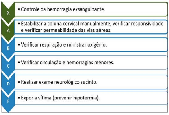 ATENDIMENTO AO PACIENTE POLITRAUMATIZADO: Avaliação primária e secundária. Após analisar a cena, é necessário controlar a situação, acionando recursos adicionais para as medidas de sinalização do local, isolamento da cena, estabilização de veículos, controle de tráfego, desligamento de motores automotivos, desativação de cabos elétricos energizados, remoção de pacientes em situação de risco iminente, entre outros. Depois dessas medidas tomadas, segue a avaliação da vítima. Segundo o PHTLS, a avaliação da vítima inclui o exame primário, exame secundário seguido de monitorização e avaliação. No trauma simples e sem lesões graves, como nas fraturas menores, o socorrista pode fazer o atendimento pré-hospitalar completo com avaliação primária e secundária, porém, se o paciente apresenta lesões graves, o máximo que pode ser feito é a avaliação primária, pois a vítima deve ser encaminhada ao serviço especializado o mais rápido possível. O PHTLS traz a diferença da vítima politraumatizada (trauma em multissistemas), ou seja, o trauma afetou mais de um sistema do corpo, incluindo o sistema pulmonar, cardíaco, gastrointestinal, neurológico) e o trauma em apenas um sistema (como uma fratura simples de tornozelo). Fase pré-hospitalar: • Avaliação da segurança da cena segura; • Uso de EPI’s; • Sinalização da cena; • Transporte apropriado ao hospital mais próximo. AVALIAÇÃO PRIMÁRIA Avaliação primária é dividida em avaliação do trauma e do agravo clínico. A avaliação primária do trauma foi ampliada com a letra x, xabcde e na avaliação primária do agravo clínico continuamos com 5 etapas (abcde) Avaliação de Lesões Ocultas na Avaliação Primária As lesões ocultas são aquelas em que ocorrem danos internos que não são perceptíveis externamente como, por exemplo, o sangramento interno após um trauma abdominal. Essas lesões ocultas devem ser procuradas, principalmente nos pacientes com abuso de álcool e drogas, idosos, vítimas em uso de anticoagulantes (medicações que fazem sangrar por mais tempo se houver lesão de vaso sanguíneo, pois demora a coagular) ou que tenham coagulopatia e doenças neurológicas e psiquiátricas A verificação de informações relacionadas com os danos dos veículos são pistas para as lesões sofridas pelos ocupantes, por exemplo: • Para-brisas estilhaçados com abaulamento circular indica impacto da cabeça, sugerindo lesão cervical e de crânio. • Deformidade do volante sugere trauma torácico e/ou abdominal. • Deformidade no painel sugere luxação do joelho, do quadril ou fratura do fêmur Tipos de Avaliação Primária O Manual de Suporte Básico de Vida (SBV) 2014 do SAMU aborda a avaliação primária em 2 tipos: 1) Avaliação primária do paciente com suspeita de trauma ou em situação ignorada. Será considerada em toda abordagem de pacientes com suspeita de trauma ou em situação ignorada (em que não é possível excluir a possibilidade de trauma). 2) Avaliação primária do paciente (agravo clínico). Será aplicada quando excluída a causa do agravo de trauma. Avaliação primária do paciente com suspeita de trauma ou em situação ignorada CONDUTA: 1. Garantir a segurança do local. Avaliar a segurança da cena é a nossa primeira prioridade antes de abordar a vítima. Segundo o SAMU (2014), avaliar a cena possui 3 passos: a) Qual é a situação? Tipo do evento, número de pacientes, acesso à vítima, pessoas no entorno, situação geral, presença de agentes de risco que comprometam a segurança: animais, fogo, produtos perigosos, instabilidade de estruturas, fios elétricos, acesso difícil, tráfego intenso, armamento, aglomeração de pessoas e risco de pânico em massa, fluidos corporais, múltiplos pacientes. b) Para onde a situação pode evoluir? Considera a possibilidade de evolução da situação nos próximos minutos. Por exemplo: presença de fios energizados e soltos, explosão, intoxicação por fumaça, colapso de estruturas, contaminação. c) Como controlar a situação? Considerar o acionamento de recursos de apoio e/ou especializados como: SAMU, bombeiros, Detran, polícia. Se a cena é insegura, posicionar-se em local seguro e próximo e pedir ajuda. Após a garantia de que a cena está segura, o socorrista deve se aproximar da vítima e proceder à avaliação primária. A presença de sangramento exsanguinante (em grande quantidade) demanda a necessidade de cessar o sangramento antes de seguir com os demais passos da via aérea. A contenção do sangramento deve ser feita de forma imediata com a compressão direta no local lesionado quando é possível. Se não for controlado o sangramento com a compressão direta, e se o sangramento for em extremidade é preciso instalar um torniquete no local. Porém, se o sangramento for no tronco é necessário colocar um curativo hemostático se disponível. Observe que essa letra da nossa avaliação primária corresponde ao X, incrementado na avaliação primária do trauma pelo PHTLS em 2019. 2. Avaliar a responsividade (chamar o paciente) e executar simultaneamente a estabilização manual da coluna cervical e iniciar a verificação da respiração. 3. Avaliar as vias aéreas: A • Manter as vias aéreas pérvias por meio de manobras de abertura das vias aéreas para o trauma, retirar secreções e corpo(s) estranho(s) da cavidade oral. O nosso corpo precisa de oxigênio para que as células executem o seu metabolismo e produza energia. Para que o oxigênio seja utilizado pelas células, é necessário que o nosso corpo esteja funcionando em harmonia. Você sabe quais partes do corpo precisam trabalhar para que ocorra a respiração? • O sistema nervoso, que controla o estímulo respiratório (no bulbo); • O nervo periférico (frênico), que leva informação aos músculos intercostais; e • O diafragma, para contrair. Além disso, a via área precisa estar desobstruída par