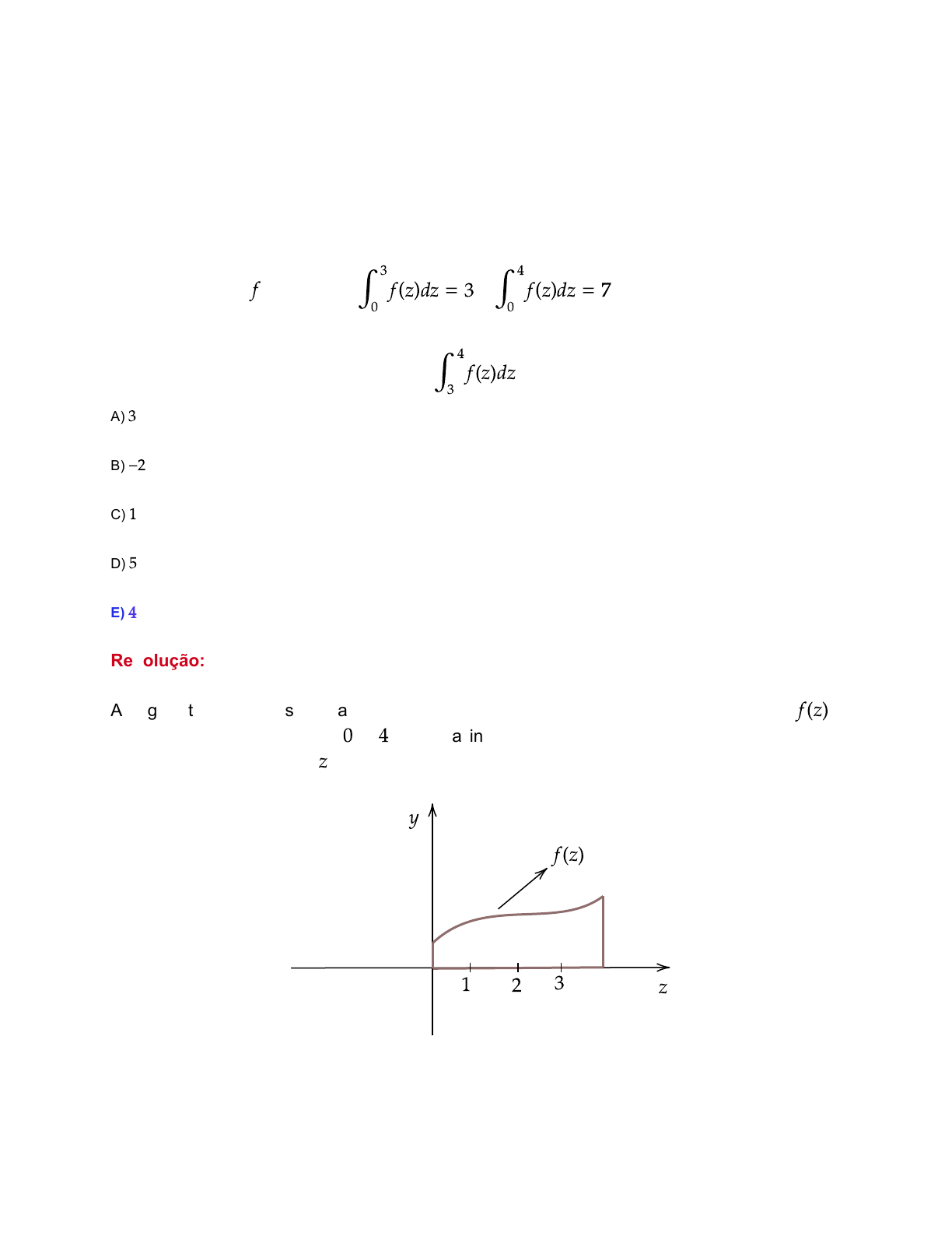 Tiago Lima - Instagram: @professor_disciplinas_exatas / WhatsAPP: (71) 9927-17449 Visite meu perfil e/ou meu grupo no site Passei Direto, confira mais questões ou deixe alguma no grupo para ser resolvida: Perfil - https://www.passeidireto.com/perfil/tiago-pimenta/ Grupo - https://www.passeidireto.com/grupos/109427150/publicacoes 4) Considere que é contínua, e e, posteriormente, calcule:f f z dz = 3 3 0 ∫ ( ) f z dz = 7 4 0 ∫ ( ) f z dz 4 3 ∫ ( ) A) 3 B) -2 C) 1 D) 5 E) 4 Resolução: A seguir, temos um esquema que mostra como é o comportamento de uma função , f z( ) entre os pontos de abicissa e , como a integral gera valores positivos no intervalo, a 0 4 função está acima do eixo ; z 40 z y 1 2 3 Área f z( ) As integrais representam áreas abaixo da curva e acima do eixo , logo, a integral de a é z 0 4 a área abaixo da curva entre esses 2 ponto da função e o eixo , da mesma forma, a intgeral z antre e é a área abaixo da curva entre esses 2 pontos, dessa forma, temos que:0 3 Com isso, podemos concluir que o valor da integral entre a é a diferença entre as 2 3 4 integrais dadas, a que representa a área maior menos a que representa a área menor, ou seja; f z dz = f z dz - f z dz = 7 - 3 4 3 ∫ ( ) 4 0 ∫ ( ) 3 0 ∫ ( ) f z dz = 4 4 3 ∫ ( ) 40 z y 1 2 3 f z dz = 7 4 0 ∫ ( ) 40 z1 2 3 f z dz = 3 3 0 ∫ ( ) Área Área y (Resposta )