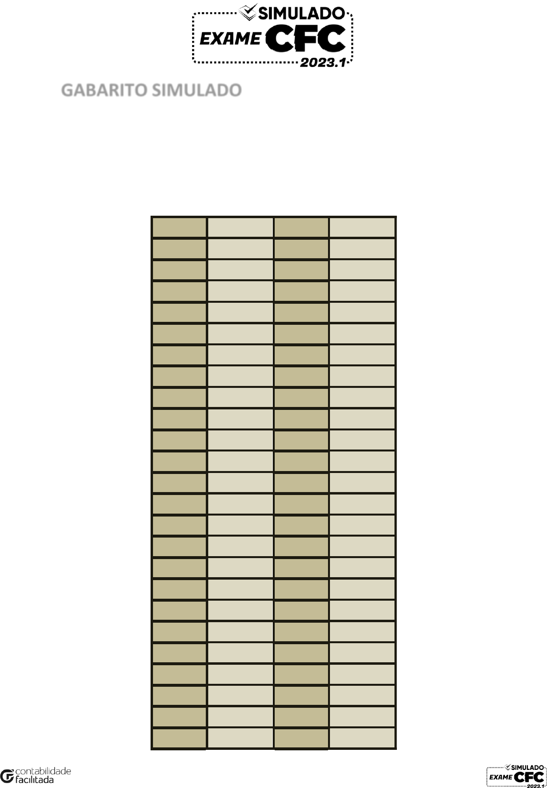 GABARITO SIMULADO EXAME DE SUFICIÊNCIA COMO REQUISITO PARA OBTENÇÃO DE REGISTRO PROFISSIONAL EM CONSELHO REGIONAL DE CONTABILIDADE (CRC) As questões com # foram anuladas; As questões em negrito tiveram a alternativa de resposta alterada; As demais permaneceram inalteradas. SIMULADO CFC DE A A Z (TIPO 01 – BRANCA) 01 D 26 C 02 D 27 A 03 A 28 D 04 B 29 B 05 B 30 D 06 D 31 B 07 D 32 D 08 D 33 B 09 C 34 A 10 # 35 A 11 C 36 C 12 A 37 B 13 D 38 C 14 C 39 B 15 D 40 D 16 C 41 D 17 B 42 C 18 D 43 A 19 D 44 D 20 D 45 C 21 A 46 C 22 A 47 C 23 # 48 D 24 A 49 # 25 C 50 A