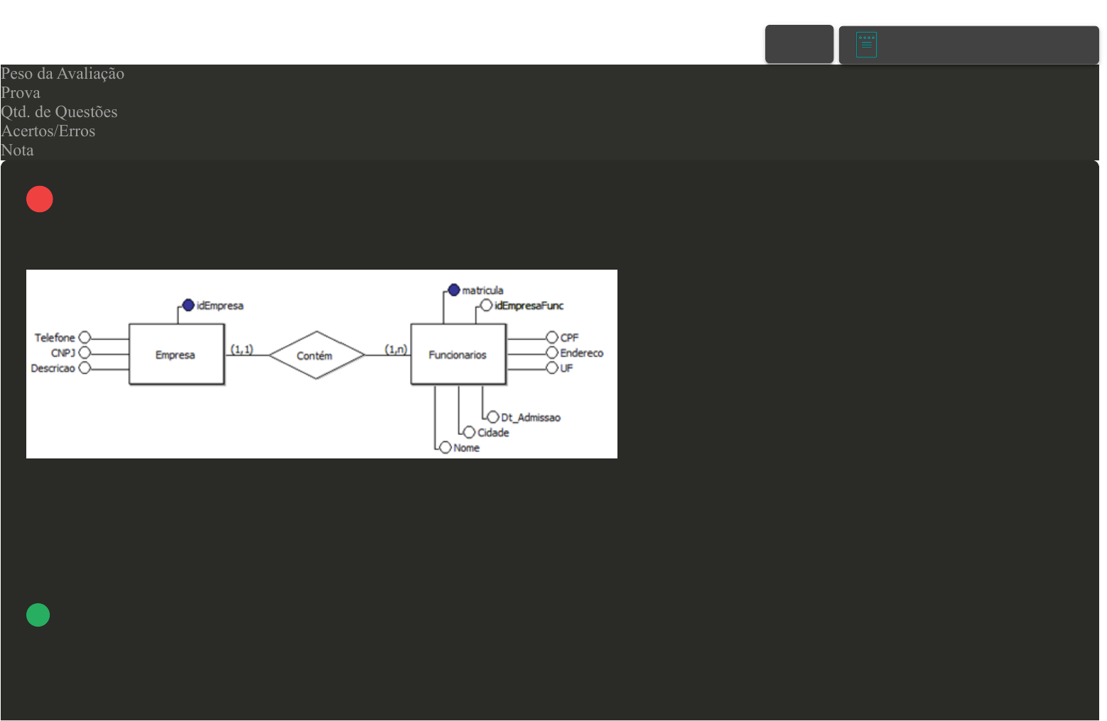 Prova Impressa GABARITO | Avaliação I - Individual (Cod.:828865) Peso da Avaliação 1,50 Prova 62214083 Qtd. de Questões 10 Acertos/Erros 9/1 Nota 9,00 O DER (Diagrama Entidade e Relacionamento) facilita ainda a comunicação entre os integrantes da equipe, pois oferece uma linguagem comum utilizada tanto pelo analista, responsável por levantar os requisitos, e os desenvolvedores, responsáveis por implementar aquilo que foi modelado. A partir do contexto, analise o DER e as sentenças a seguir: I- O exemplo do DER tem como tabelas: Empresa e Funcionários. II- O atributo idEmpresaFunc (tabela Funcionários) não faz sentido pois não há necessidade de saber a qual empresa o funcionário pertence. III- Os atributos idEmpresa e matrícula são chaves em suas respectivas tabelas. IV- O relacionamento entre as tabelas Empresa e Funcionários é de Um para Muitos. Assinale a alternativa CORRETA: Fonte: DEVmedia. MER e DER: Modelagem de Bancos de Dados. Disponível em: https://bit.ly/2wr1t8C. Acesso em: 25 out. 2018. A I, III e IV, apenas. B II, III e IV, apenas. C IV, apenas. VOLTAR A+ Alterar modo de visualização 1 D I e III, apenas. Analise o relacionamento a seguir: Considerando o relacionamento apresentado, classifique V para as sentenças verdadeiras e F para as falsas: ( ) A cardinalidade é um para muitos. ( ) O relacionamento entre Transportadora e Nota fiscal é do tipo ternário. ( ) Nesse relacionamento, temos duas entidades: Transportadora e Nota fiscal. ( ) A cardinalidade mínima é 0 (zero) quando uma ocorrência se relaciona com (no mínimo) nenhuma outra entidade. Assinale a alternativa que apresenta a sequência CORRETA: A V - F - V - V. B F - V - V - V. C F - F - V - F. D V - F - F - V. Os SGBDs mais conhecidos do mercado têm sua estrutura baseada no modelo de dados relacional, mas conheceremos os modelos que antecederam o mesmo sendo o hierárquico e de rede e, um conceito mais atual, o de Orientado a Objetos. Banco de Dados é basicamente um sistema computadorizado de manutenção de registros; em outras palavras, é um sistema computadorizado cuja finalidade geral é armazenar informações e permitir que os usuários busquem e atualizem essas informações quando solicitar. O Modelo de Dados Relacionais teve sua origem pensando na necessidade de aumentar a independência dos SGBDs, seu princípio é focado em armazenamento e recuperação de dados. Sobre o Modelo Relacional, assinale a alternativa CORRETA: A Um conjunto de relações entre objetos representados por seus dados. 2 3 B Uma coleção de tabelas para representar os dados e as relações entre eles. C Uma tabela de relações de acesso para determinados usuários. D Uma coleção de modelos de bancos de dados com hierarquias relacionais de usuários. Para um sistema de Banco de Dados aplicado numa média e complexa atividade, existe um grande número de pessoas envolvidas, desde o projeto até a manutenção propriamente dita. Com relação ao exposto e baseando-se nos papéis assumidos pelos usuários de SGBDs, assinale a alternativa CORRETA que contemple o grupo de pessoas que não interagem diretamente com os bancos de dados, e sim com as aplicações criadas pelos desenvolvedores de software: Fonte: CABRERA, J. Quem são os usuários de um SGBD?. 2014. Disponível em: https://bit.ly/2C7K4J9. Acesso em: 13 jul. 2020. (adaptado) A Usuários finais. B Usuário de banco de dados. C Desenvolvedor de SGBD. D DBA. Uma transação é uma sequência de operações executadas como uma única unidade lógica de trabalho. ACID é um conceito que se refere às quatro propriedades de transação de um sistema de banco de dados: Atomicidade, Consistência, Isolamento e Durabilidade. Considerando as propriedades de ACID, classifique V para as sentenças verdadeiras e F para as falsas: 4 5 ( ) Durabilidade diz respeito à conclusão de uma transação, caso uma transação tenha sido finalizada com sucesso, seus dados deverão estar armazenados corretamente. ( ) Atomicidade tem como pressuposto que a transação seja executada por completo ou não seja executado nada. ( ) O isolamento transacional proporciona que o resultado de uma sequência de execuções tenha o resultado diferente entre uma e outra execução. ( ) Consistência refere-se ao estado do dado armazenado, este deve estar de modo conciso e imutável seguindo exclusivamente as regras de negócio do sistema implementado sem restrições. Assinale a alternativa que apresenta a sequência CORRETA: A V - V - V - V. B V - V - F - F. C V - F - V - F. D F - V - V - F. Em um Sistema Gerenciador de Banco de Dados (SGBD), o DBA (Administrador de Banco de Dados) determina o controle de acesso do usuário, seus privilégios em relação ao sistema e áreas com permissão de acesso e trabalho, mantendo sob controle as ações dos colaboradores. Com relação ao controle de usuários em uma aplicação, classifique V para as sentenças verdadeiras e F para as falsas: ( ) Ao criar uma aplicação, o DBA pode criar um usuário com privilégios para criar tabelas, procedures, functions, entre outros objetos. ( ) Não é permitido utilizar uma tabela de usuários para controlar os acessos ao sistema pela própria aplicação, sendo que o SGBD já tem um gerenciamento de usuários. ( ) O DBA não permite que a aplicação crie objetos na base de dados, sendo que ele tem a reponsabilidade de garantir a integridade do SGBD. ( ) As senhas dos usuários na aplicação sempre são controlados pelos SGBDs.Assinale a alternativa que apresenta a sequência CORRETA: A F - V - F - V. B V - V - F - F. C V - F - V - V. D V - F - F - F. 6 Uma tendência da evolução comum é sempre focar em realizar as ações com maior rapidez, com mais velocidade para o usuário. Contudo, na evolução dos BDs deve-se pensar em outros fatores antes da velocidade. Os pilares devem ser garantidos antes de se focar na velocidade, sendo eles: a Atomicidade, o Isolamento, a Consistência e a Durabi