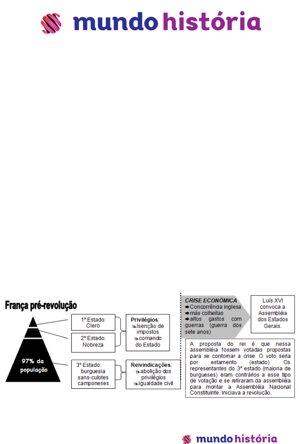 Página 1 com Prof. Bussunda IDADE MODERNA Revolução Francesa A Revolução Francesa é um dos grandes acontecimentos históricos que marcaram a superação do feudalismo pelo capitalismo. É, tradicionalmente, utilizada para assinalar o início da idade contemporânea. Liderado pela burguesia, o movimento contou com a participação de vários grupos sociais: a população miserável das cidades, os pequenos produtores e comerciantes, os camponeses explorados pela servidão, etc. Ao final do longo processo revolucionário, destruindo a decadente estrutura do Antigo regime, a burguesia chegou ao poder e acabou com o privilégio de nascimento da nobreza. Mas, em seu lugar, colocou o privilégio social do dinheiro, da conquista de riquezas econômicas. A França pré-revolução A França de 1789 ainda vivia com muitos aspectos do Feudalismo, como a sociedade Estamental (dividida em 03 estamentos ou estados), os privilégios do clero e da nobreza, que além de terem isenção da maioria dos impostos, o clero e a nobreza concentravam a propriedade de mais de 50% das terras, submetendo econômica e politicamente a ampla maioria da população (97%), com o apoio do regime absolutista de governo. Página 2 com Prof. Bussunda “Em todos esses levantes (contra as forças absolutistas) destacou-se a figura de Napoleão Bonaparte, jovem militar brilhante e habilidoso. Necessitando garantir- se e consolidar a República burguesa contra as ameaças internas, os girondinos desfecharam um golpe contra o Diretório, com Bonaparte a frente, no chamado golpe do 18 brumário (9 de novembro de 1799). O diretório foi substituído por uma nova forma de governo, o Consulado, constituído por três representantes: Napoleão, o abade Sieyès e Roger Ducos. O poder, na realidade, concentrou-se nas mãos de Napoleão, que ajudou a consolidar as conquistas burguesas da revolução.” VICENTINO, Cláudio e DORIGO, Gianpaolo. História Para o Ensino Médio. Editora Saraiva. EXTRA: Mulheres na Revolução formação dos Estados foi certamente distinta na Europa, na América Latina, na África e na Ásia. Os Estados atuais, em especial na América Latina — onde as instituições das populações locais existentes à época da conquista ou foram eliminadas, como no caso do México e do Peru, ou eram frágeis, como no caso do Brasil —, são o resultado, em geral, da evolução do transplante de instituições europeias feito pelas metrópoles para suas colônias. Na África, as colônias tiveram fronteiras arbitrariamente traçadas, separando etnias, idiomas e tradições, que, mais tarde, sobreviveram ao processo de descolonização, dando razão para conflitos que, muitas vezes, têm sua verdadeira origem em disputas pela exploração de recursos naturais. Na Ásia, a colonização europeia se fez de forma mais indireta e encontrou sistemas políticos e administrativos mais sofisticados, aos quais se superpôs. Hoje, aquelas formas anteriores de organização, ou pelo menos seu espírito, sobrevivem nas organizações políticas do Estado asiático. (GUIMARÃES, S. P. Nação, nacionalismo, Estado. Estudos Avançados. São Paulo: EdUSP, v. 22, n.º 62, jan.- abr. 2008 - adaptado). EXTRA: A Conjuração dos iguais O descontentamento da população de Paris e a sobrevivência do jacobinismo levaram a diversas mobilizações no país. Em 1796, um grupo de jacobinos, liderados por Graco Babeuf, estruturou um programa que defendia o fim da propriedade privada e a igualdade social radical, fundando a chamada Conjuração dos Iguais. Posteriormente o movimento foi considerado pré-socialista por causa da defesa radical da igualdade. E busca de apoio popular, o grupo publicou o manifesto dos iguais, em varias regiões, para a instalação de uma insurreição que derrubasse o Diretório. A conspiração foi denunciada e todos foram presos e guilhotinados. NOGUEIRA, Fausto Henrique Gomes e CAPELLARI, Marcos Alexandre. História, 2° ano Ensino Médio. Edições SM, 2010. Página 3 com Prof. Bussunda TESTES DE VESTIBULAR 1. (ENEM 2004) Algumas transformações que antecederam a Revolução Francesa podem ser exemplificadas pela mudança de significado da palavra “restaurante”. Desde o final da Idade Média, a palavra restaurant designava caldos ricos, com carne de aves e de boi, legumes, raízes e ervas. Em 1765 surgiu, em Paris, um local onde se vendiam esses caldos, usados para restaurar as forças dos trabalhadores. Nos anos que precederam a Revolução, em 1789, multiplicaram-se diversos restaurateurs, que serviam pratos requintados, descritos em páginas emolduradas e servidos não mais em mesas coletivas e mal cuidadas, mas individuais e com toalhas limpas. Com a Revolução, cozinheiros da corte e da nobreza perderam seus patrões, refugiados no exterior ou guilhotinados, e abriram seus restaurantes por conta própria. Apenas em 1835, o Dicionário da Academia Francesa oficializou a utilização da palavra restaurante com o sentido atual. A mudança do significado da palavra restaurante ilustra a) a ascensão das classes populares aos mesmos padrões de vida da burguesia e da nobreza. b) a apropriação e a transformação, pela burguesia, de hábitos populares e dos valores da nobreza. c) a incorporação e a transformação, pela nobreza, dos ideais e da visão de mundo da burguesia. d) a consolidação das práticas coletivas e dos ideais revolucionários, cujas origens remontam à Idade Média. e) a institucionalização, pela nobreza, de práticas coletivas e de uma visão de mundo igualitária. 2. (ENEM 2009) Hoje em dia, nas grandes cidades, enterrar os mortos é uma prática quase íntima, que diz respeito apenas à família. A menos, é claro, que se trate de uma personalidade conhecida. Entretanto, isso nem sempre foi assim. Para um historiador, os sepultamentos são uma fonte de informações importantes para que se compreenda, por exemplo, a vida política das sociedades. No que se refere às pr