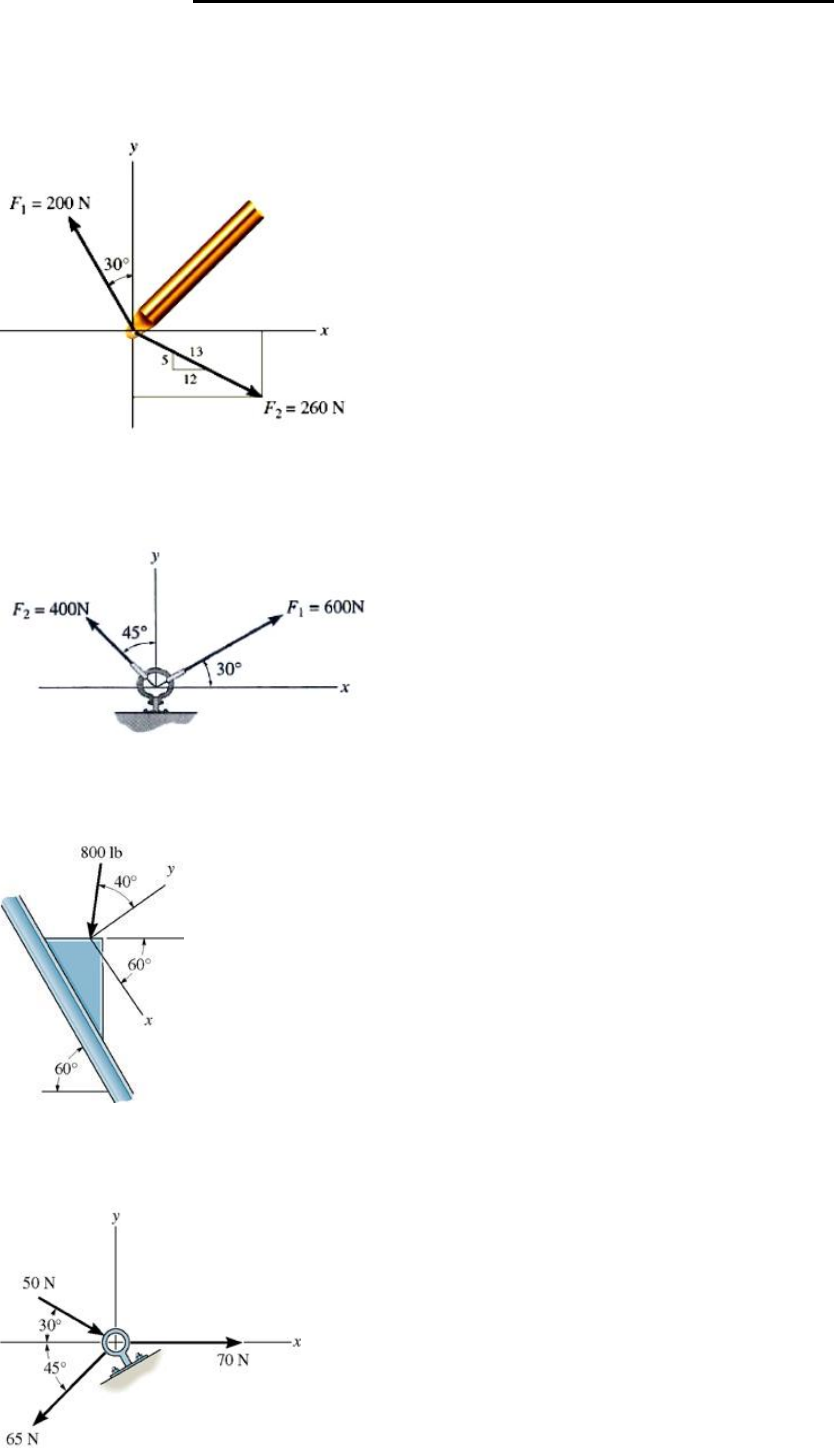 1 Lista 1 – Mecânica Geral – Vetores cartesianos 1 (Exemplo 2.5, pág. 27, Hibbeler, 10ª Ed.) Determine as componentes x e y das forças F1 e F2 que atuam sobre a lança mostrada na Figura. Expresse cada força como um vetor cartesiano. Encontre o vetor cartesiano força resultante FR, seu módulo e a direção que ele aponta. Resp.: FR = 157,98 N e = 27,60°. 2 (Exemplo 2.6, pág. 28, Hibbeler, 10ª Ed.) O elo da Figura abaixo está submetido a duas forças F1 e F2. Determine a intensidade e a orientação da força resultante FR. Resp.: FR = 629,07 N e = 67,89°. 3 (Problema 2.31, pág. 30, Hibbeler, 10ª Ed.) Determine os componentes x e y da força de 800 lb da imagem abaixo. Resp.: Fx = 514,2 lbf; Fy = -612,8 lbf. 4 (Problema 2.32, pág. 30, Hibbeler, 10ª Ed.) Determine a intensidade da força resultante e sua direção, medida no sentido horário a partir do eixo x positivo. Resp.: FR = 97,8 N; = -46,5°. 2 5 (Problema 2.34, pág. 30, Hibbeler, 10ª Ed.) Determine a intensidade da força resultante e sua direção, medida no sentido anti-horário a partir do eixo x positivo. Resp.: FR = 545,84 N; = 252,6°. 6 (Problema 2.35 e 2.36, pág. 31, Hibbeler, 10ª Ed.) a) Três forças atuam sobre o suporte da Figura abaixo. Determine a intensidade e a direção θ de F1, de modo que a força resultante seja orientada ao longo do eixo x’ positivo e tenha intensidade de 1 kN. b) Se F1 = 300 N e θ = 20°, determine a intensidade e a direção, medida no sentido anti-horário, a partir do eixo x’, da força resultante das três forças que atuam sobre o suporte. Resp.: a) = 36,97°; F1 = 889 N. b) FR = 716,47 N; = 37,1°. 7 (Problema 2.37 e 2.38, pág. 31, Hibbeler, 10ª Ed.) a) Determine a intensidade e a direção θ de F1, de modo que a força resultante seja orientada verticalmente para cima e tenha intensidade de 800 N. b) Determine a intensidade e a direção, medida no sentido anti-horário, a partir do eixo x, da força resultante das três forças que atuam sobre o anel A. Considere que F1 = 500 N e θ = 20°. Resp.: a) = 29,1°; F1 = 274,7 N. b) FR = 1,03 kN; = 87,9°. 3 8 (Problema 2.39 e 2.40, pág. 31, Hibbeler, 10ª Ed.) a) Expresse F1 e F2 como vetores cartesianos. b) Determine a intensidade da força resultante e sua direção, medida no sentido anti-horário, a partir do eixo x positivo. Resp.: FR = 25,1 kN; = 184,57°. 9 (Problema 2.43 e 2.44, pág. 20, Hibbeler, 10ª Ed.) a) Determine a intensidade e a orientação θ de FB, de modo que a força resultante seja orientada ao longo do eixo y positivo e tenha intensidade de 1500 N. b) Determine a intensidade e a orientação, medida no sentido anti-horário, a partir do eixo y positivo, da força resultante que atua sobre o suporte, se FB = 600 N e θ = 20°. Resp.: a) = 68,6°; FB = 959,9 N. b) FR = 839 N; = 14,8°. 10 (Exemplo 2.1, pág. 16, Hibbeler, 10ª Ed.) O parafuso tipo gancho da Figura 2.10a está sujeito a duas forças F1 e F2. Determine a intensidade (módulo) e a direção (ângulo à partir do eixopositivo de x) da força resultante FR. Resp.: FR = 212,55 N e = 54,76°. 4 11 (Problema 2.3, pág. 20, Hibbeler, 10ª Ed.) Determine a intensidade da força FR = F1 + F2 e sua direção, medida no sentido anti-horário, a partir do eixo x positivo. Resp.: FR = 393,19 lb e = 352,89°. 12 (Problema 2.51, pág. 29, Hibbeler, 12ª Ed.) Se F1 = 150 N e = 30°, determine a intensidade da força resultante que atua sobre o suporte e sua direção medida no sentido horário a partir do eixo positivo x. Resp.: FR = 390,8 N, = -16,4°. 13 (Problema 2.52, pág. 29, Hibbeler, 12ª Ed.) Se a intensidade da força resultante que atua sobre o suporte deve ser 450 N direcionada ao longo do eixo u positivo, determine a intensidade de F1 e sua direção . Resp.: F1 = 473,6 N, = 10,9°. 14 (Problema 2.53, pág. 29, Hibbeler, 12ª Ed.) Se a força resultante que atua sobre o suporte precisa ser mínima, determine as intensidades de F1 e da força resultante. Considere = 30°. Resp.: F1 = 57,85 N, FR = 379,8 N. Figura para os problemas 2.51/52/53