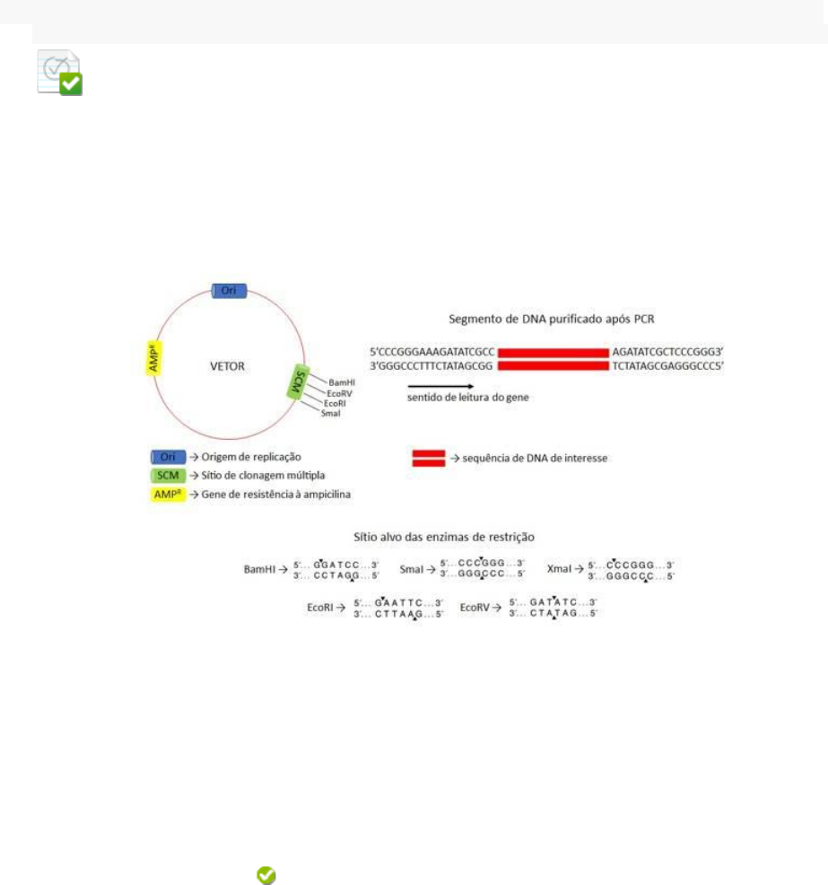 Curso BIOENGENHARIA E BIOTECNOLOGIA APLICADA A BIOMEDICINA Teste QUESTIONÁRIO UNIDADE I Iniciado 07/04/23 10:46 Enviado 08/04/23 15:13 Status Completada Resultado da tentativa 5 em 5 pontos Tempo decorrido 28 horas, 26 minutos Resultados exibidos Todas as respostas, Respostas enviadas, Respostas corretas, Comentários, Perguntas respondidas incorretamente Pergunta 1 0,5 em 0,5 pontos Você deseja clonar um segmento de DNA recém-purificado de uma PCR, em um vetor específico – ambos representados na imagem a seguir. As sequências das extremidades do segmento purificado da PCR estão representadas pelas letras que constituem as bases dos nucleotídeos do DNA. Assim, é possível analisar qual enzima de restrição é a mais adequada para dar continuidade com o processo de clonagem. Admita que em seu laboratório você possui disponível apenas as enzimas de restrição listadas: BamHI, EcoRI, EcoRV, SmaI e XmaI. A partir das informações e do seu conhecimento sobre o assunto, determine qual alternativa apresenta a enzima de restrição adequada para você dar segmento com seu experimento de clonagem, considerando que você deseja controlar a posição de inserção do fragmento, respeitando o sentido de leitura do gene e que você irá utilizar a mesma enzima de restrição para digerir o inserto e o vetor. Nas alternativas estão apontados os sítios de reconhecimento de cada enzima de restrição. Resposta Selecionada: d. XmaI. Respostas: a. BamHI. b. EcoRI. c. SmaI. d. XmaI. e. EcoRV. Comentário da resposta: Alternativa: D Comentário: a enzima de restrição XmaI reconhece a mesma sequência da enzima SmaI (presente no vetor), porém cliva em sítio diferente. A clivagem mediada por XmaI deixa extremidades coesivas e garante a posição de inserção do segmento de interesse, garantido que o sentido de leitura do gene será respeitado. A utilização das enzimas SmaI ou EcoRV, as únicas cujos sítios de reconhecimento são encontrados tanto no inserto quanto no vetor, não seriam adequadas, pois deixam extremidades cegas e não garantem o sentido de inserção do segmento de interesse. As enzimas EcoRI e BanHI não apresentam sítio de reconhecimento na sequência de interesse, apenas no vetor, desta forma, ambas não poderiam ser usadas para deixar extremidades coesivas no inserto. Pergunta 2 0,5 em 0,5 pontos Qual das seguintes estratégias seria a mais adequada para purificação de uma mistura contendo proteínas de tamanhos distintos? Resposta Selecionada: c. Cromatografia em gel filtração. Respostas: a. Cromatografia de afinidade. b. Cromatografia de troca catiônica. c. Cromatografia em gel filtração. d. Cromatografia de troca aniônica. e. Cromatografia por interação hidrofóbica. Comentário da resposta: Alternativa: C Comentário: considerando que as proteínas da mistura apresentam tamanhos diferentes, a cromatografia em gel filtração é a alternativa mais adequada. Nela, a fase estacionária é constituída por resina contendo esferas com orifícios. As proteínas de menor tamanho (menor massa) penetram dentro dos orifícios das esferas que funcionam como obstáculos. Desta forma, o fluxo dessas proteínas menores pela coluna cromatográfica é mais lento, quando comparado com o fluxo de proteínas maiores, que por sua vez não são atrasadas pelos obstáculos (são grandes demais para passar pelos orifícios das esferas). Assim, é possível coletar em diferentes momentos da purificação as proteínas de tamanhos distintos. Pergunta 3 0,5 em 0,5 pontos Um pesquisador deseja clonar a sequência codificante de um gene de 540 pb a jusante (downstream) do promotor (200 pb) de um vetor, para subsequente expressão e purificação da proteína de interesse. Assim, o gene foi isolado como fragmento da ação da enzima de restrição SmaI (o sítio de reconhecimento dessa enzima é CCC↓GGG / a seta indica sítio de clivagem) e clonado no sítio SmaI do vetor localizado imediatamente a jusante do promotor. A sequência do gene contém um único sítio para enzima de restrição EcoRI localizada 70 pb a jusante do códon iniciador. A representação esquemática do plasmídeo a seguir indica a localização dos sítios de reconhecimento de algumas enzimas de restrição no vetor e a posição de inserção do gene de interesse. O pesquisador avaliou as colônias obtidas no processo de clonagem por meio da digestão do material com as duas enzimas de restrição HindIII e EcoRI. Qual dos seguintes padrões de digestão com essas duas enzimas de restrição representa o clone com perfil desejado pelo pesquisador para os experimentos de superexpressão? Resposta Selecionada: a. ~270 pb + ~470 pb + o restante da estrutura vetor. Respostas: a. ~270 pb + ~470 pb + o restante da estrutura vetor. b. ~740 pb + ~70 pb + o restante da estrutura vetor. c. ~200 pb + o restante da estrutura vetor. d. ~810 pb + o restante da estrutura vetor. e. ~200 pb + 540 pb + o restante da estrutura vetor. Comentário da resposta: Alternativa: A Comentário: ao clivar o vetor contendo o inserto com as duas enzimas de restrição, teremos: (1) um fragmento correspondendo ao promotor (200 pb) mais 70 pb do gene, produzido pela clivagem com a HindIII a montante (upstream) do promotor e pela clivagem com a EcoRI presente dentro do gene (70 pb a início do códon iniciador) e (2) outro fragmento de 470 pb correspondente à clivagem nos sítios EcoRI dentro do gene (a 70 pb do início da transcrição) e EcoRI a jusante final do gene. Pergunta 4 0,5 em 0,5 pontos Leia e analise as proposições. I- CRISPR é um acrônimo da língua inglesa das palavras repetições palindrômicas curtas agrupadas e regularmente interespaçadas (clustered regularly interspaced short palindromic repeat). II- O operon CRISPR contém fragmentos de DNA viral provenientes de infecções prévias sofridas por organismos procariontes. Os cientistas descobriram que ele faz parte de um mecanismo de defesa de bactérias, sen