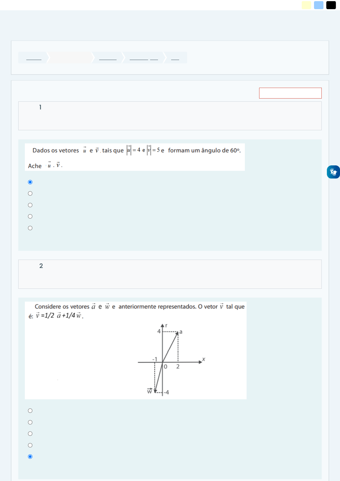Painel Meus cursos N690E1 AVALIAÇÃO A1P Questão 1 Ainda não respondida Vale 0,50 ponto(s). Questão 2 Ainda não respondida Vale 0,50 ponto(s). a. 10 b. 1 c. 12 d. 3 e. -5 Limpar minha escolha a. (–6, 7/4) b. (– 7/4, 6) c. (–2, 3) d. (6, –7/4) e. (3/4, 1) Limpar minha escolha Tempo restante 1:35:18 Tamanho da fonte A- A A+ Cor do site R A A A https://moodle.universo.edu.br/my/ https://moodle.universo.edu.br/course/view.php?id=1288 https://moodle.universo.edu.br/course/view.php?id=1288#section-3 https://moodle.universo.edu.br/mod/quiz/view.php?id=17202 Questão 3 Ainda não respondida Vale 0,50 ponto(s). Questão 4 Ainda não respondida Vale 0,50 ponto(s). Questão 5 Ainda não respondida Vale 0,50 ponto(s). a. 1/2 b. -1/2 c. 0 d. 1 e. -1 Limpar minha escolha Uma circunferência de raio 2, localizada no primeiro quadrante, tangente o eixo x e a reta de equação 4x – 3y = 0. Então, a abscissa do centro dessa circunferência é: a. 3 b. 4 c. 2 d. 1 e. 5 Limpar minha escolha a. b. c. d. e. Limpar minha escolha Tamanho da fonte A- A A+ Cor do site R A A A Questão 6 Ainda não respondida Vale 1,50 ponto(s). Questão 7 Ainda não respondida Vale 0,50 ponto(s). A equação reduzida da reta é obtida quando: Quando isolamos y na equação geral. a. P(- 1, 1) b. P(0, 1) c. P(0, - 1) d. P(1, 0) e. P( - 1, 0) Limpar minha escolha Tamanho da fonte A- A A+ Cor do site R A A A Questão 8 Ainda não respondida Vale 0,50 ponto(s). Questão 9 Ainda não respondida Vale 0,50 ponto(s). a. 6y = x b. y = 6x c. 2y = x d. 2 e. y = 3x Limpar minha escolha a. -1 b. 0 c. 7 d. e. 3 Limpar minha escolha Tamanho da fonte A- A A+ Cor do site R A A A Questão 10 Ainda não respondida Vale 1,50 ponto(s). Quando a equação Segmentária de uma reta é obtida: Quando os pontos em que elaintercepta os eixos coordenados são conhecidos. Atividade anterior ◄ A1F Seguir para... Próxima atividade A2F ► Tamanho da fonte A- A A+ Cor do site R A A A https://moodle.universo.edu.br/mod/quiz/view.php?id=17200&forceview=1 https://moodle.universo.edu.br/mod/quiz/view.php?id=17203&forceview=1