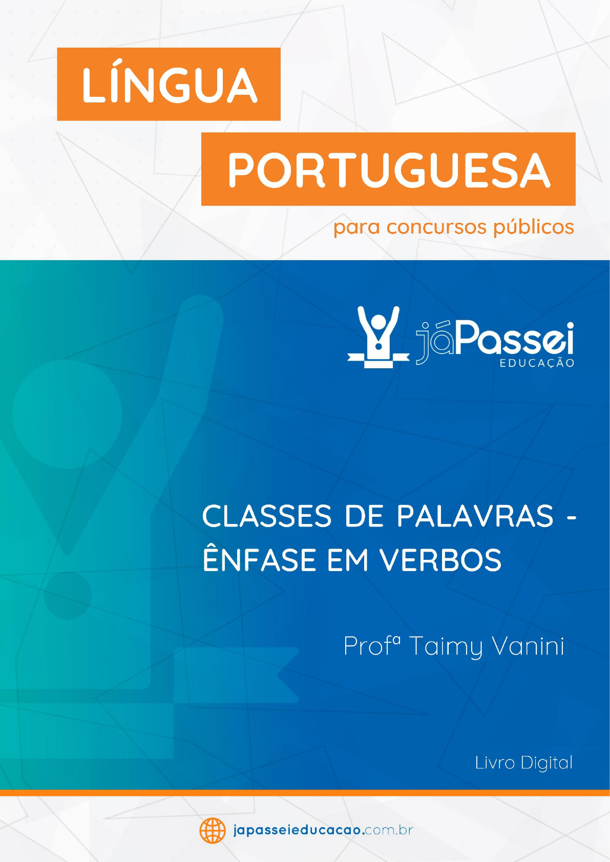 1 www.japasseieducacao.com.br LÍNGUA PORTUGUESA – CLASSES DE PALAVRAS - VERBOS PROFESSORA TAIMY VANINI Patrícia Simone Gomes de Paula - patriciadepaula01@gmail.com - IP: 45.184.143.21 http://www.japasseieducacao.com.br/ 2 www.japasseieducacao.com.br LÍNGUA PORTUGUESA – CLASSES DE PALAVRAS - VERBOS PROFESSORA TAIMY VANINI TAIMY VANNI Graduada em Letras – Português/ Inglês em 2011, atua na área de educação desde o segundo semestre da faculdade, contando com mais de 12 anos de experiência em sala de aula. Com concursos e vestibulares, a jornada iniciou em 2014, trabalhando como professora de Inglês na plataforma Ari de Sá. Atualmente, é professora de Língua Portuguesa e Redação no JáPassei Educação e comenta questões no Estratégia Concursos. Olá, professor (a)! O estudo dos verbos é essencial àqueles que se preparam para um concurso. É necessário ter em mente que é a partir do conhecimento dos verbos que será possível entender outros conteúdos de Língua Portuguesa, como crase, concordância verbal, regência verbal, entre outros. Isso ocorre porque são os verbos que guiam as análises da Língua Portuguesa – por exemplo, não adianta entender que a crase ocorre depois de certos verbos se não for possível identificar o verbo. No entanto, para concursos públicos o estudo dessa classe de palavras é bastante diferente daquele que se tem na escola. Isso porque, o foco não será necessariamente as conjugações verbais, mas sim as correlações e interpretações – o que o verbo significou naquela passagem e como um verbo se relaciona a outro dentro de uma oração. Além da interpretação e correlação, há também outras questões importantes sobre verbos nos concursos, como as seguintes: Singulares e plurais, forma correta de se escrever alguns verbos e entendimento sobre alguns tempos específicos. Todos os conteúdos serão vistos e acompanhados por várias dicas aplicadas a tipos de questões específicas cobradas pelas bancas. Antes de adentrar no conteúdo, observe alguns números que exprimem a importância dos verbos para quem estuda para concursos de Professor de Educação Básica: Foram analisadas provas para os cargos de Professor I e Professor de Educação Infantil dos anos de 2019 a 2022 e encontraram-se as seguintes informações sobre Língua Portuguesa geral e conhecimento e utilização de verbos: INVESTIGAÇÃO JÁPASSEI Patrícia Simone Gomes de Paula - patriciadepaula01@gmail.com - IP: 45.184.143.21 http://www.japasseieducacao.com.br/ 3 www.japasseieducacao.com.br LÍNGUA PORTUGUESA – CLASSES DE PALAVRAS - VERBOS PROFESSORA TAIMY VANINI A Língua Portuguesa fez parte de todos os editais, sendo a Interpretação textual o item de maior relevância na disciplina - ocupando 26,2% na parte destinada à Língua Portuguesa e 9,8% na totalidade da avaliação. Os aspectos relacionados aos verbos - Flexão verbal de modo, tempo, número e pessoa, ao todo representam cerca de 4% da avaliação de Língua Portuguesa e 1,6% da prova completa. Desses, a flexão de modo - Indicativo, Subjuntivo e Imperativo - é o conteúdo de maior relevância, ocupando cerca de 1,5% das parte de Português. A Concordância verbal ocupa em média 3,7% da parte destinada à Língua Portuguesa e 2,5% na totalidade da avaliação; Já a Regência Verbal representa 1,1% da prova de Língua Portuguesa e 0,4% da totalidade da avaliação. O advérbios - conteúdo também relacionado aos verbos, ocupam 1,1% da prova de Língua Portuguesa; A crase e a Colocação de pronomes - conteúdos entendidos a partir dos verbos, surgem, respectivamente, ocupando 1,1% e 2,6% da avaliação de Língua Portuguesa. Entende-se, por meios dos dados, que os verbos não apenas são necessários em relação à sua grande relevância nas avaliações, mas também pelo seu entendimento ser essencial para que outros conteúdos de relevância possam ser esclarecidos. Patrícia Simone Gomes de Paula - patriciadepaula01@gmail.com - IP: 45.184.143.21 http://www.japasseieducacao.com.br/ 4 www.japasseieducacao.com.br LÍNGUA PORTUGUESA – CLASSES DE PALAVRAS - VERBOS PROFESSORA TAIMY VANINI O VERBO COMO CLASSE DE PALAVRAS A classe de palavras verbo é uma das maiores e mais variáveis, apresentando flexão de número e de pessoa. Verbos representam três situações dentro de uma oração – ações, estados ou fenômenos naturais. Observe as orações a seguir: Levantei e fiz pudim às quatro da madrugada porque perdi o controle da minha vida. Carlos está desesperado com o edital do concurso, pois é muito ansioso. Amanheceu, choveu e anoiteceu em questão de minutos. As palavras em negrito, apesar de pertencerem a mesma classe, representam ideias diferentes. Levantei/perdi são verbos de ação. Esses verbos representam mudanças, coisas que estavam de um jeito e ficaram de outro. Verbos de ação são os mais numerosos e comuns. Está/é são verbos de ligação. Esses verbos representam estados ou simplesmente ligam um sujeito a uma qualidade. São bem poucos: ser, estar, continuar, parecer, permanecer, andar (no sentido de estar). Amanheceu/choveu/anoiteceu são chamados de fenômenos naturais. Para quem tem dificuldade em encontrar os verbos nas orações, lembre-se de que eles normalmente vêm após um pronome – as chamadas pessoas (1° eu/ 2° tu/ 3° ele/ 1° nós/ 2° vós/ 3° eles), ou após o nome de alguém ou de algo. A análise básica dos verbos consiste em três tópicos: Modo, tempo e voz. AS TRÊS CONJUGAÇÕES VERBAIS Conjugações representam as variações que os verbos sofrem em relação ao tempo e ao modo. Porém, antes de se ocuparem daquelas extensas tabelas (eu estudo, tu estudas, ele estuda...), é necessário observar que existe uma base: Todos os verbos, em sua forma mais básica, terminam em AR, ER ou IR, que respectivamente são a primeira, segunda e terceira conjugação. CLASSES DE PALAVRAS – ÊNFASE EM VERBOS Patrícia Simone Gomes de Paula - 
