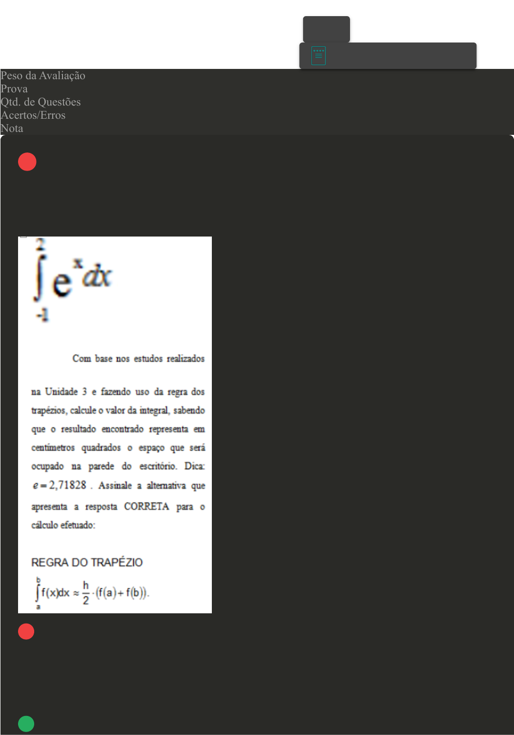 08/04/2023, 20:34 Avaliação Final (Objetiva) - Individual about:blank 1/6 Prova Impressa GABARITO | Avaliação Final (Objetiva) - Individual (Cod.:823210) Peso da Avaliação 3,00 Prova 61632148 Qtd. de Questões 12 Acertos/Erros 6/6 Nota 6,00 O proprietário de uma fábrica de móveis, pensando em divulgar sua marca, mandou que um dos funcionários cortasse um pedaço de tábua e construísse o símbolo da empresa. Cumprindo a ordem, o funcionário entregou ao patrão o símbolo confeccionado e, quando perguntado qual era o espaço em centímetros quadrados que seria ocupado na parede, o colaborador apresentou a seguinte integral definida: Assinale a alternativa CORRETA: A O valor numérico da integral definida é 11,60. B O valor numérico da integral definida é 10,60. C O valor numérico da integral definida é 10,64. D O valor numérico da integral definida é 11,64. VOLTAR A+ Alterar modo de visualização 1 08/04/2023, 20:34 Avaliação Final (Objetiva) - Individual about:blank 2/6 A equação de 1º grau é aquela que possui incógnita com grau 1. Equações são sentenças matemáticas abertas expressas por uma igualdade. Resolvendo a equação 2y + 27 - y = 22, qual a solução encontrada? A y = - 5 B y = 6 C y = 8 D y = 10 Historicamente, as primeiras equações diferenciais foram as relativas à aceleração igual ou desigual, que Galileu Galilei pôde medir, ainda que com métodos geométricos. Em seguida, Newton e Leibniz introduziram o cálculo diferencial e, neste último, as equações diferenciais como as conhecemos hoje, envolvendo as derivadas de uma função. Sobre quando podemos classificar as equações diferenciais em ordinárias, assinale a alternativa CORRETA: A Quando sua equação não possui expoente. B Quando possuem mais de uma variável independente. C Quando têm apenas uma variável independente. D Quando é necessário integrar. Consideremos uma função f e um intervalo [a, b] para o qual f é contínua em todos os pontos do intervalo e f(a)·f(b) < 0. Qual o método que consiste em dividir o intervalo [a, b] ao meio sistematicamente até que, para um dado ε > 0, o critério de parada seja satisfeito? Assinale a alternativa CORRETA: A Método da Gauss. B Método da bissecção. C Método da ordem de convergências. D Método simples. 2 3 4 08/04/2023, 20:34 Avaliação Final (Objetiva) - Individual about:blank 3/6 A linguagem computacional é uma das principais aplicações dos números binários, assim como no conjunto dos números decimais, em que podemos definir operações de soma, subtração, multiplicação e divisão no conjunto dos números binários. Os números binários têm base 2, portanto dois algarismos 0 e 1 e, logo temos as seguintes igualdades: A V - F - F - F. B F - F - V - F. C F - V - V - V. D F - V - V - F. A regressão linear consiste na obtenção de uma função que tenta explicar a variação e a relação entre a variável dependente e a(s) variável(is) independente(s). Sobre as regressões lineares simples e múltipla, classifique V para as sentenças verdadeiras e F para as falsas: ( ) A regressão linear simples é aplicada quando a função f depende de apenas uma variável. ( ) A regressão linear múltipla é aplicada quando a função f depende de duas ou mais variáveis. ( ) Ao contrário da regressão linear simples, a regressão linear múltipla apresenta como resultado uma equação de segundo grau. ( ) Tanto a regressão linear simples como a múltipla são casos particulares do método de interpolação. Assinale a alternativa que apresenta a sequência CORRETA: A V - F - V - F. 5 6 08/04/2023, 20:34 Avaliação Final (Objetiva) - Individual about:blank 4/6 B F - F - V - V. C V - V - F - F. D F - V - F - V. Interpolação linear é uma ramificação da matemática que se caracteriza por uma função linear (polinômio de primeiro grau), a qual representa em resultados aproximados uma função f(x). Considerando a tabela a seguir e considerando a função linear como f(x)= ax+b, qual o valor estimado de f (1,8)? Assinale a alternativa CORRETA: A f(1,8) = 7,2 B f(1,8) = 6,8 C f(1,8) = 7,8 D f(1,8) = 7,4 A equação de 1º grau é aquela que possui incógnita com grau 1. Equações são sentenças matemáticas abertas expressas por uma igualdade. Resolvendo a equação 2y + 30 - y = 22, qual a solução encontrada? A y = - 8 B y = - 6 C y = - 10 D y = 8 É sabido que à medida que o material radioativo emite partícula sua massa diminui. Em um laboratório, os cientistas estão medindo essa variação da massa do material radioativo com relação ao tempo. Supondo que os dados obtidos são os da Tabela 1, qual a função que melhor aproxima os pontos da tabela se usarmos o método da regressão linear? 7 8 9 08/04/2023, 20:34 Avaliação Final (Objetiva) - Individual about:blank 5/6 Assinale a alternativa CORRETA: A f(x) = - 0,61 x + 4,15 B f(x) = - 0,61 + 4,15 x C f(x) = 0,61 + 1,1 x D f(x) = 0,61 x + 1,1 As expressões algébricas que se formam a partir da união de duas ou mais variáveis e constantes, relacionadas através de operações de multiplicação, subtração ou adição, recebem o nome de polinômios. Dado o polinômio P (x) = 0,5x² - 4x -1, determine o seu valor para x igual a 0,5. Com base no exposto, assinale a alternativa CORRETA: A O valor do polinômio é 2,375. B O valor do polinômio é -1,875. C O valor do polinômio é -2,875. D O valor do polinômio é 2,125. 10 08/04/2023, 20:34 Avaliação Final (Objetiva) - Individual about:blank 6/6 (ENADE, 2014) Em uma loja de material escolar, as mercadorias caneta, lápis e borracha, de um único tipo, cada uma, são vendidas para três estudantes. O primeiro comprou uma caneta, três lápis e duas borrachas pagando R$ 10,00; o segundo adquiriu duas canetas, um lápis e uma borracha pagando R$ 9,00; o terceiro comprou três canetas, quatro lápis e três borrachas pagando R$ 19,00. Os estudantes, após as compras, sem verificarem os valores de