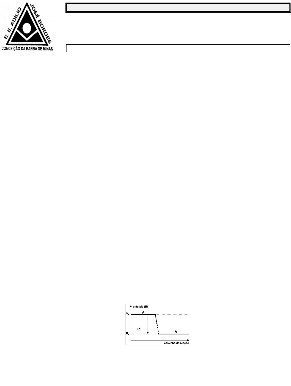 Boa Sorte! 1. (UNITAU) Nas pizzarias há cartazes dizendo "Forno à lenha". A reação que ocorre deste forno para assar a pizza é: a) explosiva. b) exotérmica. c) endotérmica. d) higroscópica. e) catalisada. 2. (UEL-PR) Considere as seguintes entalpias de formação em kJ/mol: Aℓ2O3(s) = - 1670 e MgO(s) = - 604 Com essas informações, pode-se calcular a variação da entalpia da reação representada por 3 MgO(s) + 2 Aℓ(s) → 3 Mg (s) + Aℓ2O3(s) Seu valor é igual a: 3. Veja a entalpia-padrão de formação em Kl/mol e a 25°C, de algumas substâncias: CH4= -74,8 CHCl(3)= -134,5 HCl= -92,0 Ao realizar a reação de cloração do metano, qual será a variação de entalpia? CH4 + 3Cl → CHCl3 + 3HCl 4- (UFRRJ) Desde a pré-história, quando aprendeu a manipular o fogo para cozinhar seus alimentos e se aquecer, o homem vem percebendo sua dependência cada vez maior das várias formas de energia. A energia é importante para uso industrial e doméstico, nos transportes, etc. Existem reações químicas que ocorrem com liberação ou absorção de energia, sob a forma de calor, denominadas, respectivamente, como exotérmicas e endotérmicas. Observe o gráfico a seguir e assinale a alternativa correta: Gráfico de uma reação exotérmica a) O gráfico representa uma reação endotérmica. b) O gráfico representa uma reação exotérmica. c) A entalpia dos reagentes é igual à dos produtos. d) A entalpia dos produtos é maior que a dos reagentes. e) A variação de entalpia é maior que zero. Exercício Avaliativo - Valor: 5,0 Pontos Professor: Lucas Nascimento Série: 2° ano Turma: Data: Bimestre: 1° Nota: Disciplina: Química Conteúdo da Avaliação: Termoquímica Aluno (a): nº: Boa Sorte! 5- Dado o gráfico: Gráfico de entalpia de uma reação genérica Para uma reação genérica representada pela equação: A → B Qual será o valor da variação de entalpia do processo? 6- (FePeCS-DF) O metanol é um líquido, inflamável e perigoso, que apresenta efeito tóxico no sistema nervoso, particularmente no nervo óptico. Essa substância pode ser preparada através da hidrogenação controlada do monóxido de carbono, em uma reação que se processa sob pressão e em presença de um catalisador metálico. Com base na tabela de calores-padrão de formação a seguir, calcule a variação da entalpia do processo. CO + H2 → CH3OH Calcule a variação de entalpia no processo citado acima e construa o gráfico de reação.