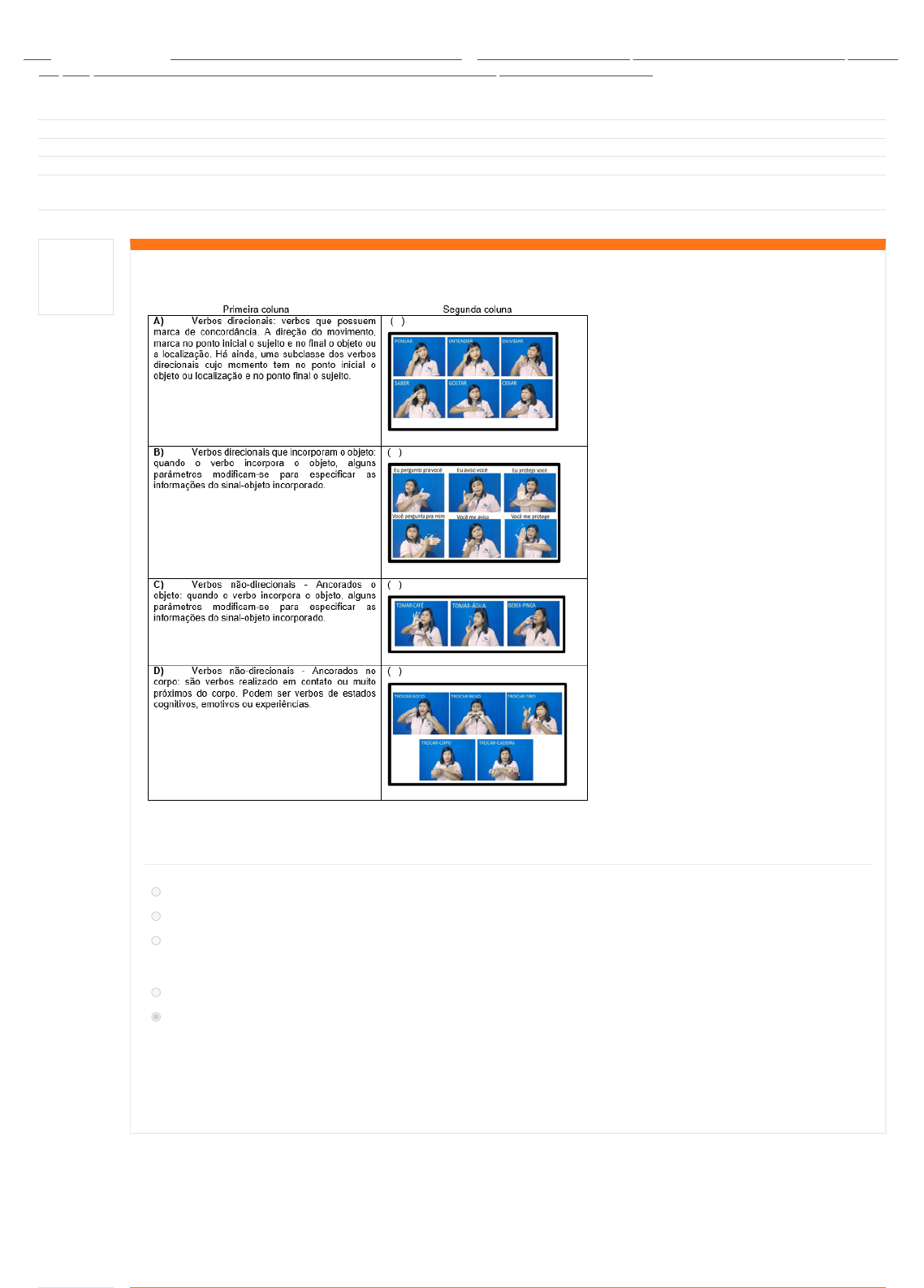 Questão 1 Correto Atingiu 0,60 de 0,60 Iniciado em domingo, 9 abr 2023, 15:51 Estado Finalizada Concluída em domingo, 9 abr 2023, 17:13 Tempo empregado 1 hora 21 minutos Avaliar 4,80 de um máximo de 6,00(80%) Sobre os tipos de verbos na Libras, relacione a primeira coluna com a segunda coluna. Marque a alternativa correta: a. A, D, B, C b. B, A, C, D c. D, C, A, B d. C, B, D, A e. D, A, C, B Sua resposta está correta. A resposta correta é: D, A, C, B Painel / Minhas Disciplinas / LICENCIATURA EM LETRAS - PORT INGLÊS EAD-1223- LIBRAS / PROVA CURRICULAR - REALIZAÇÃO DIA 06/04/2023 A 09/04/2023 - VALOR 6,0 PONTOS / CLIQUE AQUI PARA REALIZAR A PROVA CURRICULAR - DIA 06/04/2023 A 09/04/2023 - VALOR 6,0 PONTOS - 1ª OPORTUNIDADE https://www.eadunifatecie.com.br/course/view.php?id=13951 https://www.eadunifatecie.com.br/my/ https://www.eadunifatecie.com.br/course/view.php?id=13951 https://www.eadunifatecie.com.br/course/view.php?id=13951#section-12 https://www.eadunifatecie.com.br/mod/quiz/view.php?id=426316 Questão 2 Correto Atingiu 0,60 de 0,60 Questão 3 Correto Atingiu 0,60 de 0,60 Campello (2008) afirma que as representações, associadas com as expressões faciais do narrador ou sujeito surdo, completam e acabam qualificando o signo visual em sinal. Para ela, existem várias representações que podem ser vistas como “termômetro” para dar sentido ou dar o valor de tamanho ou de forma. Quais opções abaixo correspondem às representações destacadas pela autora? Escolha a alternativa correta: a. Entonação da voz, emissor e receptor, classificadores, movimentos oculares b. Papel do olhar, entonação da voz, movimento das sobrancelhas, movimentos da testa c. Apontação, uso de pronomes, movimentos da cabeça, uso de sinais icônicos d. Movimentos da face direita ou da esquerda puxando os lábios para cima ou para baixo, uso da datilologia, uso de sinais arbitrários, uso de mímicas e. Papel do olhar, movimento dos lábios, estufar das bochechas, movimentos da cabeça Sua resposta está correta. A resposta correta é: Papel do olhar, movimento dos lábios, estufar das bochechas, movimentos da cabeça Observe as opções: I - Classificador de nome e número: observam-se aspectos tais como: som, tamanho, textura, paladar, tato, cheiro, “olhar”, sentimentos ou formas visuais, bem como a localização e a ação incorporada ao classificador. II - Classificador de elemento: é o classificador que descreve como uma ação acontece na realidade por meio da expressão corporal de seres animados III - Classificador do corpo: esses classificadores retratam movimentos de “elementos” ou coisas que não são sólidas, isto é, ar, fumaça, água/líquido, chuva, fogo, luz. IV - Classificador descritivo: esses classificadores utilizam as configurações das mãos do alfabeto manual ou os números, mas são parte de uma descrição. Marque a alternativa correta: a. Somente as alternativas I, III e IV estão corretas b. As alternativas I, II, III e IV estão corretas c. Somente as alternativas II e III estão corretas d. Somente as alternativas I, II e IV estão corretas e. As alternativas I, II, III e IV estão erradas Sua resposta está correta. A resposta correta é: As alternativas I, II, III e IV estão erradas Questão 4 Correto Atingiu 0,60 de 0,60 Questão 5 Correto Atingiu 0,60 de 0,60 Observe os sinais a seguir realizados pela professora e responda a que eles se referem: Escolha a alternativa correta: a. Os sinais se referem a ARCO-ÍRIS, CHUVA, VENTO, SOL, LUA, NUBLADO e NUVEM b. Os sinais se referem aos dias da semana c. Os sinais se referem aos numerais cardinais 1, 2, 3, 4, 5, 6, e 7 d. Os sinais se referem a ONTEM, ANTEONTEM, AMANHÃ, HOJE, JÁ, MANHÃ e AGORA e. Os sinais se referem aos meses JANEIRO, FEVEREIRO, MARÇO, ABRIL, MAIO, JUNHO e JULHO Sua resposta está correta. A resposta correta é: Os sinais se referem aos dias da semana Na estrutura icônica cada língua de sinais representa seus referentes, ainda que de forma icônica, convencionalmente porque cada uma vê os objetos, seres e eventos representados em seus sinais sob uma determinada ótica ou perspectiva. Quais palavras abaixo são exemplos de sinais icônicos na Libras? Escolha a alternativa correta: a. FEIO, TÍMIDO, MEDROSO, TRISTE, BORBOLETA, PASSEAR b. CARRO, CASA, TÍMIDO, ÁRVORE, TELEFONE, MEDROSO c. ÁRVORE, TELEFONE, CASA, CARRO, FEIO, POUCO d. ÁRVORE, TELEFONE, CASA, CARRO, BORBOLETA, POUCO e. FEIO, TÍMIDO, TELEFONE, CARRO, MEDROSO, TRISTE Sua resposta está correta. A resposta correta é: ÁRVORE, TELEFONE, CASA, CARRO, BORBOLETA, POUCO Questão 6 Correto Atingiu 0,60 de 0,60 Questão 7 Incorreto Atingiu 0,00 de 0,60 Sobre as modalidades comunicativas na Libras: I - Utiliza a estrutura da língua de sinais, que é a imagem do pensamento, usa corretamente os parâmetros e faz uso do processo anafórico. II - Não utiliza as regras da Língua de Sinais e é composto pela imagem mental, do objeto, pessoa, animal ou situação a ser descrita. Estamos falando de quais modalidades? Marque a alternativa correta: a. Oral e Sinalizada b. Gestual e Escrita c. Formal e Informal d. Bilíngue e Imagens e. Escrita e Sinalizada Sua resposta está correta. A resposta correta é: Formal e Informal De acordo com nossos estudos os cinco parâmetros (configuração de mão, ponto de articulação, movimento, orientação da mão e expressão facial/corporal) podem ser comparados a “pedacinhos” de um sinal, porque em muitos sinais, eles têm significados, são morfemas que se juntam ao radical do sinal em determinados contextos. Analise os sinais apresentados abaixo e nos diga em qual deles podemos observar que há intensificador na expressão facial/corporal. Marque a alternativa correta: a. CHOVER b. TRISTE c. TRABALHAR d. CARRO-ANDANDO e. BONIT@ muito Sua resposta está incorreta. A resposta correta é: BONIT@ muito Questão 8 Correto Atingiu 0,60 de 0,60 No vídeo que você assistiu “Vaca surda d