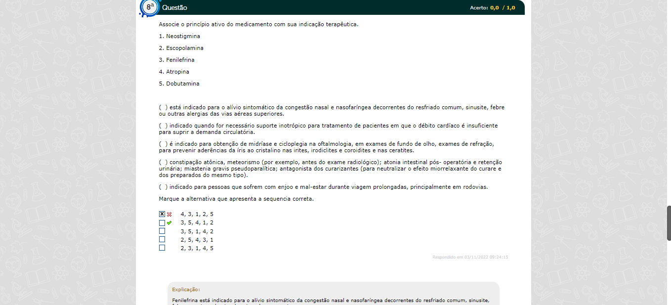 Associe princípio ativo do medicamento com sua indicação 1. Neostigmina 2. Escopolamina 3. Fenilefrina 4. Atropina 5. Dobutamina ( ) está indicado para alívio sintomático da congestão nasal e nasofaríngea decorrentes do resfriado comum, sinusite, febre ou outras alergias das vias aereas superiores. ( ) indicado quando for necessário suporte inotrópico para tratamento de pacientes em que débito cardíaco é insuficiente para suprir a demanda circulatória. ( ) é indicado para obtenção de midriase e cicloplegia na oftalmologia, em exames de fundo de olho, exames de refração, para prevenir aderências da iris ao cristalino nas irites, irodiclites e coroidites e nas ceratites. ( ) constipação meteorismo (por exemplo, antes do exame atonia intestinal pós- operatória e retenção miastenia gravis pseudoparalitica; antagonista dos curarizantes (para neutralizar efeito miorrelaxante do curare e dos preparados do mesmo tipo). ( ) indicado para pessoas que sofrem com enjoo e mal-estar durante viagem prolongadas, principalmente em rodovias. 4, 3, 1, 2, 5 3, 5, 4, 1, 2 3, 5, 1, 4, 2 2, 5, 4, 3, 1 2, 3, 1, 4, 5