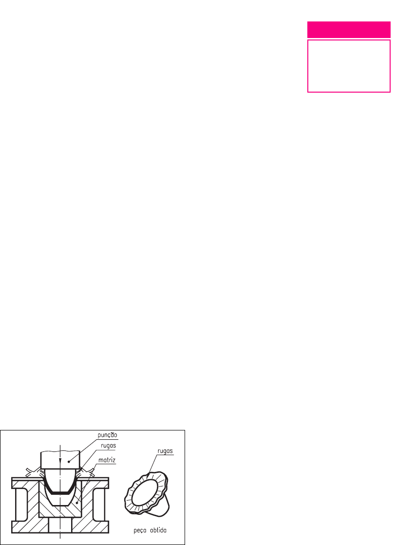 72 A U L A Nesta aula você vai saber o que é o processo de fabricação conhecido pelo nome de repuxorepuxorepuxorepuxorepuxo ou embutimentoembutimentoembutimentoembutimentoembutimento. Por meio dele é que são feitos utensílios domésticos de uso diário como bacias, canecas e panelas de alumínio. Você vai saber como funciona um estampo de repuxo e ter uma idéia geral do processo. Vamos lá ? Estampos de repuxo Repuxo é um processo de fabricação, pelo qual uma chapa metálica adquire forma volumétrica, oca, previamente definida. As ferramentas que executam esse trabalho têm as mesmas características dos estampos de corte e dobra. São formadas basicamente por um punção e uma matriz. Na figura a seguir, vemos uma ferramenta de repuxo simples, utilizada para a fabricação de um recipiente. Observe que o embutimento com esta ferramenta simples produz rugas na peça. Os estampos de repuxo simplesrepuxo simplesrepuxo simplesrepuxo simplesrepuxo simples têm custo mais baixo que outros estampos de repuxo. Eles são pouco usados devido à formação de rugas nas bordas durante a operação. Os estampos de repuxo mais elaborados possuem um sujeitadorsujeitadorsujeitadorsujeitadorsujeitador, também conhecido como prensa-chapasprensa-chapasprensa-chapasprensa-chapasprensa-chapas. Este dispositivo evita que as bordas, após repuxadas, apresentem rugas. Embora o custo seja mais elevado, são os tipos mais usados na operação de repuxar. Veja, a seguir, um exemplo de estampo com prensa-chapas. Repuxo 72 A U L A Nossa aula 72 A U L A O prensa-chapas tem a função de manter a chapa sob pressão para fazer com que ela deslize apenas para o interior da cavidade da matriz, sem formar rugas. Para evitar a formação de trincas ou fissuras, vários fatores devem ser observados: o cálculo do raio da matriz, a lubrificação do material da peça, a folga entre o punção e a matriz, a regulagem da pressão exercida pelo prensa-chapas etc. Ao terminar a operação de repuxo, a peça já moldada fica presa à matriz do estampo de repuxar devido à propriedade de recuperação elástica do material. Para que a peça se desloque da cavidade da matriz, existe um dispositivo chamado extratorextratorextratorextratorextrator, que tem a função de liberar a peça. Na figura ao lado vemos um estampo de repuxo com um extrator que possi- bilita a saída da peça pela parte inferior do estampo. Vemos, na figura ao lado, um estampo de repuxo com um extrator que possi- bilita a saída da peça pela parte superior do estampo. 72 A U L AFolga Quando se planeja fabricar uma peça pelo processo de repuxo, tem-se que levar em conta a folgafolgafolgafolgafolga que deve ser deixada entre o punção e a matriz de repuxo. Calcula-se a folga, representada pela letra grega minúscula delta (d) em função do tipo e da espessura do material a ser repuxado. A folga corresponde ao valor da espessura do material mais um coeficiente determinado empiricamente para grupos de materiais, como mostram as fórmulas a seguir. FÓRMULA GRUPOS DE MATERIAIS (CHAPAS) d = e + 0,07 aço d = e + 0,04 metais não ferrosos d = e + 0,02 alumínio d = e + 0,20 metais resistentes ao calor Por exemplo, para calcular a folga entre a matriz e o punção de um estampo que vai repuxar uma chapa de alumínio com 2 mm de espessura, basta substituir o valor da espessura na fórmula d = e + 0,02 . Deste modo: d = 2 + 0,02 Þ d = 2 + 0,09 Þ d = 2,09 mm Ou seja, como você vê na figura a seguir, a folga entre o punção e a matriz deve ser de 2,09 mm. Desse modo, evita-se o excesso de atrito, que provoca rachaduras e marcas na peça repuxada. A folga deve ser calculada de modo correto. Se houver erro de cálculo e a folga for menor que o necessário, o material repuxado tende a estirar-se, podendo até romper-se, como mostra a figura. 72 A U L A Se a folga for maior que o necessário, pode haver deformações no perfil. Se a folga for mal distribuída, pode ocorrer variação da altura. Entrada e saída de ar Para facilitar a saída de ar, durante o repuxo, é utilizado um punção provido de orifícios. Eles permitem a livre passagem do ar que se acha debaixo do punção quando ele desce sobre a matriz para moldar a peça e permitem a entrada de ar quando o punção retrocede. Estágios de uma operação de repuxo Muitas vezes, uma operação de repuxo durante a produção industrial necessita ser executada em etapas, por meio das quais o produto final vai se completando aos poucos. Quando não se consegue realizar o repuxo em uma única vez, porque a relação entre o diâmetro do embutimento final e o diâmetro da chapa, conhecido como blankblankblankblankblank, é muito grande, divide-se a operação em estágios até a peça tomar, aos poucos, sua forma final. A figura a seguir apresenta uma repre- sentação esquemática dos estágios de conformação de uma peça, por repuxo. deformação no perfil variação na altura 72 A U L AO número de operações necessárias para se obter um repuxo depende da severidade do repuxo b0 (lê-se beta zero). Severidade do repuxo (b0 ) é a relação entre o diâmetro do blank (D) e o diâmetro do punção (d), ou seja: b0 = , onde a menor severidade é maior que 1. A severidade máxima (b0 max) é a condição limite para determinar se o repuxo pode ser feito numa única operação. É função do tipo de material, da sua espessura (e) e do diâmetro interno (d) da peça a ser repuxada. Para calcular o b0 max usam-se as fórmulas a seguir: b0 MAX MATERIAIS (ADEQUADOS AO REPUXO) 2,15 - 0,001 ´ 2 - 0,0011 ´ Se a severidade do repuxo for menor ou igual à severidade máxima que o material suporta, é possível fazer a peça em uma única operação. Mas, se a severidade do repuxo for maior que a severidade máxima, será necessário dividir o processo em estágios. Em resumo: se b0 £ b0 max Þ uma operação de repuxo se b0 > b0 max Þ mais de uma operação de repuxo Procedimento de repuxar Se a peça 