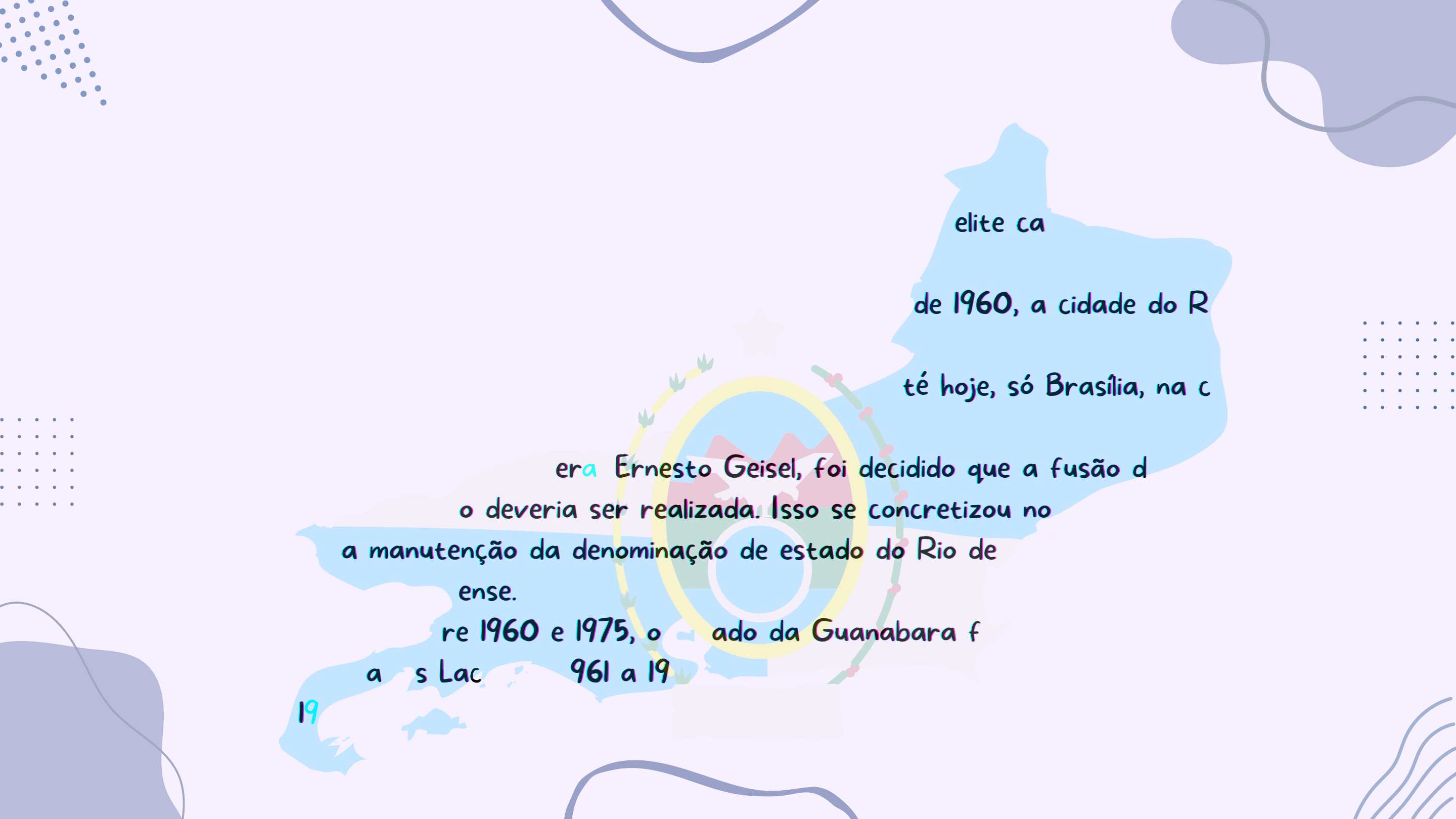 Resumo da história do estado da GuanabaraResumo da história do estado da GuanabaraResumo da história do estado da Guanabara A construção de Brasília representava uma queda nos interesses da elite carioca.A construção de Brasília representava uma queda nos interesses da elite carioca.A construção de Brasília representava uma queda nos interesses da elite carioca. O Rio deixaria de ser o centro das decisões políticas do Brasil.O Rio deixaria de ser o centro das decisões políticas do Brasil.O Rio deixaria de ser o centro das decisões políticas do Brasil. Com a definitiva mudança da capital para Brasília, em 21 de abril de 1960, a cidade do Rio de JaneiroCom a definitiva mudança da capital para Brasília, em 21 de abril de 1960, a cidade do Rio de JaneiroCom a definitiva mudança da capital para Brasília, em 21 de abril de 1960, a cidade do Rio de Janeiro tornou-se o estado da Guanabara.tornou-se o estado da Guanabara.tornou-se o estado da Guanabara. A Guanabara foi o único caso no Brasil de uma cidade-estado, até hoje, só Brasília, na condição deA Guanabara foi o único caso no Brasil de uma cidade-estado, até hoje, só Brasília, na condição deA Guanabara foi o único caso no Brasil de uma cidade-estado, até hoje, só Brasília, na condição de distrito federal teve um status parecido.distrito federal teve um status parecido.distrito federal teve um status parecido. Em 1974, durante a presidência do general Ernesto Geisel, foi decidido que a fusão dos estados daEm 1974, durante a presidência do general Ernesto Geisel, foi decidido que a fusão dos estados daEm 1974, durante a presidência do general Ernesto Geisel, foi decidido que a fusão dos estados da Guanabara e do Rio de Janeiro deveria ser realizada. Isso se concretizou no dia 15 de março de 1975.Guanabara e do Rio de Janeiro deveria ser realizada. Isso se concretizou no dia 15 de março de 1975.Guanabara e do Rio de Janeiro deveria ser realizada. Isso se concretizou no dia 15 de março de 1975. Também foi definida a manutenção da denominação de estado do Rio de Janeiro, com a cidade do RioTambém foi definida a manutenção da denominação de estado do Rio de Janeiro, com a cidade do RioTambém foi definida a manutenção da denominação de estado do Rio de Janeiro, com a cidade do Rio voltando a ser a capital fluminense.voltando a ser a capital fluminense.voltando a ser a capital fluminense. Nesse período de 15 anos, entre 1960 e 1975, o estado da Guanabara foi governada por José SetteNesse período de 15 anos, entre 1960 e 1975, o estado da Guanabara foi governada por José SetteNesse período de 15 anos, entre 1960 e 1975, o estado da Guanabara foi governada por José Sette Câmara Filho (1960), Carlos Lacerda (1961 a 1965), Negrão de Lima (1965 a 1970) e Antônio de PáduaCâmara Filho (1960), Carlos Lacerda (1961 a 1965), Negrão de Lima (1965 a 1970) e Antônio de PáduaCâmara Filho (1960), Carlos Lacerda (1961 a 1965), Negrão de Lima (1965 a 1970) e Antônio de Pádua Chagas Freitas – 1970 a 1975.Chagas Freitas – 1970 a 1975.Chagas Freitas – 1970 a 1975.