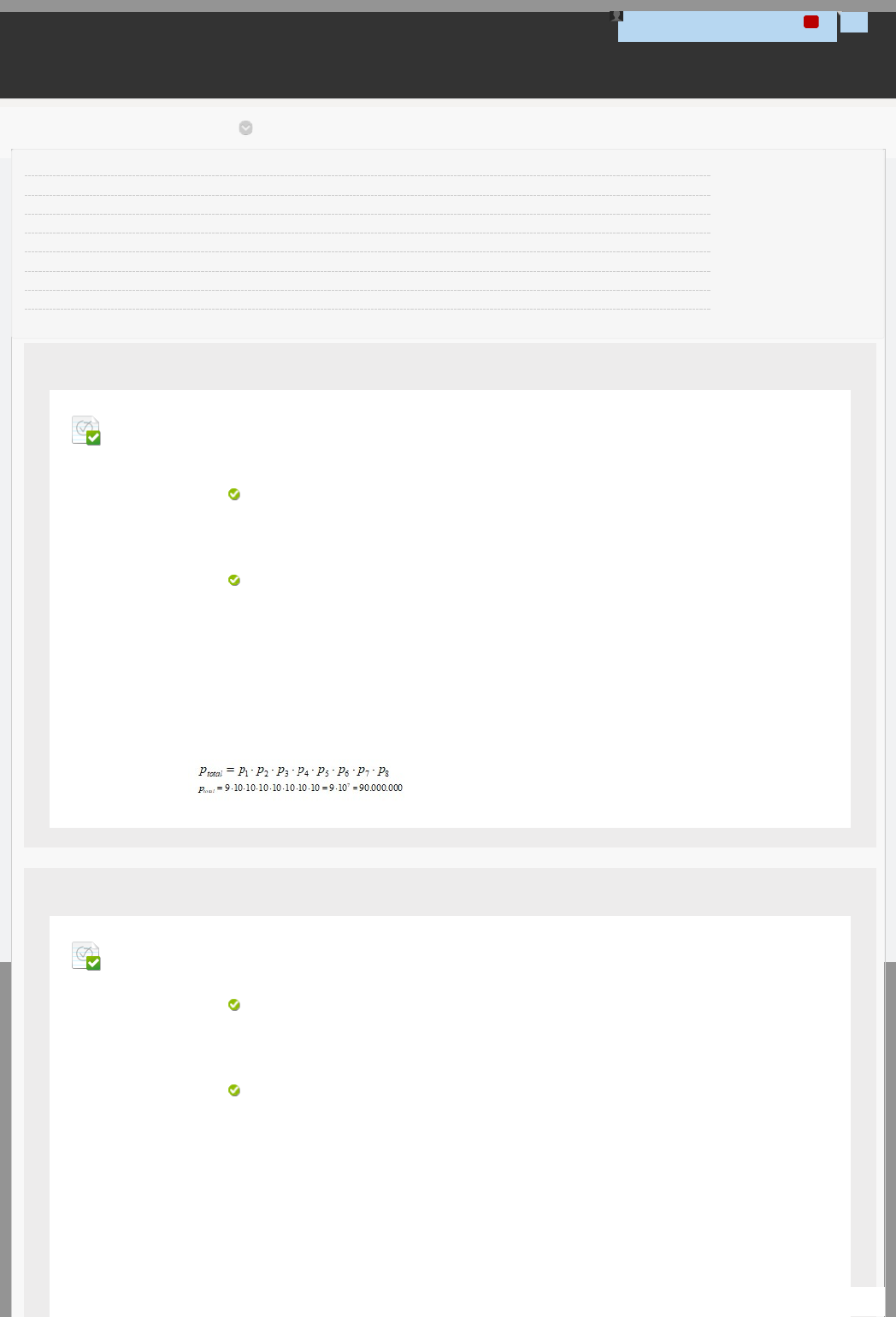 Revisar envio do teste: QUESTIONÁRIO UNIDADE IIIESTATÍSTICA 3066-60_54406_R_E1_20231 CONTEÚDO Usuário breno.marques4 @aluno.unip.br Curso ESTATÍSTICA Teste QUESTIONÁRIO UNIDADE III Iniciado 10/04/23 09:05 Enviado 10/04/23 09:07 Status Completada Resultado da tentativa 2,5 em 2,5 pontos Tempo decorrido 1 minuto Resultados exibidos Todas as respostas, Respostas enviadas, Respostas corretas, Comentários, Perguntas respondidas incorretamente Pergunta 1 Resposta Selecionada: c. Respostas: a. b. c. d. e. Comentário da resposta: (IBGP/2019 - adaptado) Os números de telefones �xos em Minas Gerais possuem oito dígitos e são compostos apenas por algarismos de 0 a 9. Sabe-se que esses números não podem começar com zero. Sendo assim, assinale a alternativa que apresenta corretamente o número máximo de telefones que podem ser instalados no estado. 90.000.000. 1.000.000. 9.000.000. 90.000.000. 100.000.000. 1.000.000.000. Resposta: C Comentário: cada número de telefone de MG terá 8 dígitos. Apenas o primeiro dígito (p1) tem uma restrição: não pode ser 0. Desse modo, há 9 possibilidades para p1, que são os algarismos de 1 a 9. Todos os outros dígitos (de p2 a p8) têm 10 possibilidades cada, já que podem ser compostos por algarismos de 0 a 9. O número total de possibilidades (ptotal), nesse caso, pode ser calculado pelo princípio fundamental da contagem, conforme exposto a seguir. Pergunta 2 Resposta Selecionada: c. Respostas: a. b. c. d. e. Comentário da resposta: (Furb/2021 - adaptado) Uma senha de 4 dígitos deve ser criada tendo como critério a utilização de algarismos ímpares não repetidos. Caso essa senha seja modi�cada mensalmente, utilizando esses critérios, será possível ter senhas diferentes por um período, em anos, igual a: 10. 2. 8. 10. 20. 16. Resposta: C Comentário: a senha deve ser composta por algarismos ímpares não repetidos. Os elementos disponíveis, nesse caso, são: 1, 3, 5, 7 e 9. Temos, portanto, 5 elementos disponíveis. Como a ordem dos algarismos importa para a composição da senha, estamos lidando com um arranjo simples. O arranjo de n elementos, tomados k a k, é dado pela seguinte expressão: UNIP EAD BIBLIOTECAS MURAL DO ALUNO TUTORIAIS breno.marques4 @aluno.unip.br17 CONTEÚDOS ACADÊMICOS 0,25 em 0,25 pontos 0,25 em 0,25 pontos ← OK Revisar envio do teste: QUESTIONÁRIO UNIDADE III – ... https://ava.ead.unip.br/webapps/assessment/review/r... 1 of 6 10/04/2023, 09:09 http://company.blackboard.com/ http://company.blackboard.com/ https://ava.ead.unip.br/webapps/portal/execute/tabs/tabAction?tab_tab_group_id=_10_1 https://ava.ead.unip.br/webapps/portal/execute/tabs/tabAction?tab_tab_group_id=_25_1 https://ava.ead.unip.br/webapps/portal/execute/tabs/tabAction?tab_tab_group_id=_27_1 https://ava.ead.unip.br/webapps/portal/execute/tabs/tabAction?tab_tab_group_id=_47_1 https://ava.ead.unip.br/webapps/portal/execute/tabs/tabAction?tab_tab_group_id=_29_1 https://ava.ead.unip.br/webapps/blackboard/execute/courseMain?course_id=_281764_1 https://ava.ead.unip.br/webapps/assessment/review/review.jsp?attempt_id=_92950887_1&course_id=_281764_1&content_id=_3342527_1&return_content=1&step=#contextMenu https://ava.ead.unip.br/webapps/blackboard/content/listContent.jsp?course_id=_281764_1&content_id=_3341715_1&mode=reset https://ava.ead.unip.br/webapps/blackboard/execute/courseMain?course_id=_281764_1 https://ava.ead.unip.br/webapps/blackboard/execute/courseMain?course_id=_281764_1 https://ava.ead.unip.br/webapps/blackboard/execute/courseMain?course_id=_281764_1 https://ava.ead.unip.br/webapps/blackboard/execute/courseMain?course_id=_281764_1 https://ava.ead.unip.br/webapps/blackboard/execute/courseMain?course_id=_281764_1 https://ava.ead.unip.br/webapps/blackboard/execute/courseMain?course_id=_281764_1 https://ava.ead.unip.br/webapps/blackboard/execute/courseMain?course_id=_281764_1 https://ava.ead.unip.br/webapps/assessment/review/review.jsp?attempt_id=_92950887_1&course_id=_281764_1&content_id=_3342527_1&return_content=1&step=#contextMenu https://ava.ead.unip.br/webapps/blackboard/content/listContent.jsp?course_id=_281764_1&content_id=_3341715_1&mode=reset https://ava.ead.unip.br/webapps/blackboard/content/listContent.jsp?course_id=_281764_1&content_id=_3341715_1&mode=reset https://ava.ead.unip.br/webapps/portal/execute/tabs/tabAction?tab_tab_group_id=_10_1 https://ava.ead.unip.br/webapps/portal/execute/tabs/tabAction?tab_tab_group_id=_10_1 https://ava.ead.unip.br/webapps/portal/execute/tabs/tabAction?tab_tab_group_id=_27_1 https://ava.ead.unip.br/webapps/portal/execute/tabs/tabAction?tab_tab_group_id=_27_1 https://ava.ead.unip.br/webapps/portal/execute/tabs/tabAction?tab_tab_group_id=_47_1 https://ava.ead.unip.br/webapps/portal/execute/tabs/tabAction?tab_tab_group_id=_47_1 https://ava.ead.unip.br/webapps/portal/execute/tabs/tabAction?tab_tab_group_id=_29_1 https://ava.ead.unip.br/webapps/portal/execute/tabs/tabAction?tab_tab_group_id=_29_1 https://ava.ead.unip.br/webapps/portal/execute/tabs/tabAction?tab_tab_group_id=_25_1 https://ava.ead.unip.br/webapps/portal/execute/tabs/tabAction?tab_tab_group_id=_25_1 https://ava.ead.unip.br/webapps/login/?action=logout https://ava.ead.unip.br/webapps/assessment/review/review.jsp?attempt_id=_92950887_1&course_id=_281764_1&content_id=_3342527_1&return_content=1&step=# https://ava.ead.unip.br/webapps/assessment/review/review.jsp?attempt_id=_92950887_1&course_id=_281764_1&content_id=_3342527_1&return_content=1&step=# https://ava.ead.unip.br/webapps/assessment/review/review.jsp?attempt_id=_92950887_1&course_id=_281764_1&content_id=_3342527_1&return_content=1&step=# https://ava.ead.unip.br/webapps/assessment/review/review.jsp?attempt_id=_92950887_1&course_id=_281764_1&content_id=_3342527_1&return_content=1&step=# Pergunta 3 Resposta Selecionada: b. Respostas: a. b. c. d. e. Comentário da resposta: (MS Concursos/2022 - adaptado) Com os algarismos 4, 5 e 6, podemos formar quantos números naturais com trê