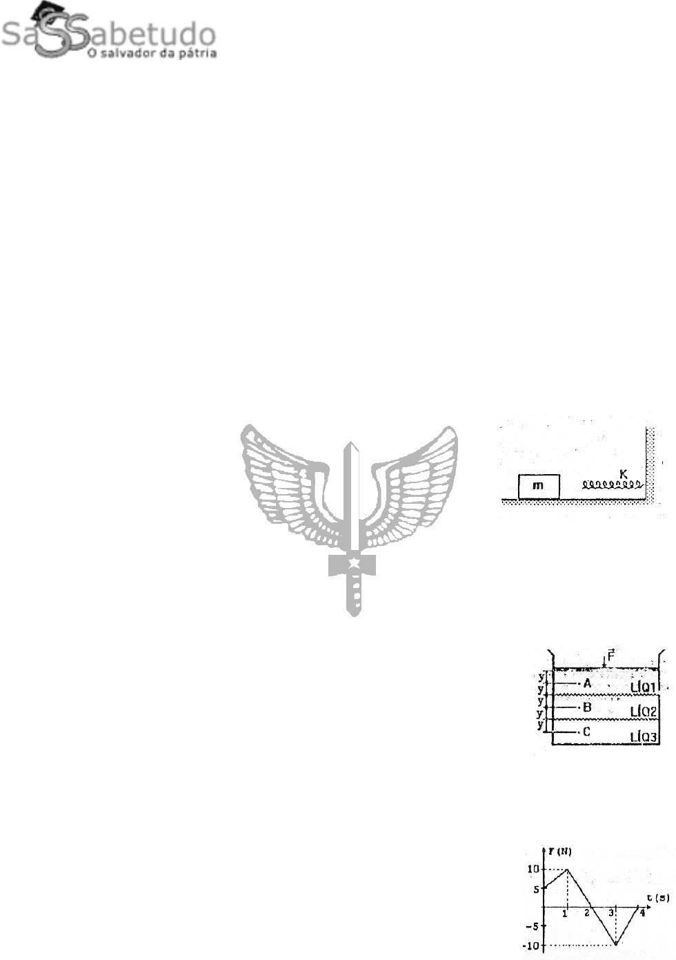 ACADEMIA DA FORÇA AÉREA PROVA DE FÍSICA – 1995 AFA – PROVA DE FÍSICA – 1995 .............................................................. www.sassabetudo.cjb.net sassabetudo@bol.com.br 1 01. Dois automóveis A e B deslocam-se com movimento retilíneo horizontal uniformemente variado, no mesmo sentido e, ao passarem por um sinal de trânsito, A ultrapassa B. Neste instante a velocidade e a aceleração valem, respectivamente; 12m/s e 4m/s2 para o automóvel A, e 6m/s e 6m/s2 para o automóvel B. O tempo, em segundos, decorrido até que B ultrapasse A e sua velocidade, em m/s, neste instante, valem, respectivamente: (A) 4 e 30 (B) 6 e 42 (C) 8 e 54 (D) 12 e 78 02. Um avião voando a 400 metros de altura em relação ao solo, com velocidade de 100m/s, lança uma bomba que atinge um alvo no topo de uma colina, a 155 metros de altura, também em relação ao solo. O tempo, em segundos, entre o lançamento e o impacto da bomba, e a distância, em metros, entre o avião e o alvo, no instante do lançamento, são respectivamente: (A) 4 e 400 (B) 7 e 700 (C) 8 e 800 (D) 10 e 1000 03. Um móvel desloca-se com movimento retilíneo horizontal segundo a função horária s = 50 + 15t – 5t2, onde s é medido em metros e t, em segundos. A posição, em metros, em que pára e o instante, em segundos, em que passa pela origem valem, respectivamente: (A) 50 e 1,5 (B) 50 e 3,0 (C) 61,25 e 1,5 (D) 61,25 e 5,0 04. Uma corda resiste a uma tensão de até 400N. A aceleração mínima para que uma pessoa de 50kg deslize corda abaixo, sem arrebentá-la, deve ser, em m/s2, de: (A) 2 (B) 4 (C) 8 (D) 10 05. Um canhão no topo de uma colina, a 125 metros do solo, dispara um projétil, com velocidade inicial v0 = 500m/s e inclinação de 60º em relação à horizontal. O alvo é um avião voando a 1250 metros de altura em relação ao solo, com velocidade v = 900km/h. O número de chances do projétil atingir o avião é: (A) zero (B) 1 (C) 2 (D) 3 06. Em um tubo de Pilot escoa ar de massa específica 1,0kg/m3. Se a diferença de pressão for 800P0, o valor da velocidade, em m/s, será: (A) 20 (B) 30 (C) 40 (D) 50 07. Numa expansão adiabática, a temperatura de três mols de gás perfeito diminui de 100K. O calor molar a volume constante do gás é igual a 20J/mol K. A quantidade de calor trocado com o ambiente, a variação da energia interna do gás e o trabalho realizado pelo gás durante o processo são, respectivamente, em Joules: (A) zero, -2000 e 2000 (B) 2000, zero e 2000 (C) zero, -6000 e 6000 (D) 6000, zero e 6000 08. Um bloco de massa m = 1kg desloca-se sobre um plano horizontal com atrito (μ = 0,2) e comprime a mola de constante elástica K = 205N/m. Se a máxima compressão da mola pela ação do bloco foi 0,2m, o trabalho, em joules, realizado pela força de atrito durante a compressão da mola a velocidade em m/s, no bloco no momento em que tocou a mola valem, respectivamente: (A) –0,4 e 3 (B) –0,04 e 2,86 (C) –0,4 e 2,86 (D) –0,04 e 3 09. Três líquidos não miscíveis que possuem massas específicas ℘1, ℘2 e ℘3, encontram-se em equilíbrio no interior de um tubo provido de êmbolo, que comprime a superfície livre do líquido 1, conforme a figura. Se a diferença de pressão entre os pontos C e B é o triplo da diferença de pressão entre os pontos B e A e se ℘1 = 0,6 g/cm3 e ℘2 = 0,8 g/cm3, a massa específica ℘3, do líquido 3, vale, em g/cm3, (A) 1,0 (B) 1,4 (C) 2,8 (D) 3,4 10. A força resultante atuando num corpo de massa 1kg, em repouso para t = 0s, é dada pelo gráfico. O valor da velocidade, em m/s, no instante t = 3s é: (A) 2,5 (B) 7,5. (C) 12,5 (D) 17,5 ACADEMIA DA FORÇA AÉREA PROVA DE FÍSICA – 1995 AFA – PROVA DE FÍSICA – 1995 .............................................................. www.sassabetudo.cjb.net sassabetudo@bol.com.br 2 11. Uma colisão unidimensional e totalmente inelástica, ocorre entre uma partícula de massa Xm e outra de massa m em repouso. O quociente entre a energia cinética, antes e depois do choque é: (A) X 1X + (B) 1X X2 + (C) X (X + 1) (D) X + 1 12. O volume de um reservatório de oxigênio é 100 litros. Quando uma válvula deixa escapar certa quantidade do gás, o manômetro acusa queda na pressão de 20atm para 5atm. Concomitantemente, a temperatura do gás restante diminui de 47ºC para 7ºC. Qual o volume, em litros, que ocupará o gás retirado a uma pressão de 2atm e temperatura 27ºC? USE K mol l atm08,0R ≅ (A) 37,5 (B) 100 (C) 268 (D) 670 13. Uma carga elétrica de 3μC foi deslocada através de uma diferença de potencial de 300 volts. O trabalho, em joules, realizado pela força elétrica que agiu sobre a carga é: (A) 3 x 10-3 (B) 3 x 10-4 (C) 9 x 10-4 (D) 9 x 10-3 14. Num condutor reto a corrente elétrica é igual a 10A. A distância de um ponto até esse condutor, medida em cm, no qual o campo magnético tem módulo 2 x 10-4T, é: Dado: μ0 = 4π x 10-7T.m/A (A) 1,0 (B) 3,1 (C) 6,2 (D) 9,3 15. Uma partícula de carga elétrica 10-4C desloca-se paralelamente a um fio condutor reto com velocidade (2 x 106m/s). A corrente elétrica nesse condutor é igual a 4A, e sua distância até a partícula é 4mm. Nessa situação a força magnética sobre a partícula, medida em N, é igual a: Dado: μ0 = 4π x 10-7T.m/A (A) 0 (B) 4 x 10-2 (C) 6 x 10-1 (D) 16 x 10-2 16. Um veículo de massa igual a 1 tonelada possui motor que desenvolve potência de 160hp à velocidade de 126km/h. Sua máxima aceleração, em ms-2, nesta velocidade é: (A) 3,4 (B) 4,5 (C) 6,8 (D) 9,0 17. Um carrinho de massa 20kg desce um plano inclinado que forma ângulo de 45º com a horizontal. Supondo-se que o carrinho comece o movimento partindo do repouso, que o coeficiente de atrito na descida seja μc = 0,25 e que a altura do plano inclinado seja 10m, então sua energia cinética no solo será (em joules) (A) 2000 (B) 1750 (C) 250 (D) 0 18. Para o circuito da figura abaixo pode-se afirmar que: (A) I1 = 0 quando Rx = R (B) I3 = 2 I