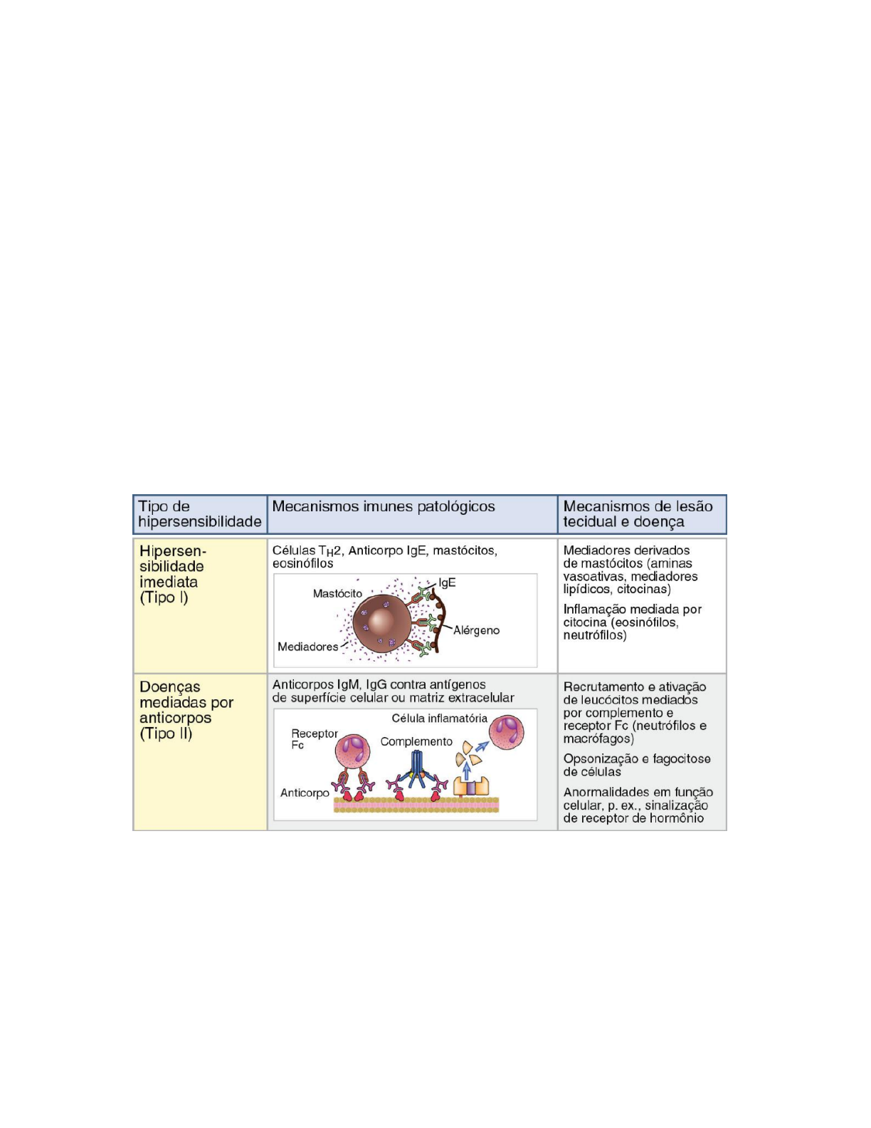 Hipersensibilidade ➔ As próprias respostas imunes são capazes de causar lesão tecidual e doença. As reações imunes prejudiciais ou patológicas são chamadas de reações de hipersensibilidade. Uma resposta imune a um antígeno pode resultar em sensibilidade à provocação com aquele antígeno e, portanto, a hipersensibilidade é um reflexo de respostas imunes excessivas ou aberrantes. As reações de hipersensibilidade podem ocorrer em duas situações. Primeiramente, as respostas a antígenos estranhos (microrganismos e antígenos ambientais não infecciosos) podem ser desreguladas ou descontroladas, resultando em lesão tecidual. Em segundo lugar, as respostas imunes podem ser direcionadas contra os antígenos próprios (autólogos), como resultado da falha de autotolerância. As reações de hipersensibilidade são classificadas com base no principal mecanismo imunológico responsável pela lesão tecidual e pela doença Hipersensibilidade do tipo 1 ➔ A hipersensibilidade imediata trata-se de uma reação mediada pelo anticorpo IgE e por mastócitos a determinados antígenos, que causa um rápido vazamento vascular e secreções mucosas, geralmente acompanhados por inflamação. As reações hipersensibilidade imediata mediada pela IgE também são denominadas alergia, ou atopia, e diz-se que os indivíduos com uma forte propensão a desenvolver essas reações são atópicos. Os tipos comuns dessas reações incluem a febre do feno, alergias alimentares, asma brônquica e anafilaxia. A sequência de eventos no desenvolvimento das reações de hipersensibilidade imediata começa com a ativação de células TH2 e produção de anticorpos IgE em resposta a um antígeno, com a ligação da IgE a receptores de Fc dos mastócitos e, então, com a subsequente exposição ao antígeno, ligação cruzada da IgE ligada pelo antígeno reintroduzido e liberação de mediadores dos mastócitos Alguns mediadores de mastócitos causam um rápido aumento na permeabilidade vascular e na contração do músculo liso, resultando em muitos dos sintomas dessas reações Essa reação vascular e do músculo liso pode ocorrer minutos após a reintrodução do antígeno em um indivíduo pré-sensibilizado – daí a designação hipersensibilidade imediata. Outros mediadores de mastócitos são citocinas que recrutam neutrófilos e eosinófilos ao local da reação durante muitas horas. Esse componente inflamatório da hipersensibilidade imediata é denominado reação de fase tardia, e é responsável principalmente pela lesão tecidual que resulta de ataques repetidos de hipersensibilidade imediata. A hipersensibilidade imediata desenvolve-se em consequência da ativação das células TH2 em resposta a antígenos de proteínas ou substâncias químicas que se ligam às proteínas. Os antígenos que produzem as reações de hipersensibilidade imediata (alérgicas) geralmente são chamados de alérgenos. Duas das citocinas secretadas pelas células TH2, interleucina-4 (IL-4) e IL-13, estimulam linfócitos B específicos para os antígenos estranhos a mudarem para plasmócitos produtores de IgE. Ativação de Mastócitos e Secreção de Mediadores Em um indivíduo atópico, os mastócitos são revestidos com anticorpo IgE específico do(s) antígeno(s) ao(s) qual(is) o indivíduo é alérgico. Esse processo de revestimento dos mastócitos com IgE é denominado sensibilização, porque o revestimento com IgE específico de um antígeno torna os mastócitos sensíveis à ativação pela exposição subsequente àquele antígeno. Quando mastócitos sensibilizados por IgE são expostos ao alérgeno, as células são ativadas para secretar os seus mediadores Os sinais levam a três tipos de respostas no mastócito: liberação rápida de conteúdos granulosos (degranulação), síntese e secreção de mediadores lipídicos e síntese e secreção de citocinas. Os mediadores mais importantes produzidos pelos mastócitos são aminas vasoativas e proteases armazenadas nos grânulos e liberadas deles, produtos recém-gerados e secretados do metabolismo do ácido araquidônico e citocinas Citocinas produzidas pelos mastócitos estimulam o recrutamento de leucócitos, causando a reação de fase tardia. Os principais leucócitos envolvidos nessa reação são eosinófilos, neutrófilos e células TH2. O fator de necrose tumoral (TNF) derivado dos mastócitos e a IL-4 promovem inflamação rica em neutrófilos e eosinófilos. Hipersensibilidade do tipo 2 ➔ Anticorpos direcionados contra antígenos celulares ou teciduais podem danificar essas células ou tecidos ou podem prejudicar sua função (tipo 2) ➔ Às vezes, anticorpos contra antígenos solúveis podem formar complexos com os antígenos, e os complexos imunes podem-se depositar nos vasos sanguíneos em vários tecidos e causar inflamação e lesão tecidual (tipo 3) Anticorpos que não a IgE podem causar doenças ao se ligar a seus antígenos-alvo nas células e nos tecidos (tipo 2) ou por formar complexos imunes que se depositam nos vasos sanguíneos Os complexos imunológicos muitas vezes são depositados nos vasos sanguíneos, sobretudo os vasos pelos quais o plasma é filtrado em alta pressão (p. ex., glomérulos renais e sinóvia articular). Portanto, as doenças de complexo imune tendem a ser sistêmicas e geralmente se manifestam como vasculite difusa, artrite e nefrite. (tipo 3) Anticorpos causadores de doenças são com mais frequência anticorpos contra antígenos próprios e menos comumente específicos de antígenos estranhos (p. ex., microbianos). A produção de autoanticorpos resulta de uma falha de autotolerância. (tipo 2) Autoanticorpos podem ligar-se a antígenos próprios nos tecidos ou formar complexos imunes com antígenos próprios circulantes. Anticorpos específicos de antígenos celulares e teciduais podem depositar-se nos tecidos e causar lesões ao induzir uma inflamação local, podem ligar-se e promover a destruiç