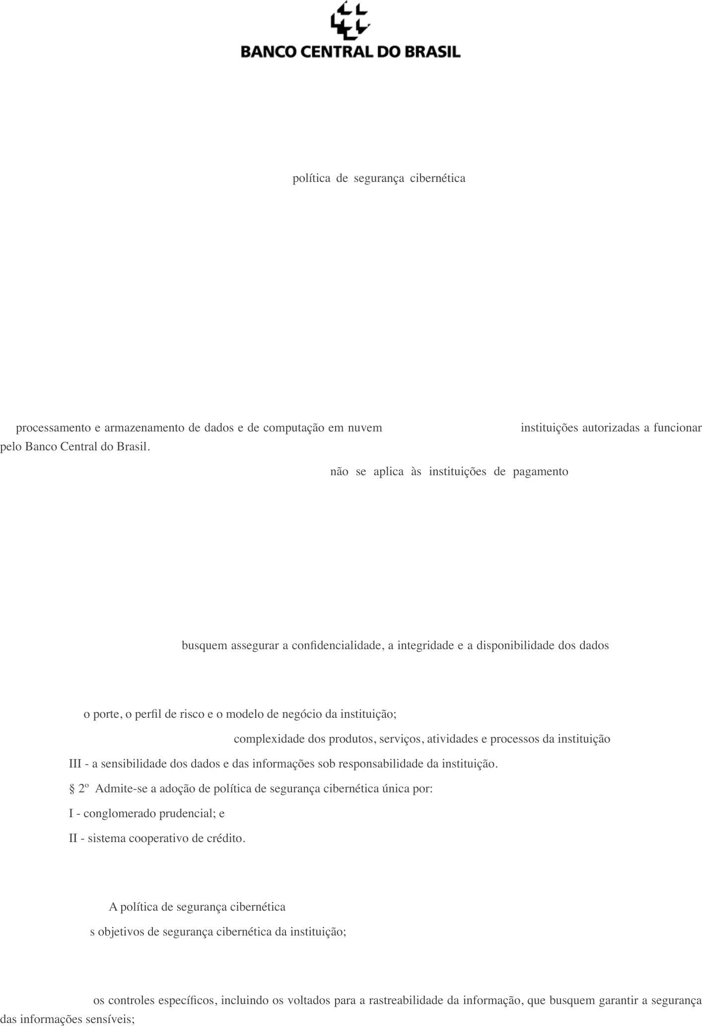 09/04/2023, 21:20 Exibe Normativo https://www.bcb.gov.br/estabilidadefinanceira/exibenormativo?tipo=RESOLUÇÃO CMN&numero=4893 1/7 Resolução CMN n° 4.893 de 26/2/2021 RESOLUÇÃO CMN Nº 4.893, DE 26 DE FEVEREIRO DE 2021 Dispõe sobre a política de segurança cibernética e sobre os requisitos para a contratação de serviços de processamento e armazenamento de dados e de computação em nuvem a serem observados pelas instituições autorizadas a funcionar pelo Banco Central do Brasil. O Banco Central do Brasil, na forma do art. 9º da Lei nº 4.595, de 31 de dezembro de 1964, torna público que o Conselho Monetário Nacional, em sessão realizada em 25 de fevereiro de 2021, com base nos arts. 4º, inciso VIII, da referida Lei, 9º da Lei nº 4.728, de 14 de julho de 1965, 7º e 23, alínea "a", da Lei nº 6.099, de 12 de setembro de 1974, 1º, inciso II, da Lei nº 10.194, de 14 de fevereiro de 2001, e 1º, § 1º, da Lei Complementar nº 130, de 17 de abril de 2009, R E S O L V E U : CAPÍTULO I DO OBJETO E DO ÂMBITO DE APLICAÇÃO Art. 1º Esta Resolução dispõe sobre a política de segurança cibernética e sobre os requisitos para a contratação de serviços de processamento e armazenamento de dados e de computação em nuvem a serem observados pelas instituições autorizadas a funcionar pelo Banco Central do Brasil. Parágrafo único. O disposto nesta Resolução não se aplica às instituições de pagamento, que devem observar a regulamentação emanada do Banco Central do Brasil, no exercício de suas atribuições legais. CAPÍTULO II DA POLÍTICA DE SEGURANÇA CIBERNÉTICA Seção I Da Implementação da Política de Segurança Cibernética Art. 2º As instituições referidas no art. 1º devem implementar e manter política de segurança cibernética formulada com base em princípios e diretrizes que busquem assegurar a confidencialidade, a integridade e a disponibilidade dos dados e dos sistemas de informação utilizados. § 1º A política mencionada no caput deve ser compatível com: I - o porte, o perfil de risco e o modelo de negócio da instituição; II - a natureza das operações e a complexidade dos produtos, serviços, atividades e processos da instituição; e III - a sensibilidade dos dados e das informações sob responsabilidade da instituição. § 2º Admite-se a adoção de política de segurança cibernética única por: I - conglomerado prudencial; e II - sistema cooperativo de crédito. § 3º As instituições que não constituírem política de segurança cibernética própria em decorrência do disposto no § 2º devem formalizar a opção por essa faculdade em reunião do conselho de administração ou, na sua inexistência, da diretoria da instituição. Art. 3º A política de segurança cibernética deve contemplar, no mínimo: I - os objetivos de segurança cibernética da instituição; II - os procedimentos e os controles adotados para reduzir a vulnerabilidade da instituição a incidentes e atender aos demais objetivos de segurança cibernética; III - os controles específicos, incluindo os voltados para a rastreabilidade da informação, que busquem garantir a segurança das informações sensíveis; Jennifer Ferreira Viana Jennifer Ferreira Viana Jennifer Ferreira Viana Jennifer Ferreira Viana Jennifer Ferreira Viana Jennifer Ferreira Viana Jennifer Ferreira Viana Jennifer Ferreira Viana Jennifer Ferreira Viana Jennifer Ferreira Viana Jennifer Ferreira Viana Jennifer Ferreira Viana Jennifer Ferreira Viana 09/04/2023, 21:20 Exibe Normativo https://www.bcb.gov.br/estabilidadefinanceira/exibenormativo?tipo=RESOLUÇÃO CMN&numero=4893 2/7 IV - o registro, a análise da causa e do impacto, bem como o controle dos efeitos de incidentes relevantes para as atividades da instituição; V - as diretrizes para: a) a elaboração de cenários de incidentes considerados nos testes de continuidade de negócios; b) a definição de procedimentos e de controles voltados à prevenção e ao tratamento dos incidentes a serem adotados por empresas prestadoras de serviços a terceiros que manuseiem dados ou informações sensíveis ou que sejam relevantes para a condução das atividades operacionais da instituição; c) a classificação dos dados e das informações quanto à relevância; e d) a definição dos parâmetros a serem utilizados na avaliação da relevância dos incidentes; VI - os mecanismos para disseminação da cultura de segurança cibernética na instituição, incluindo: a) a implementação de programas de capacitação e de avaliação periódica de pessoal; b) a prestação de informações a clientes e usuários sobre precauções na utilização de produtos e serviços financeiros; e c) o comprometimento da alta administração com a melhoria contínua dos procedimentos relacionados com a segurança cibernética; e VII - as iniciativas para compartilhamento de informações sobre os incidentes relevantes, mencionados no inciso IV, com as demais instituições referidas no art. 1º. § 1º Na definição dos objetivos de segurança cibernética referidos no inciso I do caput, deve ser contemplada a capacidade da instituição para prevenir, detectar e reduzir a vulnerabilidade a incidentes relacionados com o ambiente cibernético. § 2º Os procedimentos e os controles de que trata o inciso II do caput devem abranger, no mínimo, a autenticação, a criptografia, a prevenção e a detecção de intrusão, a prevenção de vazamento de informações, a realização periódica de testes e varreduras para detecção de vulnerabilidades, a proteção contra softwares maliciosos, o estabelecimento de mecanismos de rastreabilidade, os controles de acesso e de segmentação da rede de computadores e a manutenção de cópias de segurança dos dados e das informações. § 3º Os procedimentos e os controles citados no inciso II do caput devem ser aplicados, inclusive, no desenvolvimento de sistemas de informação seguros e na ad