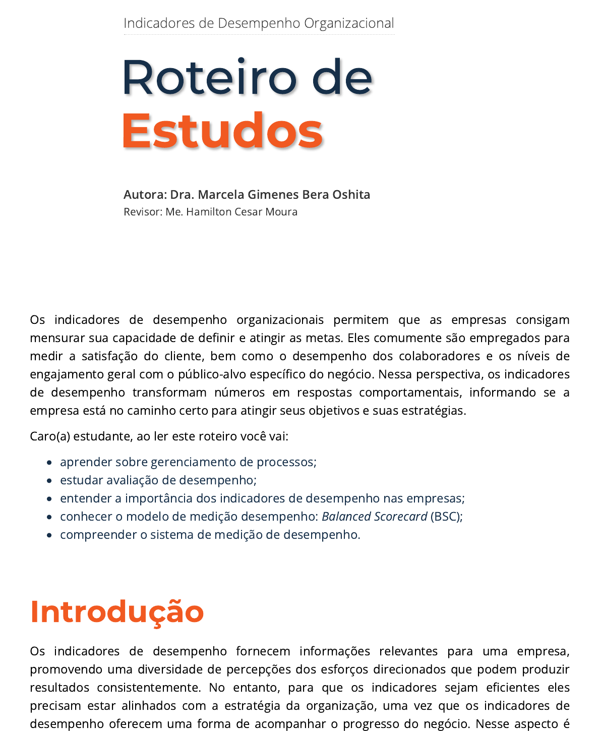 06/03/2023, 09:49 Roteiro de Estudos https://student.ulife.com.br/ContentPlayer/Index?lc=zqSm1j4ZZo1V9lgF9iWc%2fg%3d%3d&l=HTJg2c9Fkt02Q8DaKdcP9g%3d%3d&cd=QMJ%… 1/15 Os indicadores de desempenho organizacionais permitem que as empresas consigam mensurar sua capacidade de de�nir e atingir as metas. Eles comumente são empregados para medir a satisfação do cliente, bem como o desempenho dos colaboradores e os níveis de engajamento geral com o público-alvo especí�co do negócio. Nessa perspectiva, os indicadores de desempenho transformam números em respostas comportamentais, informando se a empresa está no caminho certo para atingir seus objetivos e suas estratégias. Caro(a) estudante, ao ler este roteiro você vai: aprender sobre gerenciamento de processos; estudar avaliação de desempenho; entender a importância dos indicadores de desempenho nas empresas; conhecer o modelo de medição desempenho: Balanced Scorecard (BSC); compreender o sistema de medição de desempenho. Introdução Os indicadores de desempenho fornecem informações relevantes para uma empresa, promovendo uma diversidade de percepções dos esforços direcionados que podem produzir resultados consistentemente. No entanto, para que os indicadores sejam e�cientes eles precisam estar alinhados com a estratégia da organização, uma vez que os indicadores de desempenho oferecem uma forma de acompanhar o progresso do negócio. Nesse aspecto é Indicadores de Desempenho Organizacional Roteiro deRoteiro de EstudosEstudos Autora: Dra. Marcela Gimenes Bera Oshita Revisor: Me. Hamilton Cesar Moura 06/03/2023, 09:49 Roteiro de Estudos https://student.ulife.com.br/ContentPlayer/Index?lc=zqSm1j4ZZo1V9lgF9iWc%2fg%3d%3d&l=HTJg2c9Fkt02Q8DaKdcP9g%3d%3d&cd=QMJ%… 2/15 necessário ainda que a empresa desenvolva o gerenciamento desse desempenho de forma que a empresa avance em prol de atingir as metas estabelecidas. Assim, neste roteiro de estudos, veremos a importância dos gerenciamentos de processos dentro da organização e como a estrutura hierárquica da empresa pode auxiliar ou não nesse processo. Além disso, você terá a oportunidade de conhecer os aspectos que envolvem a avaliação de desempenho, bem como a importância de alinhar os indicadores para mensurar corretamente o desempenho das estratégias empresariais. Ainda veremos o modelo de medição de desempenho: Balanced Scorecard (BSC) e passaremos a compreender os sistemas de medição de desempenho. Gerenciamento de Processos O gerenciamento de processos refere-se ao alinhamento de processos às metas estratégicas de uma empresa, ao desenvolvimento e implementação de organização de processos, ao estabelecimento de sistemas de medição de processos alinhados às metas organizacionais e à educação e organização de gerentes para que eles gerenciem os processos de forma e�caz. O processo que produz aviões é, essencialmente falando, o mesmo que produz bolo de chocolate! O processo que produz tablets é o mesmo que produz pão. O que diferencia um processo do outro é o produto que cada um produz, a gama de recursos existentes e sua utilização por cada processo e os insumos que cada processo recebe para produzir seu produto. A combinação dos elementos existentes no processo essencial, além da ocorrência ou não desses elementos num determinado momentum, é o que determina a especi�cidade de cada processo na prática (CRUZ, 2015, p. 64). Assim, “a Gestão por Processos apresenta-se atualmente como tendência predominante na Administração Estratégica. Longe de ser intuitivo, o alinhamento da empresa com essa visão ainda é lento e complicado” (MÜLLER, 2013, p. 56). Nesse contexto, podemos dizer que um dos principais desa�os da organização está na quebra de paradigmas, com relação ao enfoque na Gestão por Processos, uma vez que, pode haver uma cultura organizacional muito enraizada. Isso, pois o estilo de trabalho da empresa depende da sua estrutura organizacional, que de�ne os papéis, responsabilidades e cultura de trabalho. O tradicional modelo hierárquico-funcional, evidenciado pela organização predominantemente vertical em departamentos ou unidades autossu�cientes, tende a ser suplantado pela estruturação por processos de organizações 06/03/2023, 09:49 Roteiro de Estudos https://student.ulife.com.br/ContentPlayer/Index?lc=zqSm1j4ZZo1V9lgF9iWc%2fg%3d%3d&l=HTJg2c9Fkt02Q8DaKdcP9g%3d%3d&cd=QMJ%… 3/15 geralmente menores, menos diversi�cadas e hierarquizadas e com mais interdependências internas (MÜLLER, 2013, p. 56). Nesse aspecto, uma organização pode se adaptar a qualquer estrutura conforme seus requisitos. Assim, o modelo horizontal é caracterizado por ser interdepartamental e se basear na divisão de responsabilidades, comunicação e transferência de informações. Observe que, num modelo horizontal, há menos gestores, por isso, há mais autoridades passam a ser concedidas para os colaboradores comuns, o que possibilita que esses funcionários passem a tomar decisões, melhorando a e�ciência organizacional. Assim, concentra toda a organização na criação de uma linha de visão entre o trabalho das pessoas e os resultados de alto nível desejados. Para atender às demandas dos diversos clientes, os gestores se concentram nos �uxos dos produtos entre os departamentos, bem como nas atividades desenvolvidas. Na gestão moderna, a empresa é um agregado de processos inter-relacionados e o entendimento da empresa sob esse aspecto é um requisito conceitual muito importante para o seu aperfeiçoamento gerencial. Como o trabalho �ui entre os departamentos, somente vendo-o em sua totalidade é que se pode identi�car os pontos de alavancagem para simpli�cá-lo (MÜLLER, 2013, p. 60). Ainda, a demanda variada dos clientes faz com que as organizações tenham de ofertar múltiplos produtos e serviços, atendendo a diversos mercados. “Essa con�guração impõe no ambiente organizacional um