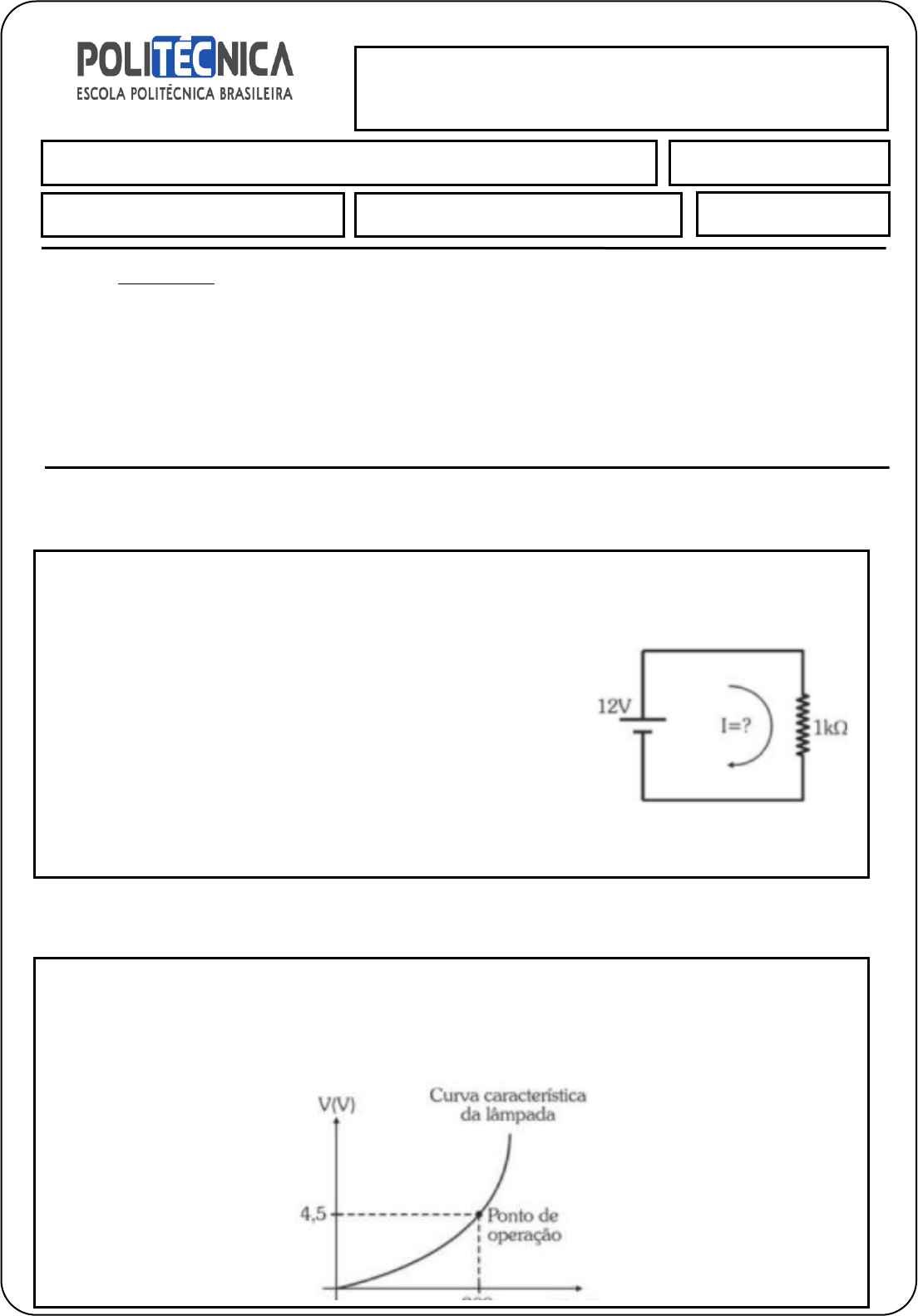 Atividade de Pesquisa: ELETRICIDADE I 1) Qual é a intensidade da corrente elétrica que passa por uma resistência de 1kΩ submetida a uma tensão de 12V? 2) A lâmpada da lanterna possui comportamento não ôhmico devido, principalmente, à temperatura do filamento durante a incandescência. Determine a resistência da lâmpada para a sua condição normal de operação: V = 4,5V e I = 200mA. ELETRICIDADE I Aluno (a): Matheus Batista Soares de Araújo Data: 10/ 04/2023 Atividade de Pesquisa NOTA: INSTRUÇÕES: → Esta Atividade contém 17 questões. Totalizando 10 pontos. → Preencher devidamente seus dados no cabeçalho. → Utilize o espaço delimitado abaixo de cada questão para as suas respostas. → Ao terminar grave o arquivo com o nome Atividade de Envio (nome do aluno). → Salve o arquivo no formato .pdf e envie pelo sistema. R = V / I R = 4,5 V / 0,2 A R = 22,5 Ω Portanto, a resistência da lâmpada para a sua condição normal de operação é de 22,5 Ω I = V/R = 12V / 1kΩ = 0,012 A ou 12 mA Portanto, a intensidade da corrente elétrica que passa pela resistência é de 12 mA. Atividade de Pesquisa: ELETRICIDADE I 3) Determine a resistência de um fio de cobre de 4 mm de diâmetro e 10 km de comprimento. 4) Considere um resistor com as seguintes especificações: 1kΩ - 1/2W. R = (ρ * L) / A R = resistência elétrica (em ohms) ρ = resistividade do cobre (1,68 x 10^-8 ohm.m) L = comprimento do fio (em metros) A = área da seção transversal do fio (em metros quadrados) A = π * r^2 A = π * (2 mm)^2 A = 3,14 * 4 mm^2 A = 12,56 * 10^-6 m^2 R = (ρ * L) / A R = (1,68 x 10^-8 ohm.m * 10,000 m) / (12,56 x 10^-6 m^2) R = 0,0134 ohms Portanto, a resistência do fio de cobre de 4 mm de diâmetro e 10 km de comprimento é de 0,0134 ohms. a) Qual é a corrente Imáx e a tensão Vmáx que ele pode suportar? I = V/R = Vmax/1000Ω = Vmax/1kΩ I = 220V/1kΩ = 0,22A ou 220mA Vmax = Pmax/Imax = 0,5W/0,22A = 2,27V b) Que potência P’ ele dissiparia caso a tensão aplicada V’ fosse metade de Vmáx? V' = Vmax/2 = 220V/2 = 110V I = V'/R = 110V/1kΩ = 0,11A ou 110mA P' = V'I = 110V0,11A = 12,1W c )Quanto vale a relação Pmáx / P’ e qual conclusão pode ser tirada? A relação Pmax/P' é: Pmax/P' = 0,5W/12,1W = 0,041 Atividade de Pesquisa: ELETRICIDADE I 5) Uma lâmpada residencial está especificada para 127V / 100W. Determine: 6) Uma turbina de uma usina hidrelétrica com capacidade de 100.000 kWh abastece uma região com tensão de 127V. Quantas lâmpadas de 200W/127V essa turbina pode alimentar simultaneamente? 7) No circuito ao lado, são conhecidos os valores de E1, E3, V1, V2 e V4. Determine E2 e V3 para que a lei de Kirchhoff para tensões seja válida. a) A energia elétrica consumida por essa lâmpada num periódo de cinco horas diárias em um mês de 30 dias; 100W / 1000 = 0,1 kW 0,1 kW x 1 hora = 0,1 kWh 0,1 kWh x 5 horas = 0,5 kWh 0,5 kWh x 30 dias = 15 kWh Portanto, a energia elétrica consumida por essa lâmpada num período de cinco horas diárias em um mês de 30 dias é de 15 kWh. b) O valor a ser pago por esse consumo, sabendo que a empresa de energia elétrica cobra a tarifa de R$ 0,30 por kWh mais um imposto de 33,33%. 15 kWh x R$ 0,30/kWh = R$ 4,50 R$ 4,50 + (33,33% x R$ 4,50) = R$ 6,00 Portanto, o valor a ser pago pelo consumo da lâmpada em um mês de 30 dias é de R$ 6,00. E = P x t = 200W x 1h = 200 Wh 200 Wh ÷ 1000 = 0,2 kWh 100.000 kWh ÷ 0,2 kWh/lâmpada = 500.000 lâmpadas Portanto, a turbina pode alimentar simultaneamente 500.000 lâmpadas de 200W/127V. Atividade de Pesquisa: ELETRICIDADE I 8) Determine a resistência equivalente entre os terminais A e B do circuito: 9) Determine a tensão, a corrente e a potência em cada resistor da rede resistiva ao lado. Resposta; 30 Homs Atividade de Pesquisa: ELETRICIDADE I 10) Determine a tensão e a corrente no resistor R4 do circuito ao lado. 11) No circuito ao lado, determine a potência dissipada pelo resistor R5, sabendo que I2 = 120mA IR1 = 22/4400 = 0,005 ou 5mA IR4= o,oo5*2400/2400+2400=0,0025A ou 2,5mA VR4= 1200*0,005=6V Resposta: IR4 = 2,5mA VR4= 6V R4 e R5 em paralelo > Req = 50 R2 e (R3 + Req) em paralelo > Req' = 75 R1 + Req' em série > 175 i = E/175 = 42/175 = 0,24A = 240mA Como i2 = 120mA > i3 = 120mA "240mA se dividem entre i2 e i3 como R4 = R5 > i3 se divide entre i4 e i5, igualmente > i5 = 60mA = 0,06A Pd = R5*i5² = 100*0,06² = 100*0,0036 = 0,36W = 360mW Atividade de Pesquisa: ELETRICIDADE I a) A resistência equivalente do circuito; RT = R1+R2+R3+R4+R5= RT 200 b) A corrente total fornecida pela fonte de alimentação ao circuito. 12) No circuito ao lado, determine a resistência equivalente e a corrente fornecida pela fonte de alimentação. 13) Considere a rede resistiva ao lado e determine: RT= 200 VT= 25 25/200= 8A resposta B= 8 A Atividade de Pesquisa: ELETRICIDADE I Para o rádio operar corretamente, o resistor 2 do divisor de tensão deve ser de 72 ohms. I2=2,14mA I1=25,55mA 14) Um rádio AM/FM portátil funciona, em condições normais de operação, com as seguintes especificações: 3V/450mW. Qual deve ser o valor do resistor R2 para que esse rádio opere a partir de uma fonte de 12V, conforme a montagem ao lado? Observacã̧o: O divisor de tensão é formado por R1 e R2 // Rrádio. 15) Considerando o divisor de corrente ao lado, determine I1 e I2 a partir da sua equação geral. Atividade de Pesquisa: ELETRICIDADE I A tensão e a corrente na resistência de carga RL é, segundo seu valor : 4,95 V e 0,0495 A com RL1=100 ohms. 12,68 V e 0,025 A com RL2=500 ohms. 17,14 V e 0,0114 A com RL3=1500 ohms. 16) Dado o circuito ao lado, determine a corrente e a tensão na carga RL pelo método de Thévenin, para cada um dos valores seguintes que ela pode assumir: RL1 = 100Ω; RL2 = 500 Ω; RL3 = 1,5kΩ. 17) Considere o circuito RC ao lado, no qual o capacitor encontra-se totalmente descarregado. Atividade de Pesquisa: ELETRICIDADE I