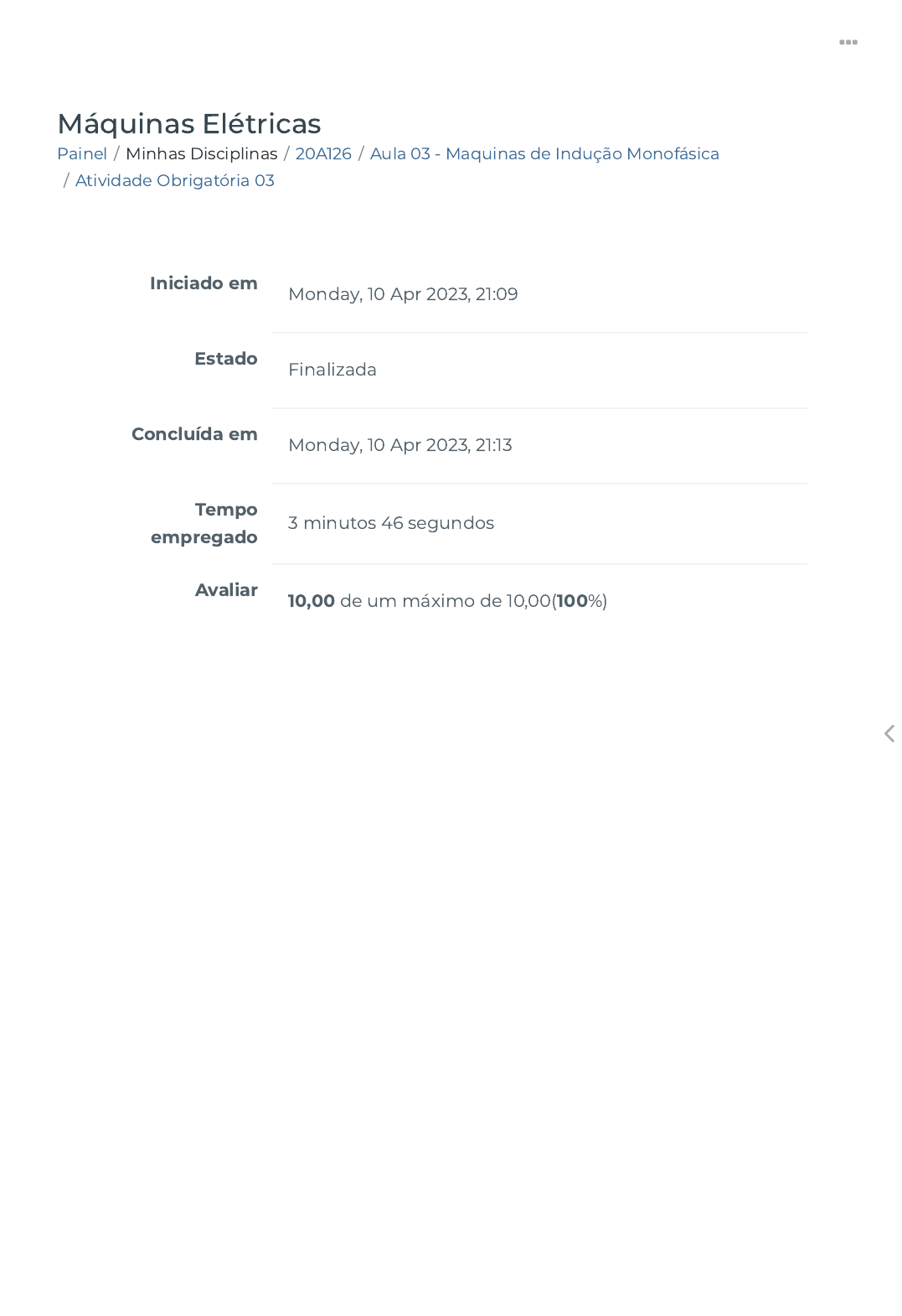Painel / Minhas Disciplinas / 20A126 / Aula 03 - Maquinas de Indução Monofásica / Atividade Obrigatória 03 Máquinas Elétricas Iniciado em Monday, 10 Apr 2023, 21:09 Estado Finalizada Concluída em Monday, 10 Apr 2023, 21:13 Tempo empregado 3 minutos 46 segundos Avaliar 10,00 de um máximo de 10,00(100%) https://ava.politecnicabr.com.br/my/ https://ava.politecnicabr.com.br/course/view.php?id=963 https://ava.politecnicabr.com.br/course/view.php?id=963#section-4 https://ava.politecnicabr.com.br/mod/quiz/view.php?id=32511 https://ava.politecnicabr.com.br/ Questão 1 Correto Atingiu 2,00 de 2,00 Em uma máquina monofásica, um enrolamento auxiliar com uma reatância maior que o enrolamento principal é inserido em paralelo com o enrolamento principal somente durante a partida do motor. Quando o rotor atinge 75% da velocidade síncrona, uma chave centrífuga retira o enrolamento auxiliar do circuito, permanecendo apenas o enrolamento principal. Escolha uma opção: Questão 2 Correto Atingiu 2,00 de 2,00 A equação que representa corretamente a tensão induzida no estator é: Escolha uma opção: Verdadeiro Falso E = 4,44.f.N ϕ Verdadeiro Falso https://ava.politecnicabr.com.br/ Questão 3 Correto Atingiu 2,00 de 2,00 A equação que representa corretamente o escorregamento é: Escolha uma opção: Questão 4 Correto Atingiu 2,00 de 2,00 Motor monofásico é um tipo de motor que possui apenas um conjunto de bobinas e sua alimentação é feita por uma única fase de corrente alternada. Dessa forma, este tipo de motor absorve energia elétrica de uma rede monofásica e transforma-a em energia mecânica. Escolha uma opção: s = −nns ns Verdadeiro Falso Verdadeiro Falso https://ava.politecnicabr.com.br/ Questão 5 Correto Atingiu 2,00 de 2,00 Qual o escorregamento de um motor monofásico considerando que o rotor está girando com velocidade 1720rpm, e a velocidade síncrona é de 1900rpm. (considerar a resposta em %). Escolha uma opção: a. 0,09 b. 99,47 c. 0,94 d. 9,47 Entre em Contato https://www.politecnicabr.com.br 0800 084 2627 0800 084 2627 Links Úteis Dicas da nossa Diretora Acadêmica Planner de Estudos Declaração de Matrícula Orientações do AVA Abertura de Ticket Fale com o Tutor Cronograma de Estudos Manual de Estágio Manual de Competência Siga-nos nas redes sociais https://www.politecnicabr.com.br/ https://soundcloud.com/user-501638417/sets/escola-politecnica-brasileira https://storage.googleapis.com/sirius-pubstore/semestre_plannerdeestudo%20poli.pdf https://storage.googleapis.com/sirius-pubstore/declaracao_matricula.pdf https://storage.googleapis.com/sirius-pubstore/orientacoes_ava.pdf https://storage.googleapis.com/sirius-pubstore/abertura_ticket.pdf https://storage.googleapis.com/sirius-pubstore/fale_com_tutor.pdf https://storage.googleapis.com/sirius-pubstore/cronograma_estudos.pdf https://storage.googleapis.com/sirius-pubstore/manual_estagio.pdf https://storage.googleapis.com/sirius-pubstore/manual_competencia.pdf https://ava.politecnicabr.com.br/ © 2022 - Escola Politécnica Brasileira https://ava.politecnicabr.com.br/mod/quiz/0 https://www.facebook.com/politecnicabr https://www.instagram.com/politecnicabr_oficial https://ava.politecnicabr.com.br/