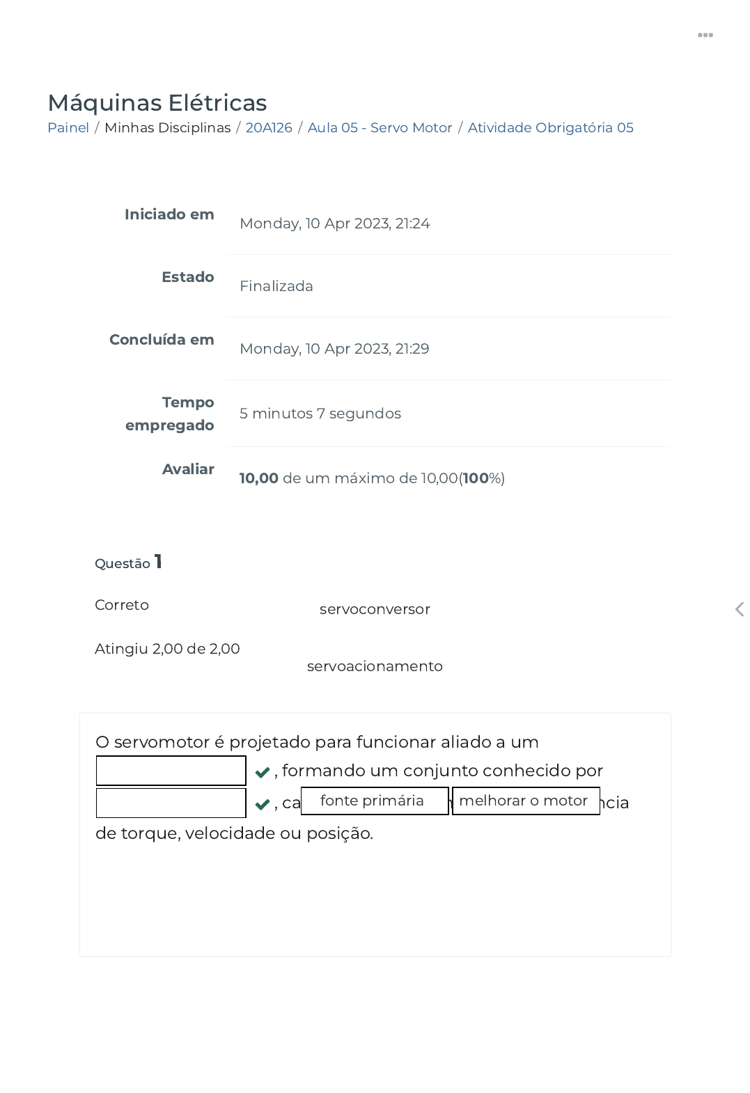 Painel / Minhas Disciplinas / 20A126 / Aula 05 - Servo Motor / Atividade Obrigatória 05 Máquinas Elétricas Iniciado em Monday, 10 Apr 2023, 21:24 Estado Finalizada Concluída em Monday, 10 Apr 2023, 21:29 Tempo empregado 5 minutos 7 segundos Avaliar 10,00 de um máximo de 10,00(100%) Questão 1 Correto Atingiu 2,00 de 2,00 O servomotor é projetado para funcionar aliado a um , formando um conjunto conhecido por , capaz de seguir �elmente uma referência de torque, velocidade ou posição. servoconversor servoacionamento fonte primária melhorar o motor https://ava.politecnicabr.com.br/my/ https://ava.politecnicabr.com.br/course/view.php?id=963 https://ava.politecnicabr.com.br/course/view.php?id=963#section-6 https://ava.politecnicabr.com.br/mod/quiz/view.php?id=32515 https://ava.politecnicabr.com.br/ Questão 2 Correto Atingiu 2,00 de 2,00 O Servomotor é uma máquina, eletromecânica, que apresenta movimento proporcional a um comando, como dispositivos de malha fechada, ou seja: recebem um sinal de controle; que veri�ca a posição atual para controlar o seu movimento indo para a posição desejada com velocidade monitorada externamente sob feedback de um dispositivo denominado taco ou sensor de efeito Hall ou encoder ou resolver, ou tachsin, dependendo do tipo de servomotor e aplicação. Escolha uma opção: Verdadeiro Falso alternada contínua gerador transformador https://ava.politecnicabr.com.br/ Questão 3 Correto Atingiu 2,00 de 2,00 O servomotor de corrente é uma máquina síncrona projetada para realizar operações que uma máquina elétrica girante convencional não é capaz de realizar. O servomotor de corrente possui excitação de campo independente ou magnetismo permanente como fonte primária de �uxo. Questão 4 Correto Atingiu 2,00 de 2,00 As principais características que se deseja em qualquer servomotor são: rotação suave, elevada dinâmica, baixo nível de ruído e vibração, conjugado de saída do motor aproximadamente proporcional à tensão aplicada e sentido do conjugado determinado pela polaridade instantânea da tensão de controle. Escolha uma opção: Verdadeiro Falso https://ava.politecnicabr.com.br/ Questão 5 Correto Atingiu 2,00 de 2,00 O tipo de servomotor mais utilizado atualmente é o servomotor alimentado a partir de uma fonte de alimentação alternada. Nesta con�guração, normalmente, o rotor utiliza imãs permanentes, geralmente fabricados com terras raras. A carcaça é fabricada em alumínio, o estator é formado por um pacote de lâminas e um sensor (enconder ou resolver) é responsável por fornecer sinais de realimentação para o servoconversor. Através desses sinais o conversor é capaz de acionar de forma precisa o servomotor. Escolha uma opção: Verdadeiro Falso Entre em Contato https://www.politecnicabr.com.br 0800 084 2627 0800 084 2627 Links Úteis Dicas da nossa Diretora Acadêmica Planner de Estudos Declaração de Matrícula Orientações do AVA Abertura de Ticket Fale com o Tutor Cronograma de Estudos Manual de Estágio Manual de Competência https://www.politecnicabr.com.br/ https://soundcloud.com/user-501638417/sets/escola-politecnica-brasileira https://storage.googleapis.com/sirius-pubstore/semestre_plannerdeestudo%20poli.pdf https://storage.googleapis.com/sirius-pubstore/declaracao_matricula.pdf https://storage.googleapis.com/sirius-pubstore/orientacoes_ava.pdf https://storage.googleapis.com/sirius-pubstore/abertura_ticket.pdf https://storage.googleapis.com/sirius-pubstore/fale_com_tutor.pdf https://storage.googleapis.com/sirius-pubstore/cronograma_estudos.pdf https://storage.googleapis.com/sirius-pubstore/manual_estagio.pdf https://storage.googleapis.com/sirius-pubstore/manual_competencia.pdf https://ava.politecnicabr.com.br/ © 2022 - Escola Politécnica Brasileira Siga-nos nas redes sociais https://ava.politecnicabr.com.br/mod/quiz/0 https://www.facebook.com/politecnicabr https://www.instagram.com/politecnicabr_oficial https://ava.politecnicabr.com.br/