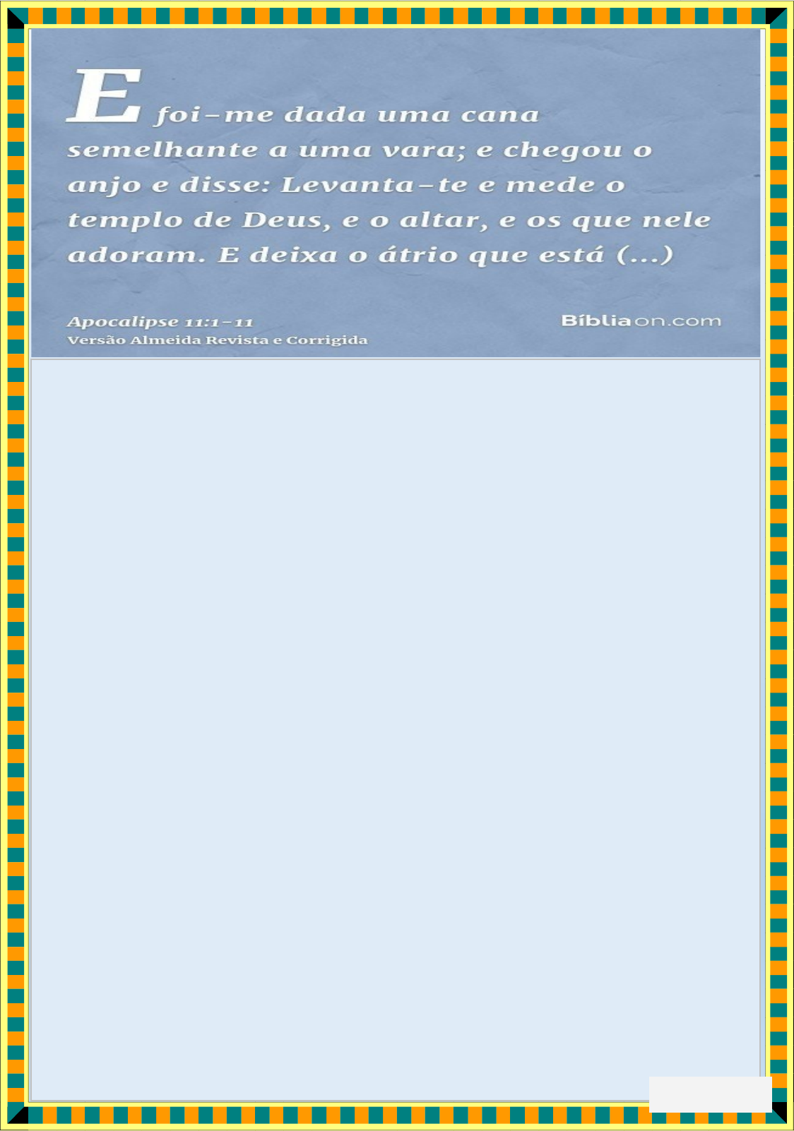 27mar2023 Capítulo 11: 1,2>O estado da Igreja está representado com a figura de um templo medido; 3-6>Duas testemunhas profetizam vestidas de saco; 7-13>São mortas, porém depois ressuscitam e sobem ao céu; 14-19>Após o toque da sétima trom- beta, todos os poderes anticristãos serão destruídos e haverá um glorioso estado do reino de Cristo na terra. 1-4: As duas testemunhas>João recebeu uma cana semelhante a uma vara; 15-19: A sétima trombeta: Consumação>Quando tocou o sétimo anjo a trombeta[...] houve no céu grande vozes; A igreja selada, perseguida e glorificada>Neste capítulo veremos de forma viva a missão da igreja no mundo, sua proteção, proclamação, perseguição, triunfo e então, o surgimento triunfante e vitorioso do Reino de Deus. A igreja é representada pelo santuário de Deus sendo medido (1-2)>Há aqui uma clara separação entre o povo de Deus e o mundo ímpio. O que simboliza esse santuá- rio? Simboliza a igreja verdadeira, ou seja, todas as pessoas salvas, todos os ver- dadeiros filhos de Deus, que O adoram em espírito e em verdade; A igreja é representada pelas duas testemunhas (3-14)>Uns entendem que essas tes- temunhas falam de Enoque e Elias. Alguns acreditam assim, em virtude de que esses foram os dois homens que foram para o céu sem experimentarem a morte; O anjo toca a sétima trombeta: a alegria dos remidos e o pavor dos ímpios(15-18) >João destaca aqui quatro verdades importantes: do céu vem vozes de exaltação a Cristo. Na abertura do sétimo houve silencio no céu em virtude dos terríveis juí- zos que desabariam sobre os homens; A igreja no céu em comunhão intima com Deus em contraste com os ímpios sen- do atormentados(19)>O santuário aberto no céu é um símbolo da profunda comu- nhão dos remidos com Deus. O santuário está aberto de par em par. Não há nada encoberto ou escondido. Em tudo daremos graças! MaurícioSaramago REFERÊNCIAS; 1. Comentário Exegético da Biblia>Jamieson-Fausset-Brown 2. Mattehw Henry-Comentários Biblicos; 3. Moody-Comentário Bíblico 4. Radmacher-Novo Comentário Biblico 5. Beacon-Hebreus a Apocalipse. 6. Lopes, Henrnades Dias-Comentários Expositivos Hagnos-Apocalipse Página 1 de 39 Página 2 de 39 Página 3 de 39 Página 4 de 39 Página 5 de 39 Página 6 de 39 Página 7 de 39 Página 8 de 39 Página 9 de 39 Página 10 de 39 Página 11 de 39 Página 12 de 39 Página 13 de 39 Página 14 de 39 Página 15 de 39 Página 16 de 39 Página 17 de 39 Página 18 de 39 Página 19 de 39 Página 20 de 39 Página 21 de 39 Página 22 de 39 Página 23 de 39 Página 24 de 39 Página 25 de 39 Página 26 de 39 Página 27 de 39 Página 28 de 39 Página 29 de 39 Página 30 de 39 Página 31 de 39 Página 32 de 39 Página 33 de 39 Página 34 de 39 Página 35 de 39 Página 36 de 39 Página 37 de 39 Página 38 de 39