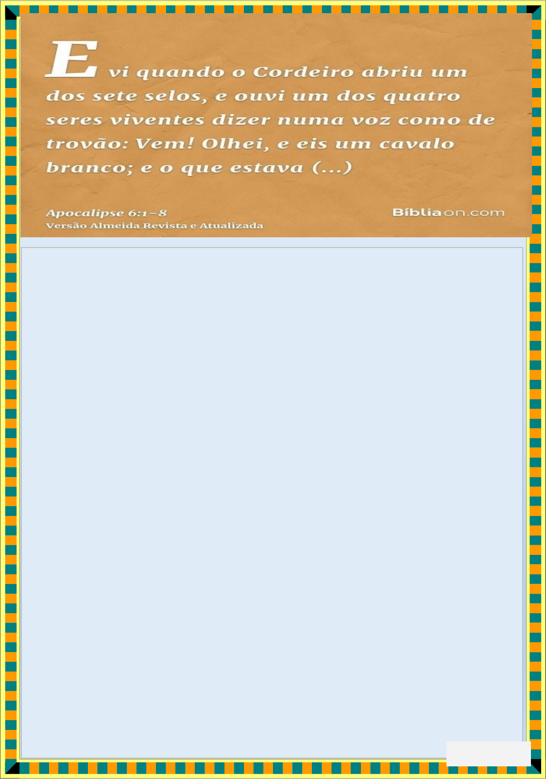 22mar2023 Capítulo 6>1-8: A abertura dos selos-O primeiro, o segundo, o terceiro e o quarto selo; 9-11:O quinto; 12-17: O sexto. 6-1,2: Como o primeiro cavalheiro está montado em um cavalo branco e vencendo, alguns acreditam que ele seja Cristo; 6-3,4: Vermelho é a cor do segundo cavalo, que representa derramamento de san- gue e matança com a espada, guerra no lugar de paz na terra; 6-5,6: O cavalo preto aparentemente simboliza a fome, já que os preços do trigo e da cavada estão extraordinariamente altos, e será uma época de extrema aridez; 6-7,8: Amarelo é a cor do cadáver. Assim, é apropriado que o cavalo amarelo seja montado por uma figura nomeada de Morte; O Hades segue após a Morte para rei- vindicar aqueles que tinham morrido. 6-1,2: O Primeiro Selo: Conquista>6-3,4: O Segundo Selo: Guerra>6-5,6: O Terceiro Selo: Fome>6-7,8: O Quarto Selo: Morte>6-9-11: O Quinto Selo: Martírio>6-12,17>O Sexto Selo: O Fim dos Tempos. Vv1-8: Cristo, o Cordeiro, abre o primeiro selo. Observe que um cavalheiro sai em um cavalo branco; Ao abrir o segundo selo, aparece um segundo cavalo; este é vermelho e significa os juízos que fazem estragos; Ao abrir o terceiro selo, apare- ceu um cavalo negro cor que denota luto e ais, trevas e ignorância; Ao abrir o quarto selo, saiu outro cavalo de cor amarela, pálido cujo cavalheiro era a morte, o rei dos terrores; Vv9-11: A visão do apóstolo ao abrir-se o quinto selo foi impressionante, viu as almas dos mártires debaixo do altar do céu, aos pés de Cristo; Vv12-17: Quando o sexto selo foi aberto, houve um grande terremoto. Os funda- mentos das igrejas e dos governos serão abalados de forma terrível. Em tudo daremos graças! MaurícioSaramago REFERÊNCIAS; 1. Comentário Exegético da Biblia>Jamieson-Fausset-Brown 2. Mattehw Henry-Comentários Biblicos; 3. Moody-Comentário Bíblico 4. Radmacher-Novo Comentário Biblico 5. Beacon-Hebreus a Apocalipse. 6. Lopes, Henrnades Dias-Comentários Expositivos Hagnos-Apocalipse
