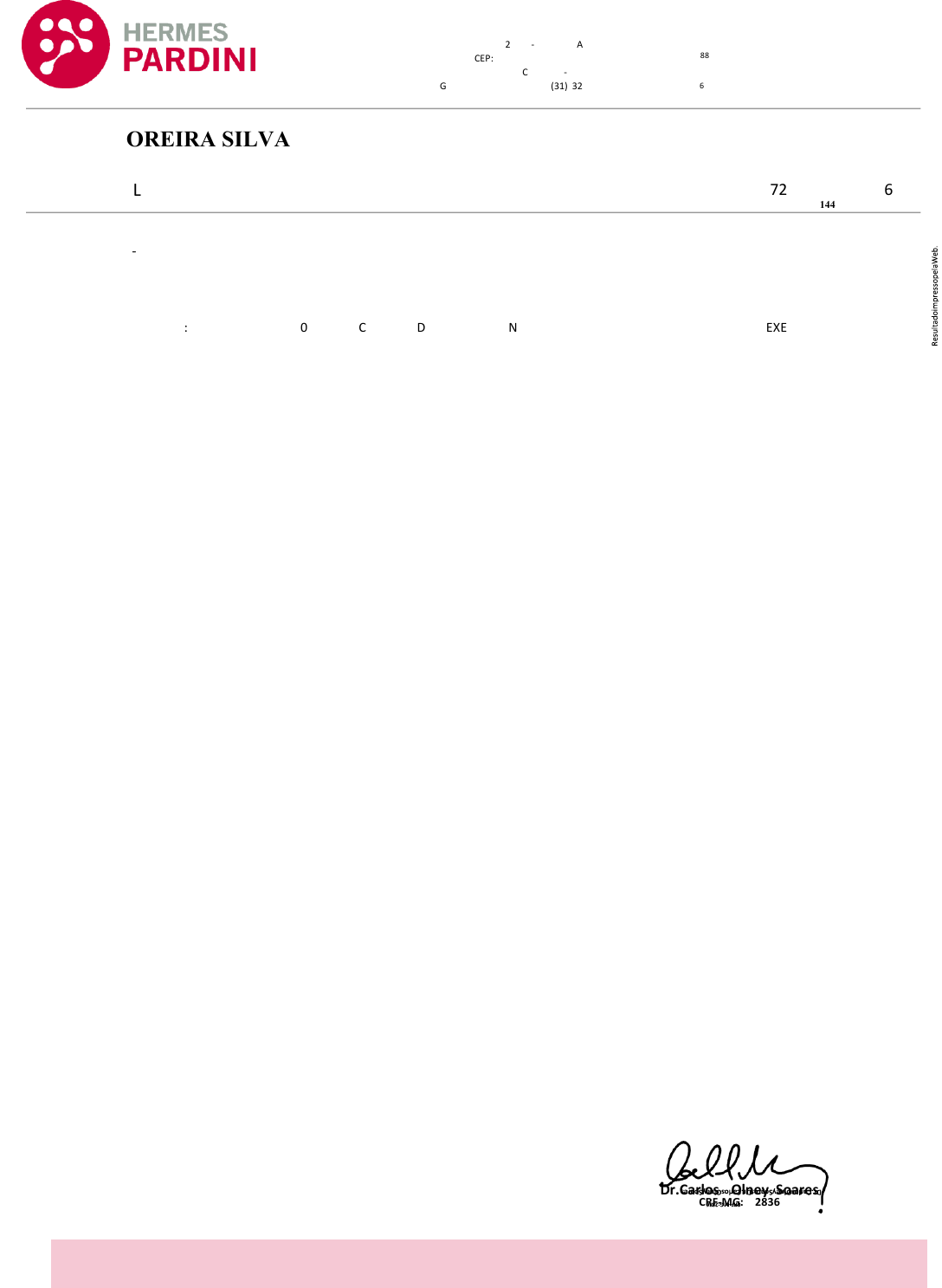 Este laudo foi assinado digitalmente sob o nro: 0405711CEEA7F699C1AFC10793F7F839 Os valores dos testes de laboratório sofrem influência de estados fisiológicos, patológicos, uso de medicamentos, etc. Somente seu clínico tem condições de interpretar corretamente estes resultados. Possuímos uma assessoria científica qualificada para discussão dos resultados laboratoriais com o clínico assistente. Dr.Carlos Olney Soares CRF-MG: 2836 POR METODOLOGIAS CONVENCIONAIS OU AUTOMATIZADAS (SISTEMA VITEK). RESULTADO: NÃO HOUVE CRESCIMENTO BACTERIANO. VALOR DE REFERÊNCIA: AUSÊNCIA DE CRESCIMENTO BACTERIANO. JOSE MOREIRA SILVA 06/04/1944 ( 78 anos) LAB.DE CLINICAS CLINBIO A 7206897- 10/03/2023 6 CAL 14461 Conveniado: Pedido No. no URINA - MATERIAL UROCULTURA CO ANTIBIOGRAMA [ DE REA NÃO AMOSTRA COLETA 07:00] 10/03/2023 : COLETA DA DATA EXECUTOR LIZADA PELO LABORATÓRIO DO EXAME MÉTODO: CULTIVO EM MEIOS ESPECÍFICOS. IDENTIFICAÇÃO E ANTI BIOGRAMA Nome Nascimento Data de Solicitante Entrada Data Pedido 6769888 CNES: A - 2448 Naıes, Das Av. End.: Portaria CEP:33201-003 Vespasiano-MG Guilherme Dr. - RT CRM-MG:35635 - Collares Birchal 3228-6200 (31) Geral/Atend.Domiciliar: Telefone CNPJ:19.378.769/0053-05 8899-16 CRM-MG: