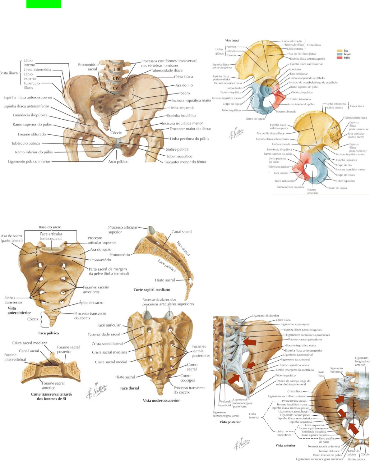 TRAUMA DE PELVE ANATOMIA - PELVE • 3 OSSOS: ➢ 2 OSSOS QUADRIL (INOMINADO) ➢ SACRO • 3 ARTICULAÇÕES ➢ 2 SACRO-ILÍACAS ➢ SÍNFISE PÚBICA • SACRO ➢ 5 VÉRTEBRAS FUSIONADAS ➢ 4 PARES DE FORAMES ➢ SAÍDA DOS NERVOS SACRAIS • CÓCCIX ➢ 4 VÉRTEBRAS FUSIONADAS ➢ PONTO DE FIXAÇÃO DOS MM. GLÚTEO MÁXIMO E COCCÍGEO ➢ LOCAL COMUM DE FRATURA - OSSO DO QUADRIL (INOMINADO) • 3 OSSOS FUNDIDOS: ➢ ÍLIO o CORPO o ASA ➢ ÍSQUIO o CORPO o TÚBER ➢ PÚBIS o RAMO SUPERIOR o RAMO INFERIOR • ACETÁBULO ➢ CAVIDADE ARTICULAR DO QUADRIL o PAREDE ANTERIOR o PAREDE POSTERIOR - LIGAMENTOS IMPORTANTES • SÍNFISE PÚBICA ➢ RESISTE ROTAÇÃO EXTERNA • ASSOALHO PÉLVICO ➢ LIGAMENTO SACROESPINAL o RESISTE ROTAÇÃO EXTERNA ➢ LIGAMENTO SACROTUBERAL o RESISTE CISALHAMENTO E FLEXÃO • LIGAMENTOS SACROILÍACOS o LIGAMENTO MAIS FORTE DO CORPO o ESTRUTURA MAIS IMPORTANTE PARA A ESTABLIDADE PÉLVICA ➢ ANTERIOR o RESISTE A ROTAÇÃO EXTERNA APÓS LESÃO DE ASSOALHO PÉLVICO E ESTRUTURAS ANTERIORES ➢ POSTERIOR o RESISTE AO DESVIO VERTICAL EXAME FÍSICO - PELVIC ROCK • EMPURRAR AMBAS AS CRISTAS ILÍACAS • AVALIAR LESÃO DO ANEL PÉLVICO • TESTE SÓ DEVE SER REALIZADO 1 VEZ - TESTE DE PATRICK • PATRICK (FABERE) ➢ FLEXÃO ➢ ABDUÇÃO ➢ ROTAÇÃO EXTERNA • DOR POSTERIOR • DOR NO QUADRIL • BLOQUEIO DE ROTAÇÃO - MERALGIA • PRESSÃO MEDIAL NA EIAS • DOR / QUEIMAÇÃO / DORMÊNCIA • COMPRESSÃO DO NCFL EXAMES COMPLEMENTARES → RADIOGRAFIA - SÉRIE PELVE • ANTEROPOSTERIOR ➢ FRATURAS SACRO ➢ ACETÁBULO ➢ FÊMUR PROXIMAL • INLET ➢ FRATURA ANEL PÉLVICO ➢ DESVIO POSTERIOR ➢ ALARGAMETNO SÍNFISE • OUTLET ➢ FRATURA DO ANEL PÉLVICO ➢ DESVIO SUPERIOR - JUDET • ALAR ➢ FRATURA ACETÁBULO ➢ COLUNA POSTERIOR ➢ PAREDE ANTERIOR • OBTURATRIZ ➢ FRATURA DO ACETÁBULO ➢ COLUNA ANTERIOR ➢ PAREDE POSTERIOR FRATURAS E LUXAÇÕES → FRATURASDO ANEL PÉLVICO - ALTA ENERGIA • ACIDENTES DE TRANSITO • ATROPELAMENTO • QUEDA DE GRANDE ALTURA - BAIXA ENERGIA • OSSOS OSTEOPÊNICOS • QUEDA • FRATURAS ESTÁVEIS ISOLADAS - ALTAS TAXAS DE MORBIDADE • HEMORRAGIA NÃO CONTROLADA ➢ FRATURAS DE LIVRO ABERTO (CAP 3) ➢ SANGRAMENTO VENOSO >ARTERIAL - COMPRESSÃO LATERAL É MAIS COMUM - INCIDÊNCIAS RADIOGRÁFICAS • INLET • OUTLET - AVALIAÇÃO EMERGÊNCIA • SANGRAMENTO RETAL E VAGINAL • COMPRESSÃO LATERAL DAS CRISTAS ILÍACAS ➢ AVALIAR ESTABILIDADE PÉLVICA • PACIENTE INSTÁVEL + ABERTURA DE ANEL → FIXAR PELVE • PROCURAR FOCOS DE SANGRAMENTO ➢ LAPAROTOMIA ➢ ANGIOGRAFIA - EXAMES COMPLEMENTARES • RADIOGRAFIA ➢ ANTEROPOSTERIOR ➢ INLET o DEFORMIDADE ROTACIONAL o DESVIO ANTEROPOSTERIOR ➢ OUTLET o DESLOCAMENTO VERTICAL • TOMOGRAFIA ➢ AVALIAÇÃO DE LESÕES POSTERIORES DO ANEL - CLASSIFICAÇÃO • ESTÁVEL ➢ RESISTE AS FORÇAS FISIOLÓGICAS SEM DESVIOS ➢ INTEGRIDADE DE ESTRUTURAS ÓSSEAS E ➢ LIGAMENTARES ➢ BAIXA ENERGIA ➢ FRATURA DO RAMO DO PÚBIS E ÍSQUIO ➢ AVULSÕES ÓSSEAS ➢ QUEBRA DE APENAS 1 PONTO DO ANEL • INSTÁVEL ➢ ROTACIONAL o ALARGAMENTO DA SÍNFISE PÚBICA o FRATURA DE RAMO PÚBICO >2,5CM ➢ VERTICAL o TRANSLAÇÃO SUPERIOR DA HEMIPELVE >1CM • YOUNG E BURGESS ➢ COMPRESSÃO ANTEROPOSTERIOR (CAP) o CAP I (ESTÁVEL) ✓ <2,5CM DIÁSTASE PÚBICA ✓ ESTRUTURAS POSTERIORES INTACTAS ✓ 1 OU 2 FRATURAS DE RAMOS PÚBICOS o CAP II (ROTACIONALMENTE INSTÁVEL) ✓ CONTINUAÇÃO DO TIPO I ✓ >2,5CM DE DIÁSTASE PÚBICA ✓ LESÃO LIGAMENTO SI ANTERIOR ✓ VERTICALMENTE ESTÁVEL o CAP III ✓ RUPTURA COMPLETA ✓ INSTÁVEL ROTACIONAL E VERTICALMENTE ✓ ANTERIOR (SÍNFISE) ✓ POSTERIOR (ASI) ❖ LESÃO LIGAMENTO SI ANTERIOR ❖ LESÃO LIGAMENTO SI POSTERIOR ➢ COMPRESSÃO LATERAL o CL I (ESTÁVEL) ✓ COMPRESSÃO SACRAL ✓ FRATURA DE RAMO IPSILATERAL o CL II (VERTICALMTTNE ESTÁVEL) ✓ CONTINUAÇÃO DA CL 1 ✓ FRATURA DA ASA DO ILIACO OU ✓ LESÃO POSTERIOR ASI o CL III (PELVE EM VENTANIA) ✓ CL II + CAP III ➢ CISALHAMENTO VERTICAL o LIGAMENTOS SACROILIACO o LIGAMENTOS SACROTUBERAL o LIGAMENTOS SACROESPINAL o FRATURAS DOS RAMOS - TRATAMENTO • CONSERVADOR ➢ FRATURAS DE ANEL PÉLVICO ESTÁVEIS o CL I o CAP I o FRATURA DOS RAMOS ➢ CARGA DE ACORDO COM A DOR • CIRÚRGICO ➢ FRATURAS INSTÁVEIS o CAP II E III o CL II E III o VERTICAL ➢ ANTERIOR o RAFI: SÍNFISE ➢ POSTERIOR o RAFI DA ASA DO ILÍACO E SACRAIS o PARAFUSOS SI PARA LUXAÇÃO DA ASI → FRATURAS DO SACRO - DEFINIÇÃO • QUEDA – IDOSOS • ALTA ENERGIA – JOVENS • GERALMENTE ASSOCIADO A FRATURA DA • PELVE • TOMOGRAFIA ➢ MELHOR IDENTIFICAÇÃO DA FRATURA • PODE LESAR RAIZ DOS NERVOS SACRAIS - CLASSIFICAÇÃO • VERTICAL ➢ ZONAS DE DENIS o ZONA 1 ✓ MAIS COMUM o ZONA 2 ✓ ATRAVÉS DOS FORAMES o ZONA 3 ✓ MEDIAL AO FORAME ✓ ALTO RISCO DE LESÃO NEUROLÓGICA ❖ BEXIGA ❖ INTESTINO ❖ DISFUNÇÃO SEXUAL • TRANSVERSA ➢ ALTA INCIDÊNCIA DE LESÃO NEUROLÓGICA • OBLÍQUA • COMPLEXA - TRATAMENTO • CONSERVADOR ➢ MINIMAMENTE DESVIADO ➢ ESTÁVEL • CIRÚRGICO ➢ DESVIADO / INSTÁVEL ➢ REDUÇÃO E FIXAÇÃO → FRATURAS DO ACETÁBULO - DEFINIÇÃO • TRAUMA DE ALTA ENERGIA • CABEÇA DO FÊMUR CONTRA O ACETÁBULO • PADRÃO DE FRATURA DETERMINADO PELO • VETOR DE FORÇA E POSIÇÃO DO FEMUR NO • IMPACTO • RADIOGRAFIAS: ➢ PELVE AP ➢ ALAR ➢ OBTURATRIZ • TC MELHOR DEFINIÇÃO DA FRATURA - CLASSIFICAÇÃO • LETOURNEL E JUDET ➢ ELEMENTARES o PAREDE ANTERIOR o PAREDE POSTERIOR o COLUNA ANTERIOR o COLUNA POSTERIOR o TRANSVERSAL ➢ ASSOCIADAS o COLUNA + PAREDE POSTERIOR o TRANSVERSA + PAREDE POSTERIOR o TIPO T o COLUNA ANTERIOR + HEMITRANSVERSA POSTERIOR o AMBAS AS COLUNAS] - EXMES COMPLEMENTARES • SÉRIE RADIOGRÁFICA ➢ ANTEROPOSTERIOR DA BACIA ➢ SÉRIE JUDET o OBLÍQUA ALAR o OBLÍQUA OBTURATRIZ • TOMOGRAFIA ➢ MELHOR AVALIAÇÃO DA FRATURA - TRATAMENTO • CONSERVADOR ➢ SEM CARGA POR 6-12 SEMANAS ➢ <2MM DESVIO ARTICULAR ➢ CÚPULA DO ACETÁBUL