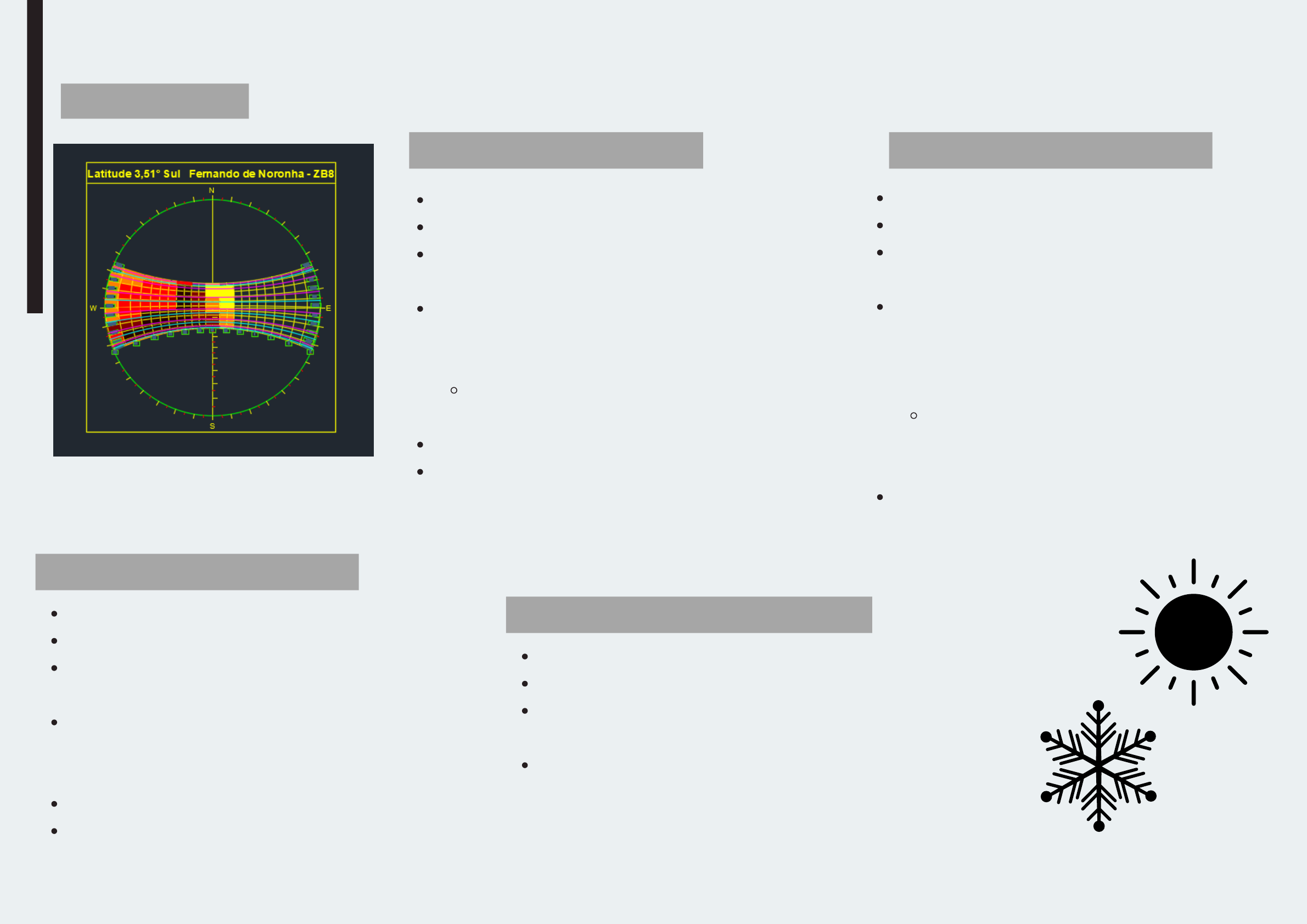 CARTA SOLAR FERNANDO DE NORONHA Ocorre a partir do dia 22 de junho O sol nasce a quase Nordeste O sol surge no céu um pouco depois das 6 da manhã As temperaturas se mantém na zona de temperatura neutra por toda amnhã, mas a tarde ficam um pouco acima. O sol se põe um pouco depois das 18:00 As tardes são quentes. SOLSTÍCIO DE INVERNO Ocorre a partir do dia 22 de dezembro O sol nasce quase a Nordeste O sol surge no céu, um pouco depois das 6 da manhã. Até o mês de fevereiro a temperatura se encontra bem acima da temperatura neutra, no horário de 12;00. horário o qual a incidência solar é maior sobre nós. O sol se põe um pouco antes das 18:00 As tarde são bem quentes SOLSTÍCIO DE VERÃO Ocorre a partir do dia 24 de setembro O sol nasce exatamente a Leste O sol surge no céu exatamente ás 6 da manhã. Setembro, Outubro, Novembro tem tardes bem quentes e manhãs mais frescas. EQUINÓCIO DE PRIMAVERA Ocorre a partir de 21 de março O sol nasce exatamente a Leste O sol surge no céu exatamente ás 6 da manhã. Março e começo de Abril tem temperaturas mais frescas no horário de 12:00, se comparadas com o resto da tarde dos mesmos dias. durante a tarde do mesmo período, as temperaturas se encontram bem acima da temperatura neutra. As tardes são bem quentes EQUINÓCIO DE OUTONO ISADORA COSTA 223375
