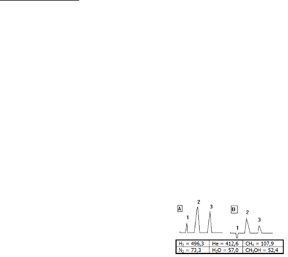 Departamento de Química – ICEx - UFMG QUI624 – QUÍMICA ANALÍTICA INSTRUMENTAL F LISTA DE EXERCÍCIOS DE CROMATOGRAFIA I - CROMATOGRAFIA GASOSA 1) Por que e como se usa padrão interno em cromatografia? (artigo esclarecedor - Quím. Nova vol.32 no.5 São Paulo 2009) 2) Quais são os critérios para escolha de uma substância para que seja usada como padrão interno em cromatografia? 3) Dentre as alternativas abaixo, a única determinação quantitativa que é impossível se fazer por cromatografia gasosa com detector por ionização em chama (DIC) é o teor de: A ( ) metanol em bebidas alcoólicas. B ( ) octano em gasolina. C ( ) mentol (monoterpeno) em creme para a pele. D ( ) metano em gases provenientes de biodegradação. E ( ) vapor d’água no ar atmosférico. 4) Correlacione as colunas: 1- Injetor ( ) Compõe a fase móvel na CG 2- Gás de arraste ( ) Promove a separação cromatográfica 3- Manômetro ( ) Vaporiza a amostra 4- Coluna ( ) Promove o aquecimento da coluna cromatográfica 5- Forno ( ) Envia sinal elétrico para o amplificador 6- Detector ( ) Controla a pressão do gás 5) Os cromatogramas A e B foram obtidos a partir de mistura com concentrações molares iguais de CH4, CH3OH e H2O, injetados em isoterma (100ºC) em coluna de característica polar, com detector de condutividade térmica e um tipo de gás de arraste para cada cromatograma (considere demais condições cromatográficas iguais). Com base na intensidade dos sinais obtidos, na ordem de saída provável e nos valores de condutividade térmica da tabela (cal.s-1.cm-1.K-1), os gases de arraste em cada cromatograma são, respectivamente: ( ) He e N2 ( ) N2 e He ( ) H2 e He ( ) He e H2 ( ) N2 e H2 6) Um detector termossensível baseia-se no fato de que a resistividade de um filamento varia com a temperatura, emitindo então sinais que são registrados. Isto faz com que eles sejam universais, pois não respondem a nenhuma propriedade da substância, mas sim da mistura gasosa que passa por ele em função do tempo. De acordo com isso marque V ou F nos itens a seguir: ( ) Duas substâncias com mesma concentração fornecerão um mesmo sinal no detector. ( ) A troca um detector desta natureza por um outro que seja seletivo afeta o tempo de retenção. ( ) Uma substância em maior concentração que outra dará um sinal maior neste tipo de detector. 7) Na cromatografia gasosa, o tempo de retenção é determinado por alguns parâmetros. Para substâncias com peso molecular próximo, portanto, tem maior tempo de retenção aquela que: ( ) mais interage com a fase estacionária. ( ) tem menor pressão de vapor. ( ) menos interage com a fase móvel. ( ) for mais polar. 8) Por que, nas fases estacionárias usadas em CG, o tempo de retenção nas séries homólogas é maior quanto mais pesada for a substância, independentemente da polaridade da fase utilizada? 9) Marque, dentre as alternativas abaixo, a única análise qualitativa que é impossível de ser realizada por cromatografia a gás. Justifique sua resposta. A- ( ) metanol em bebidas alcoólicas. B- ( ) n-octano em gasolina. C- ( ) sulfato em água mineral. D- ( ) óxido nitroso em ar atmosférico poluído. E- ( ) metano em gases proveniente de biodegradação. 10) Para fazer uma análise cromatográfica, um analista inexperiente injetou 1,0 µL de uma substância pura X (grau PA) e após um determinado tempo observou a formação do cromatograma 1 com duas bandas. Surpreso com o resultado obtido, reinjetou a referida substância pura nas mesmas condições cromatográficas, obtendo o cromatograma 2. Explique o aparecimento do sinal com menor tempo de retenção no cromatograma 1. 11) Assinale o parâmetro cromatográfico que quando é alterado não afeta o tempo de retenção de uma determinada substância. A- ( ) temperatura do forno das colunas. D- ( ) polaridade da fase estacionária. B- ( ) vazão do gás de arraste. E- ( ) % de fase estacionária no suporte sólido. C- ( ) temperatura do detector. 12) Prediga uma ordem de saída dos componentes das amostras abaixo em carbowax (polar) e em esqualano (apolar), utilizando He como gás de arraste. Justifique a sua resposta: A) EtOH, n -PrOH, n -hexano, n -pentano e n -heptano B) EtOH, n -PrOH, MeOH e nbutanol C) Benzeno, tolueno e cicloexano 13) Desenhe o esquema de um cromatógrafo a gás e explique a função de cada uma de suas partes. 14) Um alcoólatra teve morte súbita provocada após a ingestão de whisky falsificado. O laudo médico deu como causa da morte intoxicação por metanol. O químico do laboratório tinha, portanto, que dosar o metanol na bebida para servir de prova no processo de falsificação. Fez-se uma solução contendo 50,0 mg/mL de MeOH em EtOH puro (sol. A) e outra contendo 40,0 mg/mL de benzeno em EtOH puro (sol. B). A partir dessas soluções foram preparados padrões em balão volumétrico de 100,00 mL (ver os volumes de alíquota correspondentes na tabela abaixo). Pesou-se, então, 10,3520 g do whisky, adicionou-se 20,00 mL da solução B e avolumou-se a 100,00 mL com etanol puro (sol. H). Injetou-se 1,0 µL dos padrões C, D, E , F e G e da solução H, obtendo-se as seguintes áreas pelo integrador eletrônico: a) Determine o teor de metanol no whisky. b) Por que áreas pertinentes ao benzeno em todas as soluções analisadas não são as mesmas, apesar das concentrações serem iguais? Explique, também, porque isso não afeta o cálculo quantitativo. 15) O volume de 1,0 µL de uma mistura de 0,537 g de n-butanol e 0,497 g de dioxano foi injetado em coluna carbowax (polar) em cromatógrafo à gás, obtendo-se áreas de 1040 para o n-butanol e 1270 para o dioxano. A injeção de 5,0 µL de uma mistura desconhecida das mesmas substâncias nas mesmas condições cromatográficas forneceu as áreas de 4004 e 2280, respectivamente. Determine a concentração (% v/v) de cada solvente na mistura desconhecida. Dados de densidade (g/mL) : n-butanol= 0,810; dioxano= 1,034. 16) 