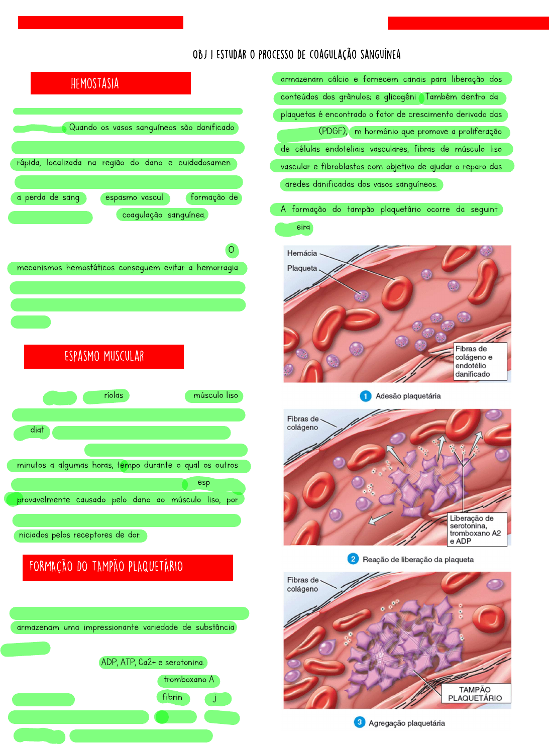 É uma sequência de respostas que interrompe o sangramento. Quando os vasos sanguíneos são danificados ou sofrem ruptura, a resposta hemostática precisa ser rápida, localizada na região do dano e cuidadosamente controlada para que seja efetiva. Três mecanismos reduzem a perda de sangue: (1) espasmo vascular, (2) formação de tampão plaquetário e (3) coagulação sanguínea. Quando bem-sucedida, a hemostasia evita hemorragia, que consiste na perda de grande volume de sangue dos vasos. Os mecanismos hemostáticos conseguem evitar a hemorragia de vasos sanguíneos pequenos, porém as hemorragias substanciais de vasos maiores demandam intervenção médica. Quando artérias ou arteríolas são danificadas, o músculo liso arranjado de forma circular em suas paredes contrai-se de imediato, uma reação chamada de espasmo vascular. O espasmo vascular reduz a perda de sangue por vários minutos a algumas horas, tempo durante o qual os outros mecanismos hemostáticos entram em ação. O espasmo é provavelmente causado pelo dano ao músculo liso, por substâncias liberadas de plaquetas ativadas e por reflexos iniciados pelos receptores de dor. Considerando seu tamanho pequeno, as plaquetas armazenam uma impressionante variedade de substâncias químicas. Dentro de muitas vesículas são encontrados fatores de coagulação, ADP, ATP, Ca2+ e serotonina. Também estão presentes enzimas que produzem tromboxano A2, uma prostaglandina; fator estabilizador da fibrina, que ajuda a fortalecer o coágulo sanguíneo; lisossomos; algumas mitocôndrias; sistemas de membrana que captam e armazenam cálcio e fornecem canais para liberação dos conteúdos dos grânulos; e glicogênio. Também dentro das plaquetas é encontrado o fator de crescimento derivado das plaquetas (PDGF), um hormônio que promove a proliferação de células endoteliais vasculares, fibras de músculo liso vascular e fibroblastos com objetivo de ajudar o reparo das paredes danificadas dos vasos sanguíneos. A formação do tampão plaquetário ocorre da seguinte maneira. HEMOSTASE Inicialmente, as plaquetas entram em contato e se fixam a partes do vaso sanguíneo danificado, como fibras de colágeno do tecido conjuntivo subjacente às células endoteliais danificadas. Esse processo é chamado de adesão plaquetária. Essa adesão ativa as plaquetas e suas características mudam de maneira drástica. As plaquetas estendem muitas projeções que possibilitam entrar em contato e interagir umas com as outras; as plaquetas começam a liberar os conteúdos das suas vesículas. Essa fase é chamada de reação de liberação das plaquetas. O ADP liberado e o tromboxano A2 desempenham um papel essencial na ativação das plaquetas vizinhas. A serotonina e o tromboxano A2 atuam como vasoconstritores, promovendo e sustentando a contração do músculo vascular liso, o que diminui o fluxo de sangue pelo vaso lesado. A liberação de ADP torna as outras plaquetas da área visguentas, e essa condição das plaquetas recém-recrutadas e ativadas promove sua adesão às plaquetas originalmente ativadas. Essa aglomeração de plaquetas é chamada de agregação plaquetária. Por fim, o acúmulo e a fixação de numerosas plaquetas formam uma massa chamada de tampão plaquetário. O tampão plaquetário é muito eficaz na prevenção da perda de sangue no vaso pequeno. Embora inicialmente o tampão plaquetário seja frouxo, ele passa a ser bastante firme quando é reforçado por filamentos de fibrina formados durante a coagulação (ver Figura 19.10). O tampão plaquetário pode cessar a perda de sangue por completo se o orifício no vaso sanguíneo não for muito grande. Normalmente, o sangue permanece em seu estado líquido enquanto se encontra no interior dos vasos sanguíneos. Se for coletado do corpo, no entanto, torna-se espesso e forma um gel. Por fim, o gel se separa do líquido. O líquido de cor palha, chamado soro, é simplesmente plasma sanguíneo sem as proteínas de coagulação. O gel é chamado de coágulo sanguíneo, que consiste em uma rede de fibras proteicas insolúveis chamadas de fibrina, na qual os elementos figurados do sangue são aprisionados O processo de formação do gel, chamado de coagulação, consiste em uma série de reações químicas que culmina na formação de filamentos de fibrina. Se o sangue coagula com muita facilidade, uma das consequências pode ser trombose – coagulação em um vaso sanguíneo não danificado. Se o sangue demora muito tempo para coagular, pode ocorrer hemorragia. Na parte do coagulo ésófalar que o coagul, éum monte de reações químices que muda a forma do sangue para evitar sangramentos. A coagulação envolve inúmeras substâncias conhecidas como fatores de coagulação. Esses fatores incluem os íons cálcio (Ca2+), várias enzimas inativas sintetizadas por hepatócitos e liberadas na corrente sanguínea e diversas moléculas associadas às plaquetas ou liberadas pelos tecidos danificados. A maioria dos fatores de coagulação é identificada por numerais romanos que indicam a ordem da sua descoberta (não necessariamente a ordem da sua participação no processo de coagulação). TABELA VAI ESTAR NO QUADRO. A coagulação consiste em uma cascata complexa de reações enzimáticas na qual cada fator de coagulação ativa várias moléculas do fator seguinte em uma sequência fixa. Por fim, forma-se a proteína insolúvel fibrina. A coagulação pode ser dividida em três estágios. A via extrínseca da coagulação sanguínea apresenta menos etapas que a via intrínseca e ocorre rapidamente – em uma questão de segundos se o traumatismo for importante. É assim chamada porque uma proteína tecidual chamada de fator tecidual (FT), também conhecida como tromboplastina, passa para o sangue a partir de células do lado de fora dos vasos sanguíneos (extrínsecas aos) e inicia a formação da protrombinase. O FT é uma mistura complexa de lipoproteínas e fosfolipídios li