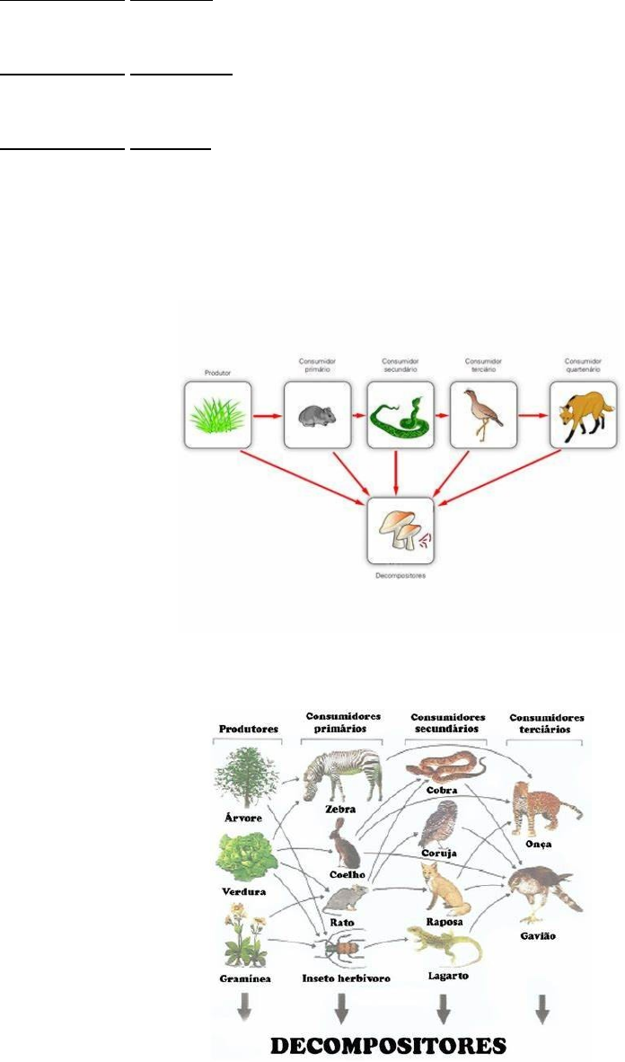 CADEIA E TEIA ALIMENTAR A cadeia alimentar é uma sequência de seres vivos em que um serve de alimento para outro. Os seres vivos e o meio ambiente transferem e trocam continuamente energia e matéria. A cadeia alimentar apresenta um fluxo unidirecional, ou seja, apresenta apenas uma direção. Componentes da cadeia alimentar: Seres produtores: São os seres autótrofos, ou seja, produzem seu próprio alimento e estão na base da cadeia alimentar Seres consumidores: São heterótrofos, pois se alimentam de outros seres vivos. · Consumidores primários: São animais classificados como herbívoros que se alimentam de planta e os onívoros que se alimentam de planta e outros animais. · Consumidores secundários: São os animais que se alimentam dos consumidores primários, que podem ser classificados como carnívoros, pois se alimentam de outros animais · Consumidores terciários: São os animais que se alimentam dos consumidores secundários e também podem ser classificados como carnívoros e estão no topo da cadeia. Seres decompositores: São os seres vivos que se alimentam da matéria orgânica dos seres morto, por exemplos, os fungos, bactérias. Porém, alguns decompositores como as minhocas pode ser classificados como detritívoros pois se alimentam de detritos, isto é de restos orgânicos. A teia alimentar conjunto de várias cadeias alimentares de um ecossistema. Assim, a teia não apresenta um fluxo unidirecional, como a cadeia alimentar, pois mostra que um mesmo organismo pode apresentar diferentes hábitos alimentares ATIVIDADE Na cadeia alimentar planta → gafanhoto → sapo → cobra → fungos e bactérias, o sapo é considerado um: a) produtor b) consumidor secundário c) decompositor d) consumidor primário 2) Onça-pintada é o maior felino das Américas e está ameaçada de extinção. A situação foi ainda mais agravada pelas recentes queimadas no Pantanal, que afetaram diretamente essa espécie, ao serem atingidas pelo fogo, e indiretamente pela escassez de água e alimento. As onças-pintadas, que estão no topo da cadeia alimentar, são capazes de controlar a população de animais pertencentes a níveis tróficos inferiores, pois a) São seres heterótrofos e exclusivamente consumidores secundários. b) São seres carnívoros e possuem uma alimentação variada. c) São consumidores e possuem herbívoros como presas. 3) As cadeias alimentares mostram as relações de alimentação observadas em um ecossistema. Sobre as cadeias alimentares, marque a alternativa correta. a) Nas cadeias alimentares, um mesmo organismo pode ocupar diferentes níveis tróficos. b) As cadeias alimentares sempre se iniciam com os decompositores. c) Consumidores secundários são sempre herbívoros. d) Nas cadeias alimentares, observa-se o fluxo unidirecional dos nutrientes e da energia. 4) Sobre a águia na teia alimentar abaixo é correto afirma que: a) Ela é um ser heterótrofo e se alimenta apenas de seres onívoros. b) Ela Se alimenta apenas de consumidores primários. c) Ela pode ocupar mais de um nível trófico em uma teia alimentar.