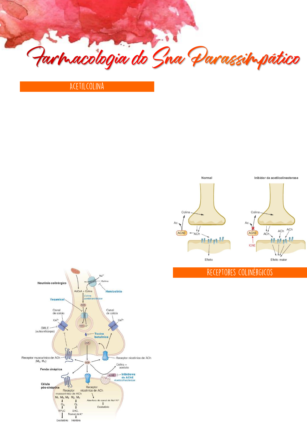Leonardo Vinícius Ribeiro Moreira BBPM III - Farmacologia A farmacologia colinérgica trata das propriedades do neurotransmissor acetilcolina (ACh). As funções das vias colinérgicas são complexas, porém envolvem geralmente a junção neuromuscular (JNM), o sistema nervoso autônomo e o sistema nervoso central. A acetilcolina é sintetizada em uma única etapa a partir da colina e da acetil coenzima A (acetil-CoA) pela enzima colina acetiltransferase (ChAT): Acetil-CoA + Colina → Acetilcolina Uma vez sintetizada no citoplasma, a ACh é transportada até o interior de vesículas sinápticas para armazenamento. A liberação de ACh na fenda sináptica ocorre por meio da fusão da vesícula sináptica com a membrana plasmática A ACh é degradada na fenda sináptica pela acetilcolinesterase (AChE) de forma rápida e a colina liberada sob sua ação é eficientemente transportada de volta à terminação pré-sináptica. Os agentes anticolinesterásicos diminuem a degradação da ACh e aumentam sua concentração na fenda sinática. Dessa forma, essa classe pode ser explorada na clínica. Uma vez liberada na fenda sináptica, a ACh liga-se a uma de duas classes de receptores, localizados habitualmente sobre a superfície da membrana da célula pós-sináptica: Receptores nicotínicos; Receptores muscarínicos. Os receptores nicotínicos são ionotrópicos, ou seja, estão ligados a canais iônicos e são encontrados principalmente na junção neuromuscular (JNM). Quando um agonista nicotínico se liga nesse receptor nessa região, ocorre a contração muscular. Leonardo Vinícius Ribeiro Moreira BBPM III - Farmacologia Já os receptores muscarínicos estão acoplados a proteína G e a transmissão colinérgica muscarínica ocorre principalmente: Gânglios autônomos; Vísceras; Musculatura lisa; Tecido glandular. Os receptores M1, M3 e M5 estão acoplados a proteínas G responsáveis pela estimulação da fosfolipase C. Por outro lado, os receptores M2 e M4 estão acoplados a proteínas G responsáveis pela inibição da adenilciclase e pela ativação dos canais de potássio. Receptores 1, 3 e 5: excitatórios; Receptores 2 e 4: inibitórios. Em geral, o receptor M1 é expresso nos neurônios corticais e gânglios autônomos; os receptores M2, no músculo cardíaco, e os receptores M3, em músculo liso e tecido glandular. Como a estimulação de M1, M3 e M5 facilita a excitação da célula, enquanto a estimulação de M2 e M4 suprime a excitabilidade celular, existe uma correlação previsível entre o subtipo de receptor e o efeito da ACh sobre a célula. A ACh se liga a receptores M2 presentes na fibra muscular cardíaca e provoca: Inotropismo negativo; Cronotropismo negativo; Dromotropismo negativo. Dessa forma, ocorre a diminuição da força e da frequência cardíaca. A ACh se liga a receptores M3 presentes nesse sistema e provoca: Broncoconstrição; Aumento de secreções (muco) na traqueia e nos brônquios. A ACh se liga ao receptor M3 presente na bexiga e provoca: Contração do músculo detrusor; Relaxamento do esfíncter interno. A ACh se liga em receptores M3 presentes no TGI provocando: Aumento da amplitude das contrações; Aumento das secreções gástricas e intestinais. A ACh se liga a receptores M3 presentes no tecido glandular, aumentando a secreção de diversos locais, como glândulas: Lacrimais; Sudoríparas; Salivares; Nasofaríngeas. A ACh se liga a receptores M3 presente nos olhos e provoca: Contração do mm. esfíncter da pupila (miose); Contração do músculo ciliar (acomodação para perto). Os fármacos colinérgicos e anticolinérgicos são usados principalmente para: Modulação do TGI; Xerostomia (boca seca); Glaucoma; Cinetose (e antieméticos); Doenças neuromusculares; Leonardo Vinícius Ribeiro Moreira BBPM III - Farmacologia Bloqueio neuromuscular agudo e reversão durante cirurgia; Bloqueio ganglionar durante dissecção aórtica; Distonias (como torcicolo); Midríase; DPOC (broncodilatadores); Espasmos vesicais e incontinência urinária; Doença de Alzheimer, disfunção cognitiva e demência. Esses agentes degradam a AChE e, consequentemente, aumentam o tempo da ACh na fenda sináptica. São divididos em: Ação curta: edrofônio; Ação intermediária: neo e fisostigmina; Irreversíveis: organofosforados e ecotiopato; O edrofônio é usado no teste de Miastenia grave, doença que afeta a JNM. O edrofônio inibe a AChE por meio de sua associação reversível com o sítio ativo da enzima e esse complexo persiste por apenas 2 a 10 min, ocasionando bloqueio relativamente rápido, porém totalmente reversível. Já a neostigmina, piridostigmina, etc. melhoram o sintoma de força muscular, pois permanece por mais tempo inibindo a AChE e aumentando a ação da ACh. Além disso, esses fármacos são usados no glaucoma, tendo sudorese, bradicardia e piora da asma como efeitos colaterais. Os organofosforados possuem usos clínicos, como no caso do etiopato, também usado no glaucoma. Porém, possui risco intoxicação (defensivos agrícolas) por terem efeitos sobre o coração e músculos. OBS: para reverter, usa-se pralidoxima, reativador da AChE. Os agonistas colinérgicos também podem ser chamados de: Parassimpaticomiméticos Isso se deve ao fato de que esses fármacos imitam a ação da acetilcolina. A succinilcolina (suxametônio) possui alta afinidade com os receptores nicotínicos e é resistente à AChE. É utilizada para induzir paralisia durante a cirurgia por meio de bloqueio despolarizante. Quando administrado, ocorre uma despolarização persistente que provoca uma dessenssibilização, porém com menor tempo de duração. Essa ação despolarizante prova fasciculação (espasmos) e dor muscular subsequente. Os agonistas muscarínicos são ésteres de colina, moléculas com carga elétrica e hidrofílicas. Possuem baixa absorção por VO e pouca distribuição ao SNC. São eles: Betanecol; Metacolina; Carbacol; Muscarina; Pilocarpina