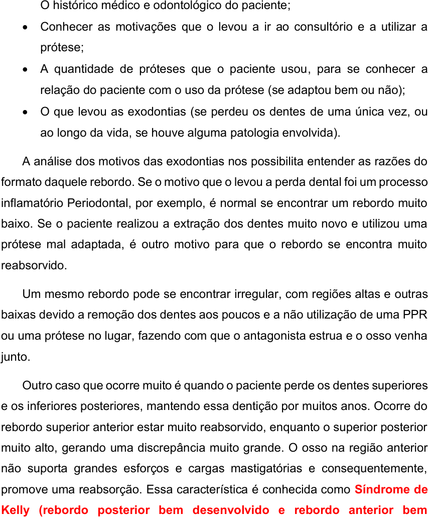 AULA 01: Anteriormente ao início da confecção da prótese para o paciente é necessário realizar perguntas a fim de se conhecer melhor sobre ele. Essas perguntas possibilita a nós Cirurgiões-dentistas conhecer: • O histórico médico e odontológico do paciente; • Conhecer as motivações que o levou a ir ao consultório e a utilizar a prótese; • A quantidade de próteses que o paciente usou, para se conhecer a relação do paciente com o uso da prótese (se adaptou bem ou não); • O que levou as exodontias (se perdeu os dentes de uma única vez, ou ao longo da vida, se houve alguma patologia envolvida). A análise dos motivos das exodontias nos possibilita entender as razões do formato daquele rebordo. Se o motivo que o levou a perda dental foi um processo inflamatório Periodontal, por exemplo, é normal se encontrar um rebordo muito baixo. Se o paciente realizou a extração dos dentes muito novo e utilizou uma prótese mal adaptada, é outro motivo para que o rebordo se encontra muito reabsorvido. Um mesmo rebordo pode se encontrar irregular, com regiões altas e outras baixas devido a remoção dos dentes aos poucos e a não utilização de uma PPR ou uma prótese no lugar, fazendo com que o antagonista estrua e o osso venha junto. Outro caso que ocorre muito é quando o paciente perde os dentes superiores e os inferiores posteriores, mantendo essa dentição por muitos anos. Ocorre do rebordo superior anterior estar muito reabsorvido, enquanto o superior posterior muito alto, gerando uma discrepância muito grande. O osso na região anterior não suporta grandes esforços e cargas mastigatórias e consequentemente, promove uma reabsorção. Essa característica é conhecida como Síndrome de Kelly (rebordo posterior bem desenvolvido e rebordo anterior bem reabsorvido, normalmente está acompanhado das hiperplasias no Fundo de Vestíbulo e extrusão dos dentes antagonistas inferiores). [Google:] Síndrome de Kelly: Conjunto de características marcantes que ocorrem quando uma maxila desdentada se opõe a dentes anteriores inferiores naturais. Essa condição clínica é comumente encontrada em pacientes que fazem o uso de prótese total superior que oclui com dentes naturais anteriores inferior e próteses parcial removível bilateral inferior. É caracterizada pela perda óssea na região anterior do rebordo superior, extrusão dos dentes naturais anteriores inferiores e hiperplasia. Anamnese: Exame de caráter subjetivo no qual o paciente expõe: • Os motivos que o levaram ao profissional; • Os motivos da perda dos dentes; • A quanto tempo se encontra desdentado; • Sua opinião sobre a Prótese Total; • Estado geral de sua saúde (histórico Médico e Odontológico): é importante saber sobre o histórico médico do paciente para conhecer se há alterações sistêmicas que poderão interferir no planejamento e tratamento; • Queixa principal; • Hábitos parafuncionais (ex: bruxismo, apertamento): é possível perceber na análise da prótese antiga: próteses fraturadas, dentes quebrados, próteses remendadas. Pode ser necessário um tratamento complementar: acompanhamento psicológico, terapia, confecção de placa mio-relaxante sobre a prótese, confecção de uma estrutura metálica no interior da prótese em acrílico para não fraturar. O objetivo da Anamnese é auxiliar na execução do planejamento. Ela possibilita analisar o paciente e através de suas opiniões e respostas determinar se ele irá colaborar, se irá adaptar com o uso da prótese, se houve uma experiência boa ou ruim com próteses anteriores e se ele está motivado. É necessário esclarecer ao paciente a real necessidade da confecção de uma nova prótese, devendo dar uma motivação para o paciente, pois caso contrário ele não irá usar por estar acostumado com a antiga. A prótese nova no início é um pouco desconfortável para o paciente, mas com o ajuste e o aprendizado do seu uso ela vai melhorando. Por que a prótese antiga deve ser trocada? A prótese quando muito usada encontra-se baixa, com dentes desgastados. Se houve um desgaste há alteração na Dimensão Vertical de Oclusão (DVO). Toda vez que há diminuição nessa altura, isso é: nessa distância que a mandíbula fica da maxila, a mandíbula como osso único irá se projetar para frente, e ao se projetar o Côndilo, o Disco, os Ligamentos e a Musculatura se deslocam na Fossa Articular para uma posição incorreta que deveriam estar, causando uma desordem que pode ser sintomática (gera dor) ou não. Normalmente o paciente que se encontra nessa situação apresenta o queixo projetado para frente: “queixo de bruxa”. ** A estabilidade que os dentes dão a mandíbula em relação a maxila é extremamente importante. ** O sucesso da Prótese não está somente associada aos conhecimentos do dentista, mas também a responsabilidade, a vontade que o paciente tem de utilizar as próteses. * Capítulo 1. Livro do Côrrea – Alterações Sistêmicas * Exame Físico: Exame Extra-oral • Aspecto facial • Cor da pele da face (pálido, desidratado) • Presença de cicatrizes • Exoftalmia (olhos saltados – pacientes com problemas renais) • Assimetria facial • Prognatismo (projeção da mandíbula) - Disfunção temporomandibular (análise da ATM); - Análise da Dimensão Vertical de Oclusão (DVO) – Distância da mandíbula até a Maxila quando o paciente está ocluindo (ideal, menor, quanto é necessário aumentar de forma progressiva). - Em Prótese Total quando estabelecida a oclusão do paciente NÃO se pode fazer em Guia Canina e Incisiva. Quando o paciente faz protrusão deve-se ter contato com dentes anteriores e pelo menos um contato de cada lado nos posteriores (Oclusão Balanceada Bilateral). Portanto: Paciente normal, dentado = Oclusão Mutuamente Protegida (Lateralidade: Guia Canino ou Guia de grupo; Protrusão: Anteriores desocluindo os posteriores). Prótese Total, paciente edentado = Oc