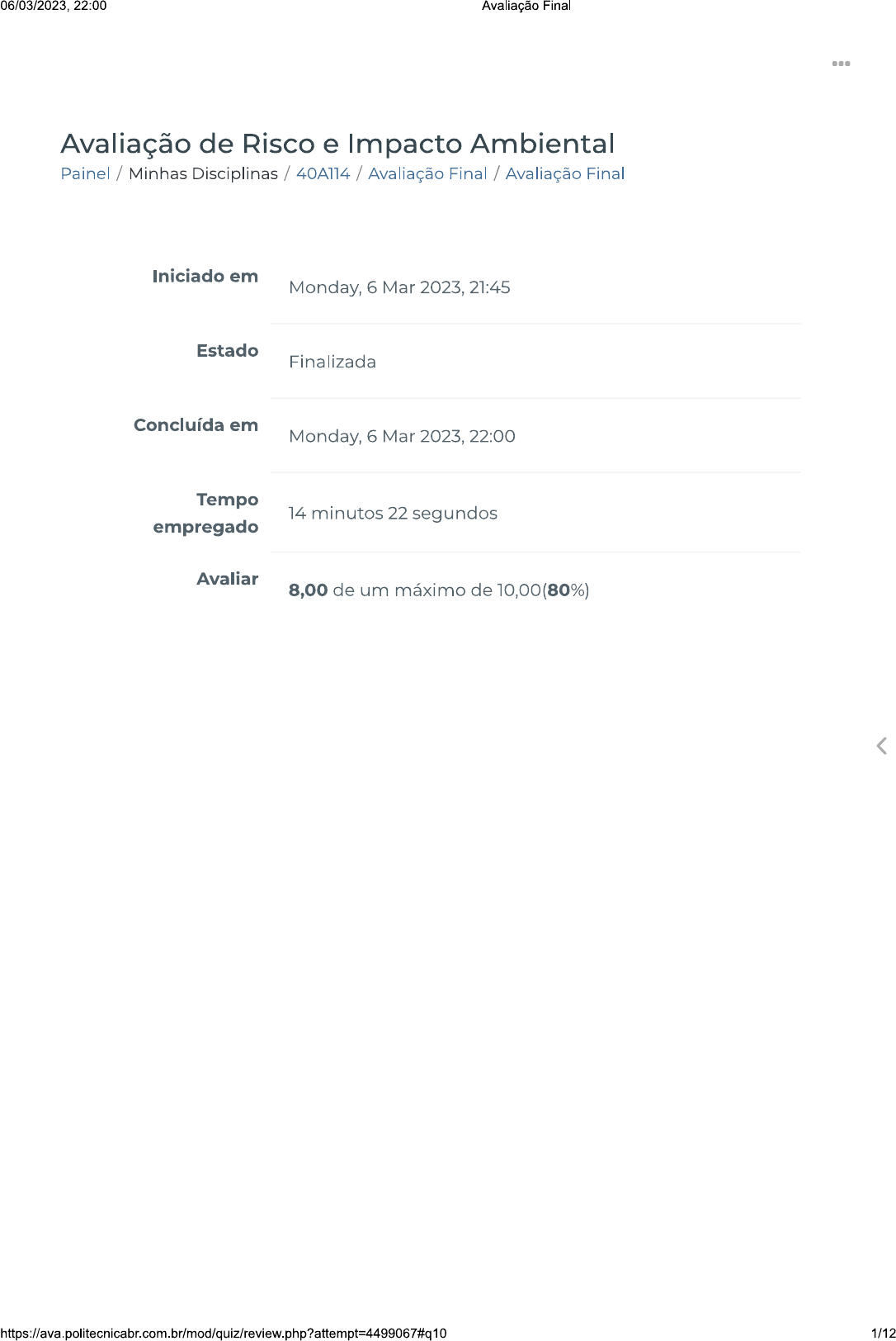 AVALIAÇÃO DE RISCO E IMPACTOS AMBIENTAIS - Avaliação Final