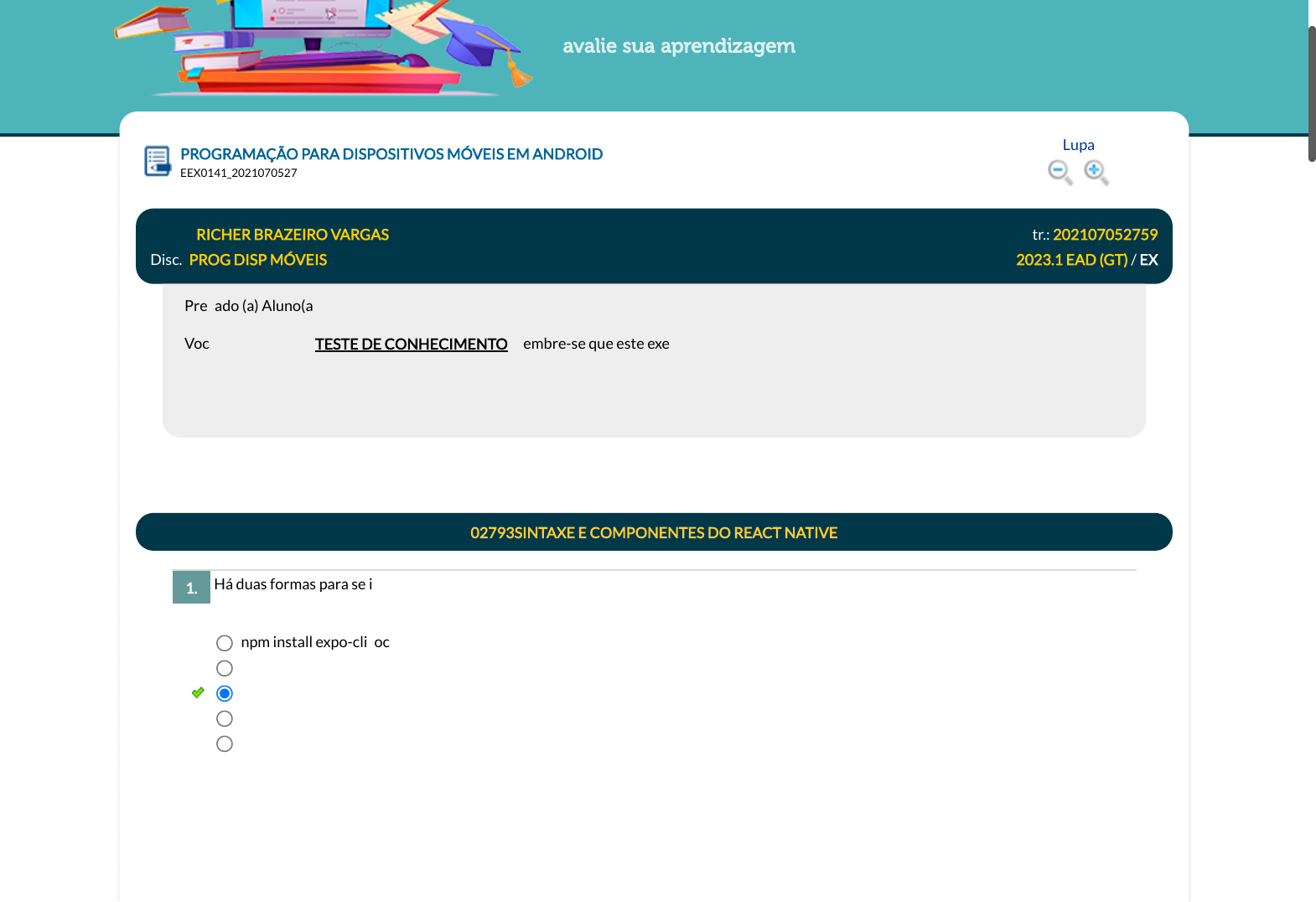 12/04/2023, 19:33 Estácio: Alunos https://simulado.estacio.br/alunos/ 1/1 avalie sua aprendizagem Há duas formas para se instalar um pacote utilizando o NPM: local e global. Marque a alternativa correspondente ao comando para instalação local do Expo Cli. PROGRAMAÇÃO PARA DISPOSITIVOS MÓVEIS EM ANDROID Lupa EEX0141_202107052759_TEMAS Aluno: RICHER BRAZEIRO VARGAS Matr.: 202107052759 Disc.: PROG DISP MÓVEIS 2023.1 EAD (GT) / EX Prezado (a) Aluno(a), Você fará agora seu TESTE DE CONHECIMENTO! Lembre-se que este exercício é opcional, mas não valerá ponto para sua avaliação. O mesmo será composto de questões de múltipla escolha. Após responde cada questão, você terá acesso ao gabarito comentado e/ou à explicação da mesma. Aproveite para se familiarizar com este modelo de questões que será usado na sua AV e AVS. 02793SINTAXE E COMPONENTES DO REACT NATIVE 1. npm install expo-cli local install expo-cli npm install expo-cli npx init expo-cli local install expo-cli Data Resp.: 12/04/2023 18:41:57 Explicação: A resposta certa é: npm install expo-cli javascript:diminui(); javascript:aumenta();