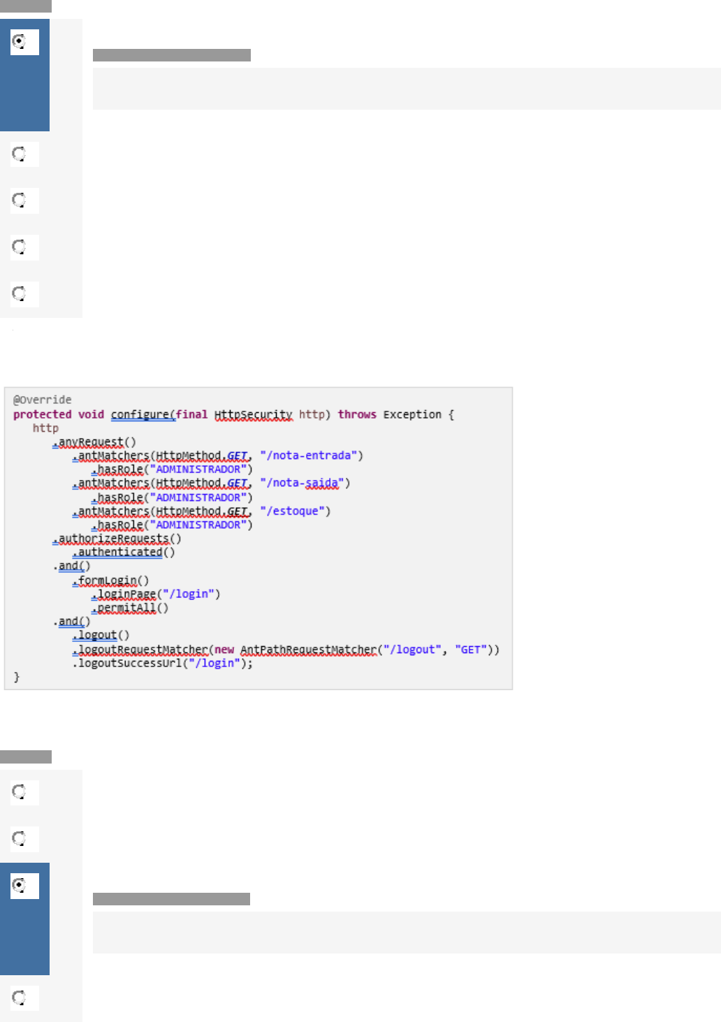 Questão 1/10 - Linguagem de Programação Dentre as alternativas abaixo, selecione aquela que corresponde a uma biblioteca de JavaScript. Nota: 10.0 A JQuery Você assinalou essa alternativa (A) Você acertou! (Aula 06 – Tema 02) B Java C Spring D CSS E HTML Questão 2/10 - Linguagem de Programação O método configure da classe de configuração de segurança exibida acima, apresenta quantos erros na sua implementação? Nota: 10.0 A 0 B 1 C 2 Você assinalou essa alternativa (C) Você acertou! AULA 06 - TEMA 05 D 3 E 4 Questão 3/10 - Linguagem de Programação Dentre as alternativas a seguir, selecione o framework de front-end que fornece uma série de classes de estilização e permite o desenvolvimento de páginas Web responsivas. Nota: 10.0 A Bootstrap Você assinalou essa alternativa (A) Você acertou! (Aula 05 – Tema 05) B HTML C CSS D JavaScript E Hibernate Questão 4/10 - Linguagem de Programação Com relação ao Bootstrap, analise as sentenças a seguir: I. O Bootstrap é um framework de estilo utilizado no front-end II. A classe container do Bootstrap é utilizada para estilizar o menu da aplicação III. Ao aplicar a classe table-hover do Bootstrap em uma tabela, a linha da tabela na qual o cursor está posicionado ficará destacada De acordo com as sentenças apresentadas, assinale a alternativa correta. Nota: 10.0 A Nenhuma sentença está correta B Somente as sentenças I e II estão corretas C Somente as sentenças I e III estão corretas Você assinalou essa alternativa (C) Você acertou! AULA 05 - TEMA 05 D Somente as sentenças II e III estão corretas E Todas as sentenças estão corretas Questão 5/10 - Linguagem de Programação Para que o método de uma classe de teste seja executado pelo JUnit, este deve ser anotado com qual anotação dentre as alternativas a seguir? Nota: 10.0 A @Autowired B @SpringBootTest C @Test Você assinalou essa alternativa (C) Você acertou! AULA 04 TEMA 2 D @JUnit E @Validation Questão 6/10 - Linguagem de Programação Para adicionar uma mensagem de feedback a um redirecionamento, devemos utilizar os métodos de um objeto do tipo: Nota: 10.0 A RedirectAttributes Você assinalou essa alternativa (A) Você acertou! (Aula 06 – Tema 03) B BindingResult C RequestMethod D ModelMap E ModelAndView Questão 7/10 - Linguagem de Programação Baseado no código acima, analise as sentenças a seguir: I. O atributo th:action da tag form, especifica a url que será responsável por efetuar o processamento da requisição quando o formulário for submetido II. O atributo th:object especifica que os dados do formulário serão salvos na tabela cliente do SGBD III. O atributo method especifica o método da requisição http que será gerada quando o formulário for submetido De acordo com as sentenças apresentadas, assinale a alternativa correta. Nota: 10.0 A Nenhuma sentença está correta B Somente as sentenças I e II estão corretas C Somente as sentenças I e III estão corretas Você assinalou essa alternativa (C) Você acertou! (Aula 04 - Tema 05) D Somente as sentenças II e III estão corretas E Todas as sentenças estão corretas Questão 8/10 - Linguagem de Programação Adotando que a aplicação está sendo executada localmente na porta 8080 e que a classe na qual o método acima foi implementado está anotada com @RequestMapping(“/clientes”), analise o código referente ao método inativa e julgue as sentenças a seguir: I. O método inativa pertence a uma classe do tipo Controller II. Ao efetuar a requisição da url http://localhost:8080/clientes/inativa?id=1 o método inativa será executado III. Após o método inativa ser executado, a aplicação será redirecionada para a url http://localhost:8080/clientes De acordo com as sentenças apresentadas, assinale a alternativa correta. Nota: 10.0 A Nenhuma sentença está correta B Somente as sentenças I e II estão corretas C Somente as sentenças I e III estão corretas Você assinalou essa alternativa (C) Você acertou! AULA 05 - TEMA 04 D Somente as sentenças II e III estão corretas E Todas as sentenças estão corretas Questão 9/10 - Linguagem de Programação As classes da aplicação responsáveis por efetuar o tratamento das requisições HTTP do sistema devem ser anotadas com quais das anotações a seguir? Nota: 10.0 A @Controller Você assinalou essa alternativa (A) Você acertou! AULA 05 - TEMA 01 B @Http C @View D @Service E @Repository Você assinalou essa alternativa (E) Questão 10/10 - Linguagem de Programação Com relação ao Thymeleaf, analise as sentenças a seguir: I. O atributo th:if é utilizado para verificar se uma condição é verdadeira II. O atributo th:errors é utilizado para exibir os erros de validação referentes a um determinado atributo III. O atributo th:field é utilizado para vincular o campo de entrada a um atributo do objeto especificado por meio do atributo th:object De acordo com as sentenças apresentadas, assinale a alternativa correta. Nota: 10.0 A Nenhuma sentença está correta B Somente as sentenças I e II estão corretas Você assinalou essa alternativa (B) C Somente as sentenças I e III estão corretas D Somente as sentenças II e III estão corretas E Todas as sentenças estão corretas Você assinalou essa alternativa (A) Você acertou! AULA 06 - TEMA 02