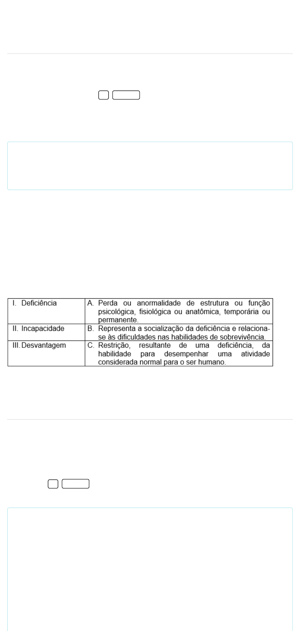 Legislação e políticas públicas de inclusão e multiculturalidade Professor(a): Gleidis Roberta Guerra (Mestrado acadêmico) 1) 2) Prepare-se! Chegou a hora de você testar o conhecimento adquirido nesta disciplina. A Avaliação Virtual (AV) é composta por questões objetivas e corresponde a 100% da média final. Você tem até cinco tentativas para “Enviar” as questões, que são automaticamente corrigidas. Você pode responder as questões consultando o material de estudos, mas lembre-se de cumprir o prazo estabelecido. Boa prova! Leia o trecho a seguir: Um modelo adotado por muito tempo e, por vezes, ainda atualmente, é o modelo __________, em que a inteligência é __________ a partir dos chamados testes de __________. Assinale a alternativa que completa adequadamente as lacunas. Alternativas: Psicoterapêutico; quantificada; inteligências múltiplas. Psicométrico; quantificada; QI. CORRETO Psicométrica; qualificada; QI. Psicoterapêutico; quantificada, QI. Psicométrico; qualificada; inteligências múltiplas. Código da questão: 68419 A Organização Mundial da Saúde (OMS, 2001) propõe uma classificação da conceituação de deficiência que pode ser aplicada a vários aspectos da saúde e da doença, sendo um referencial unificado para a área. Com base nessa classificação, relacione as colunas e assinale a alternativa correta: Leia e associe as duas colunas: Fonte: OMS. Organização Mundial da Saúde. Classificação Internacional de Funcionalidade, Incapacidade e Saúde. Brasília, DF: OMS, 2001. Assinale a alternativa que traz a associação correta entre as duas colunas: Alternativas: I-C; II-B; III-A. I-B; II-A; III-C. I-A; II-B; III-C. I-A; II-C; III-B. CORRETO I-C; II-A; III-B. Resolução comentada: Um modelo adotado por muito tempo e, por vezes, ainda atualmente, é o modelo psicométrico, em que a inteligência é quantificada a partir dos chamados testes de QI. Resolução comentada: 3) 4) 5) Código da questão: 68425 Para que a gestão democrática ocorra, algumas atitudes por parte da gestão escolar devem ser tomadas. Entre elas, pode-se citar: Alternativas: Desconsiderar a comunidade nas decisões. Centralização do poder no diretor (gestor). Consolidar mecanismos de participação. CORRETO Reforçar as decisões tomadas pela direção. Escolha do diretor por meios políticos. Código da questão: 68413 Dentro da perspectiva da educação inclusiva e tendo um aluno diagnosticado com deficiência intelectual na escola, o professor necessita: Alternativas: Dar o respaldo necessário ao aluno, para que ele tenha autonomia para vivenciar novas formas de aprender CORRETO Encaminhar o caso para a equipe técnica, que se tornará a responsável pelo seu desenvolvimento. Encaminhar o aluno para a Escola de Educação Especial, pois não pode ficar na sala comum. Manter o currículo fixo e inflexível, a criança que deverá adaptar-se às normas da escola. Dar a sua aula normalmente, afinal, ele é quase “normal”. Código da questão: 68424 A nova Política Nacional de Educação (BRASIL, 2020) foi suspensa pelo Supremo Tribunal Federal em dezembro de 2020 por ter sido considerada inconstitucional. Essa política estabelece que: Fonte: BRASIL. Ministério da Educação. Política Nacional de Educação Especial. Brasília, DF: Ministério da Educação, 2020. Alternativas: Todas as crianças devem estudar em um mesmo sistema de ensino independentemente de suas características. Todas as crianças devem, obrigatoriamente, ser matriculadas na rede regular de ensino. Serão reimplementadas as Escolas e Classes Especiais exclusivas para alunos com deficiência. CORRETO Resolução comentada: Para a efetivação da gestão democrática é necessária a consolidação dos mecanismos de participação. Resolução comentada: O professor deverá dar o respaldo necessário ao aluno, para que ele possa aprender e desenvolver-se com autonomia. 6) 7) 8) Todos os alunos devem estar em sala regular e com as mesmas oportunidades de aprendizagem. O sistema de ensino deve ser inclusivo e atender a todos os alunos, independentemente de sua deficiência. Código da questão: 68407 Para se desenvolver nos aspectos sociais, cognitivos e educacionais, a criança surda deve estar exposta a uma língua que dê aporte ao seu pensamento. Na perspectiva do bilinguismo, essa aprendizagem deve ser: Alternativas: Apenas língua de sinais. Primeiro a língua de sinais, depois a língua portuguesa escrita. CORRETO Primeiro a língua portuguesa oral, depois a escrita. Primeiro a língua portuguesa oral, depois a língua de sinais. Apenas língua portuguesa oral. Código da questão: 68415 O termo adaptação curricular começa a surgir nos documentos brasileiros a partir da necessidade de construção de uma escola que fosse inclusiva. Nesse sentido, pode-se afirmar que o principal objetivo da adaptação curricular é: Alternativas: Separar aqueles que são capazes de aprender dos que têm dificuldade. Favorecer a aprendizagem dos alunos com deficiência em classe/escola especial. Realizar as modificações necessárias para atender às diversidades de salas de aula e dos alunos. CORRETO Manter as mesmas propostas pedagógicas, homogeneizando a sala. Facilitar o currículo para aqueles que são incapazes, visto que possuem deficiência. Código da questão: 68410 A história da Educação Especial pode ser dividida em quatro períodos distintos. O período da segregação se relaciona com a inserção das crianças em qual tipo de escolarização? Alternativas: Sem escolarização. Classe comum. Escola Especial. CORRETO Classe Especial. Escola comum. Resolução comentada: A Nova Política de Educação Especial propõe o retorno das escolas e classes exclusivas para pessoas com deficiência. Resolução comentada: Na perspectiva do bilinguismo, a criança deve aprender primeiro a língua de sinais, depois a língua portuguesa na sua modalidade escrita. Resolução comentada: A 