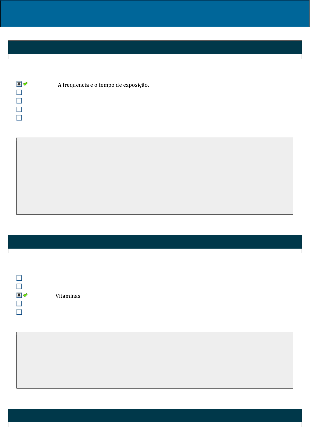 Disc.: RADIOBIOLOGIA E DOSIMETRIA 1a Questão Acerto: 1,0 / 1,0 Quais fatores determinam o processo de carcinogênese, considerando as individualidades dos organismos biológicos? A frequência e o tempo de exposição. O comprimento de onda de altas doses. O local exposto e o tipo de radiação. A atividade a fonte. A massa e a energia do feixe. Explicação: Resposta correta: A frequência e o tempo de exposição. Justificativa: A carcinogênese é determinada pela frequência e pelo tempo de exposição aos agentes desencadeantes, considerando as individualidades dos organismos biológicos. A atividade da fonte não influência, pois mesmo para uma baixa atividade, se a frequência e o tempo de exposição forem altos, pode haver o início da carcinogênese. Lembramos que a faixa de comprimento de onda das radiações ionizantes variam apenas com a energia, mas quando as classificamos como ionizantes, estão dentro de uma mesma faixa de abrangência. 2a Questão Acerto: 1,0 / 1,0 A neutralização dos íons e radicais livres pelas células é importante para frear o efeito químico, que não evoluirá para um efeito biológico. Quais dos elementos abaixo são capazes de neutralizar radicais livres? Hidroxilas. Melatoninas. Vitaminas. Fosfatos. Carboxilas. Explicação: Resposta correta: Vitaminas. Justificativa: Algumas vitaminas como a C e E possuem o poder de neutralização de radicais livres. Assim como algumas enzimas, como a catalase e as peroxidases são capazes de neutralizar os radicais peróxidos, a superóxido dismutase e os radicais superóxidos formados pela radiação. 3a Questão Acerto: 1,0 / 1,0 Com relação à transferência linear de energia (LET), avalie as afirmações a seguir: Edmilson Gonçalves Highlight Edmilson Gonçalves Highlight I - Expressa o efeito da partícula no meio. II - Depois de cada interação, o valor de dE da partícula é diferente e não fixo. III - O termo "linear" se refere à trajetória da partícula. Com base nas afirmativas anteriores, é correto afirmar que: Apenas II está incorreta. Apenas I está correta. Apenas II e III estão corretas. Apenas I e II estão incorretas. Apenas III está incorreta. Explicação: Resposta correta: Apenas III está incorreta. Justificativa: O termo "linear" se refere a uma estimativa matemática e não à trajetória da partícula. 4a Questão Acerto: 1,0 / 1,0 As mutações celulares promovidas pelas radiações ionizantes podem causar reflexos na duplicação das células afetadas, transmitindo as informações para a prole podendo gerar efeitos imediatos ou tardios à saúde. Diante desta afirmação, escolha a alternativa correta que indique onde ocorrem estes danos. No vacúolo No complexo de Golgi No DNA Na mitocôndria Na membrana citoplasmática Explicação: A radiação ionizante pode causar a morte celular ou sua modificação devido à danos nas fitas do DNA. Dependendo do número de células danificadas ou mortas o efeito causado pela radiação pode resultar em diminuição ou perda da função ou até a morte dos órgãos envolvidos. Caso contrário, as informações, agora truncadas devido à quebra da fita de DNA, transmitirão os erros à sua prole. 5a Questão Acerto: 1,0 / 1,0 Nos efeitos estocásticos a probabilidade de ocorrência de uma lesão depende da taxa de modificação celular no tecido ou órgão, e o tempo de surgimento dos danos pode levar anos.Com base nesta afirmativa, é correto afirmar que: I - A probabilidade de ocorrência é proporcional à dose de radiação recebida II - Não existe limiar de dose III - Pequenas doses não podem induzir cânceres Com base no exposto, assinale a alternativa correta. x Edmilson Gonçalves Highlight Edmilson Gonçalves Highlight Apenas II e III estão corretas. Apenas I está correta. Apenas I e II estão incorretas. Apenas III está incorreta. Apenas II está incorreta. Explicação: O tempo de surgimento dos danos, como a leucemia pode ser de sete anos e cânceres de até quarenta anos, pois, nestes efeitos, a probabilidade de ocorrência é proporcional à dose de radiação recebida e não existe limiar de dose, ou seja, pequenas doses podem induzir efeitos entre eles o câncer. 6a Questão Acerto: 1,0 / 1,0 Inúmeras características nos permitem diferenciar a matéria viva da inanimada. A capacidade do organismo de apresentar uma situação físico-química característica e constante, regulando as dimensões teciduais, mantendo a estabilidade e se ajustando às condições de sobrevivência, mesmo diante de alterações impostas pelo meio ambientes, é identificada como homeostase. alimentação. metabolismo. irritabilidade. inflamabilidade. Explicação: Homeostase é um termo criado por Walter Cannon, para definir a habilidade de manter o meio interno em um equilíbrio quase constante, independentemente das alterações que ocorram no ambiente externo. Entenda-se por meio interno, os fluidos circulantes em nossas células, chamado de líquido intersticial. A homeostasia é o processo pelo qual o organismo mantém constantes as condições internas necessárias para a vida, como o metabolismo por exemplo. 7a Questão Acerto: 1,0 / 1,0 Detectores a gás necessitam de energia elétrica para funcionar. Sobre os detectores a gás, assinale a alternativa correta. Câmara de ionização portátil: é uma câmara de ionização a ar ou a gás sob pressão, destinada a medições de taxas de exposição, taxa de dose e dose acumulada, para radiações de infravermelho. Câmara de ionização de placas paralelas: a câmara de ionização é montada de forma que a fonte radioativa a ser medida possa ser introduzida numa geometria cilíndrica, criando uma condição de eficiência de praticamente 100%. Câmara de ionização cavitária: mede o kerma no ar e muito útil para energias menores que 300 keV . Caneta dosimétrica: muito utilizada em monitoração pessoal, consiste em uma câmara de gás onde um fio de quartzo serve com