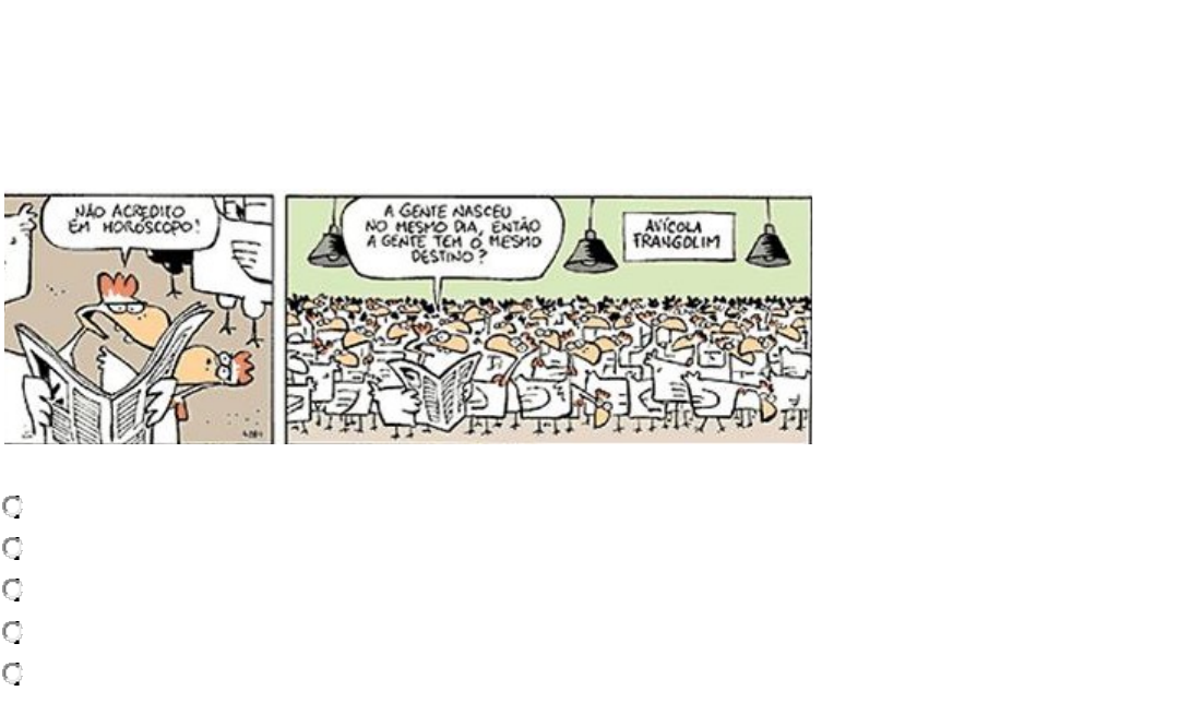 estudos disciplinares viii-avaliação PERGUNTA 1 Para Bauman (2006), a individualização se tornou o destino de todo habitante de uma grande cidade contemporânea, não uma opção. A sociedade estimula os indivíduos a agirem em função dos problemas e medos que surgem diariamente. E, ao tentar fazer com que as vidas tenham sentido, os homens tendem a culpar suas próprias falhas e fraquezas pelos desconfortos e derrotas que enfrentam. Para Bauman, a reação só leva a mais isolamento. Segundo o autor, “comunidade” significa entendimento compartilhado do tipo “natural” e “tácito”. Desse modo, considerando a tirinha, indique o tema central: a. Comunidade. b. Sociedade. c. Identidade. d. Globalização. e. Educação. PERGUNTA 2 1. De modo geral, todos os textos revelam os valores e as crenças de um grupo social e algumas vezes ocorrem conflitos intergrupais. A argumentação é a arte de convencer e persuadir. E decorre do posicionamento do enunciador. Sendo assim, é correto afirmar que: a. A argumentação não está presente em qualquer texto. b. A argumentação pode ser compreendida como uma estratégia utilizada pelo autor do texto com o objetivo de levar o leitor a dar adesão às ideias defendidas pelo texto. c. Para convencer, é necessário que o texto apresente opiniões contrárias as do seu leitor. d. Usar ideias racionais é indispensável para estabelecer uma relação lógica entre os segmentos do texto. e. A noção de sentido do texto é verificada pelas repetições e/ou redundâncias. PERGUNTA 3 1. A situação abordada na tira torna explícita a contradição entre: http://designbrandao.blogspot.com/2011/04/entrei-em-panico-e-desliguei-que-tipo.html a. As relações pessoais e o avanço tecnológico. b. A inteligência empresarial e a ignorância dos cidadãos. c. A inclusão digital e a modernização das empresas. d. A economia neoliberal e a reduzida atuação do Estado. e. A revolução informática e a exclusão digital. PERGUNTA 4 1. O texto é construído na interação dos indivíduos autor e leitor para a construção do sentido do texto. Desse modo, na tirinha do Calvin, na expressão linguística, além das estratégias gramaticais, há outra forma de se retomar as palavras no texto. É o mecanismo de substituição por: http://depositodocalvin.blogspot.com/ a. Hiperônimos. b. Hipônimos. c. Polissemias. d. Sinônimos. e. Homonímias. PERGUNTA 5 1. No que diz respeito à relação entre a cultura e a sociedade, o conhecimento não é “depositado” no indivíduo, nem tampouco é uma construção individual que o sujeito faz: o conhecimento é historicamente construído e culturalmente organizado. E é a partir das interações sociais que esses conhecimentos são compartilhados entre os membros da cultura. Desse modo, o tema central tratado nas charges (textos I e II) se refere a: a. Mídia e o perfil dos consumidores. b. Formação psicológica dos indivíduos. c. Acesso às novas tecnologias. d. Formação continuada dos indivíduos. e. Mídia e desigualdade social. PERGUNTA 6 1. O empreendedor é a inovação do mundo, tornando obsoletas as antigas formas de fazer negócios. Assim, três características básicas identificam o espírito empreendedor: necessidade de realização; disposição para assumir riscos; e autoconfiança. Desse modo, identifique a alternativa que se refere às características do trabalho do empreendedor: a. Foco na impessoalidade, na organização e hierarquia, concentra-se nos atos de planejar, organizar, dirigir e controlar. b. Foco nas demandas, nas restrições e as alternativas. c. Foco na criação e modificação de agendas, metas e planos para sua organização, concentra-se em desenvolver redes de relacionamento. d. Foco nos papéis dos gerentes, nas relações interpessoais, informacionais e decisórias. e. Foco nos aspectos estratégicos, nas análises de oportunidades, concentra-se no comprometimento e controle de recursos. PERGUNTA 7 1. A noção de gêneros textuais é apoiada em práticas sociais e em saberes socioculturais, porém podem sofrer variações, na medida em que um texto representativo de um gênero pode incorporar outras características. Desse modo, indique a temática tratada no texto Irene do Céu: IRENE NO CÉU IRENE PRETA Irene boa Irene sempre de bom humor Imagino Irene entrando no céu: – Licença, meu branco! E São Pedro bonachão: – Entra, Irene. Você não precisa pedir licença. BANDEIRA, Manuel. Poesia Completa e Prosa. Rio de Janeiro: Nova Aguilar, 1993. a. Discriminação. b. Religião. c. Humor. d. Política. e. Educação. PERGUNTA 8 1. O Professor Pardal, personagem de histórias em quadrinhos, representa um cientista muito inteligente, criativo e inventivo. Nesta imagem, podemos vê-lo evitar passar por debaixo de uma escada, pois isso, em algumas culturas, supostamente dá azar – mas sem reconhecer, sem assumir o receio. Considerando a tirinha, o Professor Pardal faz isso porque ele sabe que: http://andersonyankee.wordpress.com/2011/11/22/mito-filosofia-senso-comum-e-ciencia/ a. A ciência é incompatível com a superstição. b. As superstições não resistem à análise racional e científica. c. As superstições são baseadas em uma visão crítica. d. A superstição como a ciência prova o que afirma. e. A ciência diferente da superstição acredita em profecias. PERGUNTA 9 1. Do ponto de vista organizacional, os objetivos globais da empresa são metas e resultados desejáveis de se alcançar e realizar. Desse modo, considerando a tirinha da Mafalda, os objetivos básicos a serem alcançados são: http://educar.files.wordpress.com/2007/01/mafalda.jpg a. A sistematização do conhecimento acumulado como oferta de valores desejados. b. O resultado e a reciprocidade como fundamento da vida social. c. A manutenção da totalidade cultural e econômica do mercado. d. A construção e identificação de padrões socioculturais, éticos e morais. e. A c