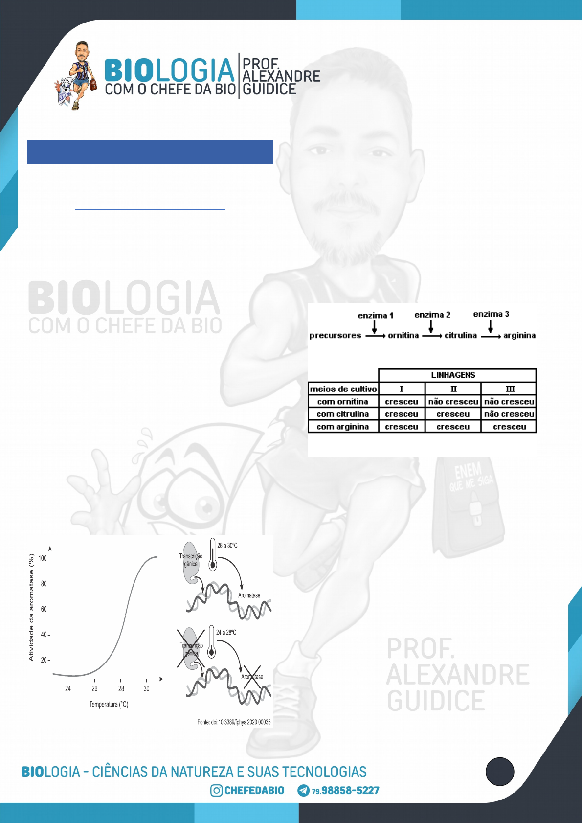 Fisioterapia para os Neurônios Revisão de Enzimas 1. (Fuvest-Ete 2022) A protease Mpro do SARS-CoV-2 é essencial para o processamento de poliproteínas virais dentro das células humanas. Um fármaco capaz de inibir essa enzima seria capaz de inibir a replicação do vírus. Baseando-se na estrutura tridimensional da Mpro, pesquisadores produziram um fármaco capaz de se ligar de forma transitória ao sítio ativo dessa protease. Em um ensaio in vitro, esse fármaco inibiu a atividade da protease. Porém, quanto mais poliproteínas virais na reação, menor foi a inibição observada. Esse fármaco pode ser classificado como um inibidor a) alostérico. b) inespecífico. c) irreversível. d) reversível não-competitivo. e) reversível competitivo. 2. (Fuvest 2021) A determinação do sexo em embriões de tartaruga-de-couro depende da temperatura a que o ovo foi exposto. Isso está relacionado à ação da enzima aromatase, que converte a testosterona em estradiol. A expressão gênica e a atividade dessa enzima nas gônadas são dependentes da temperatura, conforme indicado na figura. Sobre a determinação do sexo em tartarugas-de-couro, é correto afirmar: a) A atividade máxima da aromatase determina diferenciação sexual masculina b) O maior nível de transcrição do gene da aromatase coincide com a menor atividade da enzima. c) Em temperaturas entre 28 e 30°C, a maioria dos embriões diferenciam-se em fêmeas. d) Há equilíbrio no nascimento de machos e fêmeas a 26°C. e) A atividade da aromatase depende da quantidade de estradiol disponível. 3. (Ufrgs 1998) Considere a rota metabólica que produz o aminoácido arginina na figura adiante. Em um experimento, três linhagens de bactérias foram irradiadas com raios X, que causaram mutações nos genes envolvidos na rota metabólica acima representada. Para descobrir quais enzimas da rota metabólica foram afetadas, as três linhagens foram cultivadas em meios suplementados com ornitina, citrulina e arginina, obtendo-se o resultado mostrado na tabela acima: Sobre esse experimento, podemos afirmar que a) o gene que codifica a enzima 1 na linhagem I foi afetado. b) o gene que codifica a enzima 2 na linhagem I foi afetado. c) o gene que codifica a enzima 3 na linhagem II foi afetado. d) o gene que codifica a enzima 1 na linhagem II foi afetado. e) o gene que codifica a enzima 3 na linhagem III foi afetado. 1