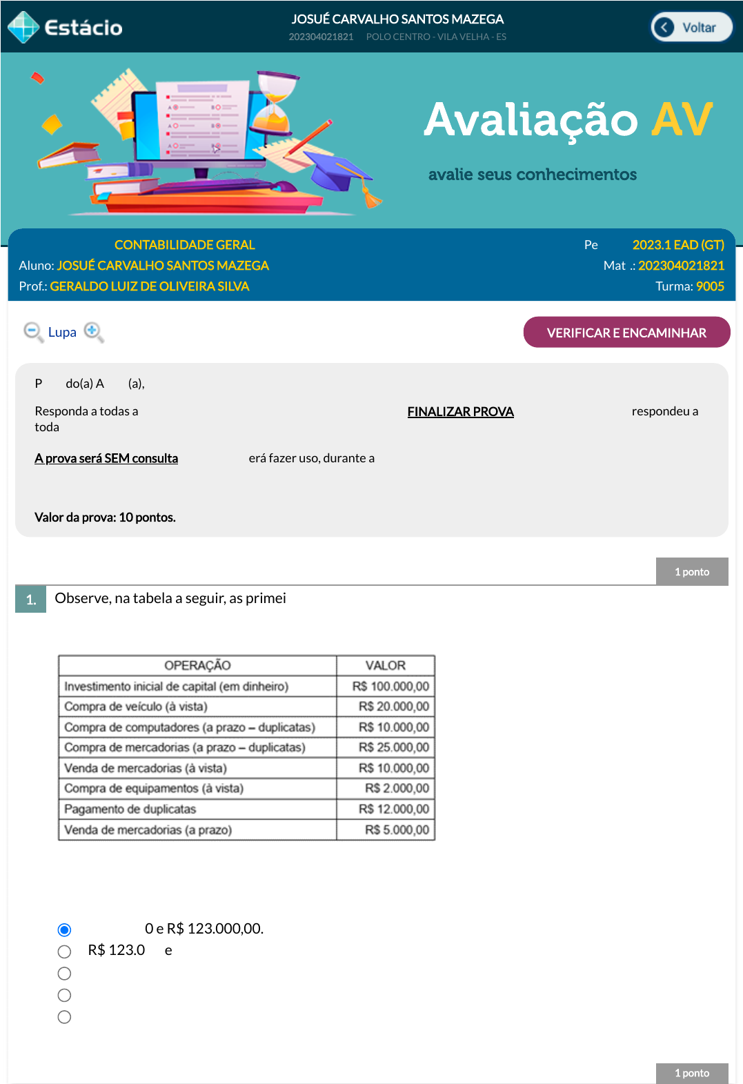 03/04/2023, 19:48 EPS https://simulado.estacio.br/provas_emcasa_linear.asp 1/6 JOSUÉ CARVALHO SANTOS MAZEGA Avaliação AV 202304021821 POLO CENTRO - VILA VELHA - ES avalie seus conhecimentos 1 ponto Observe, na tabela a seguir, as primeiras operações da empresa XYZ: Após esses lançamentos, os valores do caixa e do total do ativo da empresa serão, respectivamente: (Ref.: 202308905522) 1 ponto Disc.: DGT0007 - CONTABILIDADE GERAL Período: 2023.1 EAD (GT) Aluno: JOSUÉ CARVALHO SANTOS MAZEGA Matr.: 202304021821 Prof.: GERALDO LUIZ DE OLIVEIRA SILVA Turma: 9005 Lupa VERIFICAR E ENCAMINHAR Prezado(a) Aluno(a), Responda a todas as questões com atenção. Somente clique no botão FINALIZAR PROVA ao ter certeza de que respondeu a todas as questões e que não precisará mais alterá-las. A prova será SEM consulta. O aluno poderá fazer uso, durante a prova, de uma folha em branco, para rascunho. Nesta folha não será permitido qualquer tipo de anotação prévia, cabendo ao aplicador, nestes casos, recolher a folha de rascunho do aluno. Valor da prova: 10 pontos. 1. R$ 76.000 e R$ 123.000,00. R$ 123.000 e R$ 76.000,00. R$ 76.000 e R$ 100.000,00. R$ 100.000 e R$ 100.000,00. R$ 88.000 e R$ 123.000,00. javascript:voltar(); javascript:diminui(); javascript:aumenta(); 03/04/2023, 19:48 EPS https://simulado.estacio.br/provas_emcasa_linear.asp 2/6 De acordo com Marion e Iudícibus (2007), em geral, as operações ocasionam aumentos e diminuições no ativo, no passivo e no patrimônio líquido. Esses aumentos e diminuições são registrados em contas. Considerando-se o uso de razonetes para o registro contábil, analise as a�rmativas, assinalando com V as verdadeiras e com F as falsas. ( ) O lado esquerdo de uma conta é chamado lado do crédito; e o lado direito é chamado lado do débito. ( ) O lançamento no lado esquerdo de uma conta é denominado lançamento a débito ou débito (debitar). ( ) O lançamento no lado direito de uma conta é chamado lançamento a crédito ou simplesmente crédito (creditar). ( ) Se o valor dos débitos for superior ao valor dos créditos, a conta terá um saldo devedor. Assinale a alternativa que apresenta a sequência CORRETA: (Ref.: 202308899601) 1 ponto Considerando que uma empresa aplicou determinada quantia, por certo período, que rendeu juros pre�xados, assinale a opção correta a respeito da contabilização das operações envolvidas na aplicação. (Ref.: 202309346288) 1 ponto A Comercial RRR S/A adquiriu uma nova máquina, para seu imobilizado, nas seguintes condições: entrada de R$ 50.000,00, no ato da operação, em cheque; nove parcelas semestrais de R$ 8.000,00 cada uma; máquina registrada no imobilizado da RRR pelo valor original de R$ 120.000,00, e depreciação acumulada de R$ 60.000,00, entregues ao vendedor como parte do pagamento, pelo valor acordado entre as partes de R$ 20.000,00; pagamento diretamente à transportadora do frete, pelo carreto da máquina, do armazém do vendedor até as instalações do comprador, de R$ 15.000,00; pagamento do seguro sobre o frete, de R$ 3.000,00. Admitindo-se a inexistência de impostos nas operações realizadas, o valor da máquina a ser registrado no Ativo Não Circulante/Imobilizado, em reais, é: 2. V F F F. F V V V. V F F V. V V V V. F V V F. 3. A conta juros passivos a vencer (credora) receberá um débito pelo valor dos juros sobre a aplicação e um crédito por ocasião da apropriação da receita ganha no período. A conta juros ativos a vencer (devedora) receberá um débito pelo valor dos juros no momento da aplicação e um crédito por ocasião da apropriação da receita ganha no período. A conta juros ativos a vencer (devedora) receberá um débito pelo valor dos juros sobre a aplicação e um crédito por ocasião da apropriação da receita ganha no período. A conta juros ativos a vencer (credora) receberá um crédito pelo valor dos juros no momento da aplicação e um débito por ocasião da apropriação da receita ganha no período. A conta juros passivos a vencer (credora) receberá um crédito pelo valor dos juros sobre a aplicação e outro crédito por ocasião da apropriação da receita ganha no período. 4. 03/04/2023, 19:48 EPS https://simulado.estacio.br/provas_emcasa_linear.asp 3/6 (Ref.: 202309343291) 1 ponto Um maquinário foi adquirido por R$ 60.000,00 e vendido por R$ 18.000,00 com recebimento em 30 dias. Considerando que 75% do custo de aquisição do maquinário já foi depreciado, a contabilização dessa transação provocará: (Ref.: 202309323176) 1 ponto A Empresa Ouro Negro Ltda. costuma antecipar 40% do valor da folha de pagamento no dia 15 de cada mês, mediante transferência de sua conta bancária, para as contas correntes dos empregados. O lançamento contábil que caracteriza esta operação é: (Ref.: 202309335298) 1 ponto Um cliente antecipou o pagamento de mercadorias a serem entregues em 2 meses. No momento do recebimento antecipado de seu cliente, a empresa 157.000,00 137.000,00 142.000,00 160.000,00 100.000,00 5. um aumento líquido de R$ 18.000,00 no resultado do período. um aumento líquido de R$ 3.000,00 no Ativo. uma redução líquida de R$ 3.000,00 no Ativo. uma redução líquida de R$ 60.000,00 no Imobilizado. uma redução líquida de R$ 27.000,00 no resultado do período. 6. Salários a pagar a Banco conta movimento Salários a pagar a Diversos a Banco conta movimento a Adiantamento a empregados Adiantamento a empregados a Bancos conta movimento Despesa de Salários a Diversos a Caixa a Adiantamento a empregados Despesa de salários a Salários a pagar 7. 03/04/2023, 19:48 EPS https://simulado.estacio.br/provas_emcasa_linear.asp 4/6 (Ref.: 202309335303) 1 ponto A Carrear S/A, empresa que compra e vende automóveis novos e usados, em dezembro de 2010 realizou as seguintes operações: Dia 10 - Vendeu a prazo veículo de seu estoque para a coligada Corrêa Ltda., por R$ 80.000,00, com vencimento em 25 fevereiro de 2011. Dia 