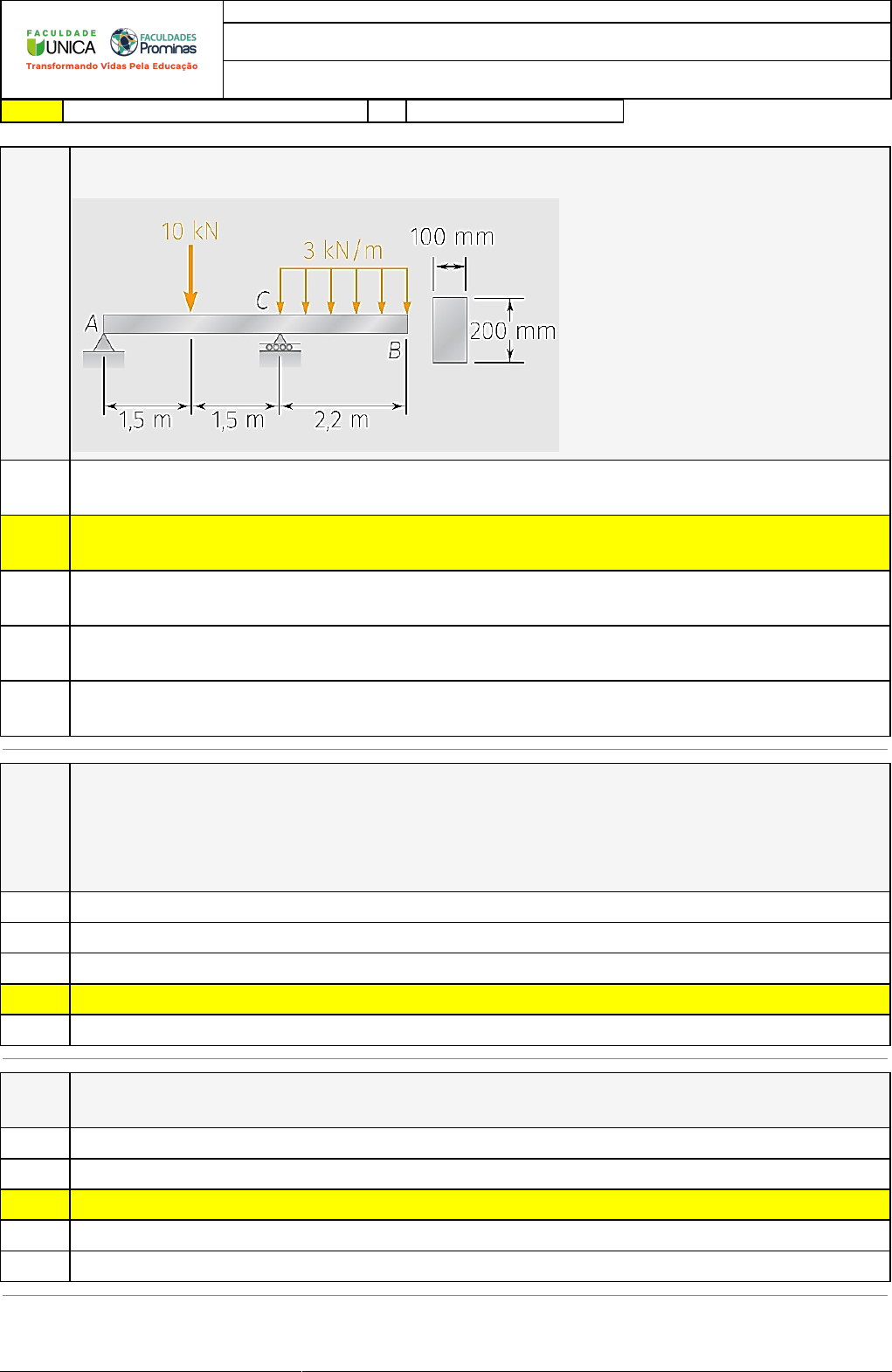 14/04/2023 08:42:01 1/2 REVISÃO DE SIMULADO Nome: CLERISTON CARVALHO COSTA Disciplina: Mecânica dos Sólidos I Respostas corretas são marcadas em amarelo X Respostas marcardas por você. Questão 001 Determine o valor máximo absoluto (a) da força cortante e (b) do momento fletor da viga a seguir: Autor (2021) A) A) cortante máximo = 2 kN; (B) momento máximo = 6 kN.m B) (A) cortante máximo = 7,42 kN; (B) momento máximo = 7,26 kN.m C) A) cortante máximo = 7,42 kN; (B) momento máximo = 26 kN.m D) A) cortante máximo = 42 kN; (B) momento máximo = 7,26 kN.m X E) A) cortante máximo = 4 kN; (B) momento máximo = 6 kN.m Questão 002 Analise as afirmações sobre o esforço de compressão atuante em pilares. I - Quando um pilar é comprimido, ele cede lateralmente, gerando tensões de tração. II - Não é totalmente verdade que um pilar só recebe esforços de compressão. III - Embora o concreto resista bem a compressão, o aço é muito melhor. (É)são correta(s) apenas a(s) afirmação(ões): A) III. B) II e III. X C) I. D) I, II e III. E) II. Questão 003 O esforço de flexão é um dos mais importantes dentro do dimensionamento de vigas. É correto afirmar que o esforço de flexão também pode ser denominado de: A) compressão. B) cisalhamento. X C) momento fletor. D) tração. E) forção composta. 14/04/2023 08:42:01 2/2 Questão 004 Uma estrutura hiperestática carregada, com a laje e as vigas apresentando flexão está deformando os pilares, deixando o conjunto estrutural em risco. Qual a melhor solução para o problema? A) Criar apoio na lateral dos pilares para impedir a flexão. B) A solução seria quebrar a estrutura no apoio entre viga e pilar. C) A única opção é retirar a carga da estrutura. D) Executar um pilar no meio da viga. X E) Criar um reforço para toda a estrutura. Questão 005 Adaptada de Hibbeler, 2010). A coluna apresentada na figura abaixo é de concreto de alta resistência e reforçada com quatro hastes de aço A-36. Se for submetida a uma força axial de 800 kN, determine o diâmetro exigido para cada haste de modo que 1/4 da carga seja suportada pelo aço e 3/4 pelo concreto. Eaço=200 GPa e Ee=25 GPa. A) d=67,8 mm B) d=33,9 mm X C) d=85,3 mm D) d=22,5 mm E) d=16,8 mm