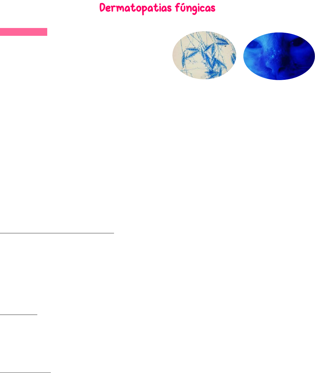 Dermatofitose Doença de potencial zoonótico Microsporum canis (cães, gatos e humanos) Microsporum gypseum (solo – saprófito) Trichophyton mentagrophytes (várias espécies e vários hospedeiros) 1. Sinais clínicos Vibriças e pelos quebradiços Crostas na pele e alopecia Unhas de crescimento regular, tortas e fracas Prurido baixa 2. Diagnóstico É feito pela combinação de meios diagnósticos Observação sob lâmpada de Wood M. canis pteridina (se alimenta de secreções da pele, como os aminoácidos e a Pteridina fica no M. canis) Não confirma o diagnóstico, apenas orienta de onde coletar material Leite e crostas ficam esverdeadas Segue acompanhando o paciente com a lâmpada nos retornos Tricograma O comprimento do pelo fica dilatado A cutícula fica irregular Pegar pelo do meio ou da borda, pelo fungo ter crescimento para as bordas Cultura fúngica Positiva para Microsporum canis no 8º dia de cultivo Dá o diagnóstico Dermatobac – específico para M. canis, se vende em lojas de material humano. o Coleta com raspado, coloca em uma gaze e passa álcool 70, depois coloca no gel e avalia por 21 a 28 dias, o gel fica vermelho e tem crescimento de fungos. Para fazer a leitura, pega o “algodão” com uma fita adesiva, e coloca em uma lâmina e cora com azul de metileno. Biopsia cutânea Solicitar colorações especiais – na solicitação colocar suspeita de dermatofitose o PAS (coloração ácido periódico + reativo de Schiff) o GMS (coloração de metenamina de prata de Grocott) 3. Tratamento Tópica Reduzir o risco de transmissão e contaminação ambiental Shampoo 2x na semana por 10 minutos (pode manipular) Clorexidine 2% + Miconazol 2% Clorexidine 0,4 – 4% Clorexidine 2% + Cetoconazol 1% Cremes/Geis*/Loções tópicas** (precisa de tempo de contato longo para ter ação) Clotrimazol Miconazol Enilconazol * O gel e o mouse têm ação mais rápida, então pode manipular ** Não recomendado como terapia única Sistêmico Atua na infecção ativa e na proliferação dos fungos hospedeiros Itraconazol* 5 – 10 mg/kg VO SID-BID Terbinafina* 30 – 40 mg/kg VO SID Griseofulvina* 25 – 50 mg/kg VO SID * Administrar com alimento e evitar inibidores de bomba (se apresentar êmese, parar o tratamento e começar o antiemético, se não resolver, avaliar para gastrite) Ambiental Minimizar risco de transmissão para pessoas e outros animais e contaminação de fômites Ferver roupas Lavagem na máquina (30-60ºC – 2 ciclos) com ou sem hipoclorito de sódio Camas com fronhas que devem ser lavadas todos os dias em temperatura de fervura Hipoclorito de sódio Desinfetantes – Hysteril Tosa/tricotomia – evitar em chow-chow, akita e spitz (alopecia pós-tosa) Descarte de arranhador, brinquedos de madeira e corda 4. Acompanhamento Consulta mensal Após desaparecimento de lesões, tratar por mais 20 dias Alta depois que os exames estiverem negativos Em filhotes menores de 3 meses, deve acompanhar com exames hepáticos Malasseziose Malassezia pachydermatis 1. Sinais clínicos Prurido no ouvido, alta produção de cerúmen (proteção) Prurido no interdigito, podal e base a unha Pele pregueada e escura processo crônico Pele oleosa (cheiro rançoso) Tem doença alérgica, malasseziose não é a doença primária Pode causar flebarite, 2. Diagnóstico Imprints Pele seca – direto com fita adesiva Pele oleosa – com swab ou direto com a lâmina Microbiota da pele e da mucosa do cão, também do gato, e possibilidade de outras espécies Citologia Da o diagnóstico Fita adesiva Biopsia Cultura 3. Tratamento Investigar a causa base, é uma doença secundária e oportunista – pode estar associado a hipertireoidismo Quando há otite, é uma alergia, tendo que ser tratada Tópico Shampoo Clorexidine 2% + Miconazol 2% Clorexidine 3% Para seborreia (pele oleosa) – Sebolytic, Sebocalm Sistêmico Itraconazol* (alergopata deve se cuidar para malasseziose, então é utilizado como pulsoterapia) Cães: 5 mg/kg VO SID ou 2 dias seguidos na semana (pulsoterapia) Gatos: 5 – 10 mg/kg VO SID ou tratamento por 7 dias e interromper 7 dias, sucessivamente *Administrar com alimento