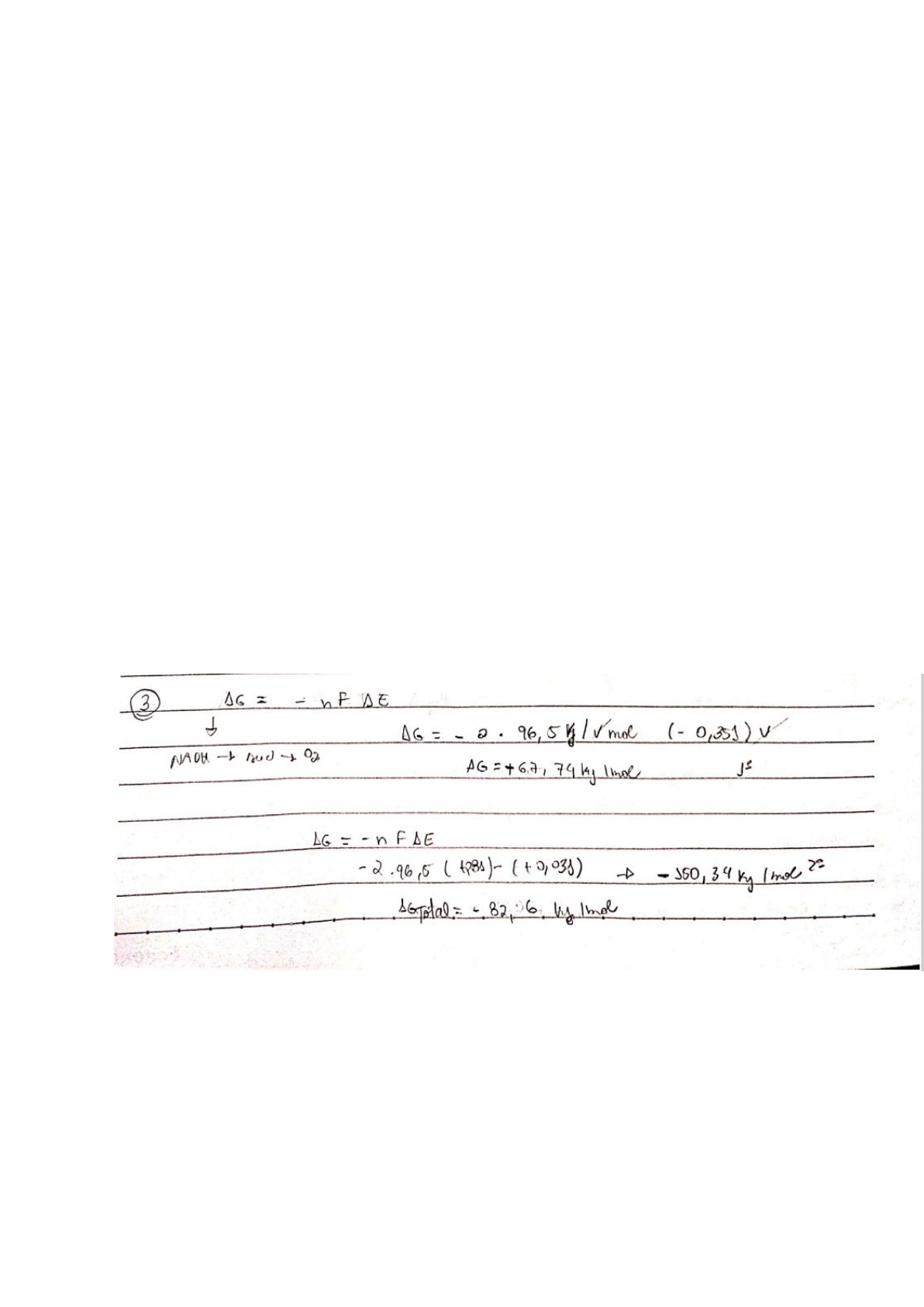 Lista de exercícios – Cadeia transportadora de elétrons; fosforilação oxidativa: Letícia Fernanda Nanami - 110616 1. Qual a estratégia adotada pela célula para converter a energia armazenada nas coenzimas reduzidas (NADH e FADH2) em ATP? A estratégia adotada pela célula é transformar a energia armazenada nas coenzimas em um gradiente de prótons na mitocôndria e utilizar este gradiente para sintetizar ATP. A oxidação das coenzimas reduzidas pela cadeia transportadora de elétrons acontece na membrana interna da mitocôndria. 2. Quais os principais grupos prostéticos envolvidos no transporte de elétrons na cadeia respiratória? Os principais grupos são aqueles que transportam prótons e elétrons (flavina, nad) e aqueles que transferem somente elétrons (centro Fe-S, e os citocromos). 3. Calcule a variação de energia livre padrão para a transferência de dois elétrons do NADH e do Succinato até o O2 na cadeia transportadora de elétrons, sabendo que os potenciais de redução padrão (E´o) são: NAD+/NADH = -0,32V; Fumarato/Succinato = +0,031V; O2/H2O = +0,81 . 4. Na transferência de elétrons, apenas a porção quinona da ubiquinona sofre oxidação-redução. A cadeia lateral isoprenoide permanece inalterada. Qual a função desta cadeia? A porção quinona sofre a redução, e tem uma cadeia lateral muito grande ( composta basicamente de C-H), e esta não participa dos eventos de oxidação-redução, ainda apresenta uma característica hidrofóbica, tendo como função conferir a hidrofobicidade necessária para ubiquinona fixar-se na membrana, e trazer mobilidade. 5. Todas as desidrogenases da glicólise e do ciclo do ácido cítrico usam NAD+ (E´° para NAD+/NADH = -0,32 V) como aceptor de elétrons, exceto pela succinato desidrogenase, que usa FAD covalentemente ligado ( E´° para FAD/FADH2 = 0,05 V). Sugira por que o FAD e não o NAD+ é o aceptor de elétrons mais apropriado na desidrogenação do succinato (E´° para fumarato/succinato = 0,031). Os elétrons fluem espontaneamente (variação de energia livre (-)) do par com o menor potencial redox para o par que apresenta o maior potencial de redução padrão. Assim, o par de NAD+/NADH possui um potencial de redução padrão menor que o de fumarato/succinato, dessa forma o par NAD+/NADH como coenzima, faria com que o fluxo de elétrons fosse do NADH para o succinato, e não ao contrário. 6. Rotenona, um produto tóxico natural de plantas, inibe fortemente a NADH desidrogenase em mitocôndrias de insetos e peixes. Antimicina A, um antibiótico tóxico, inibe fortemente a oxidação do ubiquinol. a. Explique por que a ingestão de rotenona é letal para algumas espécies de peixes e insetos. Ela inibe o complexo I, prejudicando uma das fontes de energia, inibe a oxidação do NADH e a síntese de ATP fica reduzida, e então as células acabam morrendo. b. Explique por que a antimicina A é um veneno Esta bloqueia a geração de ubiquinol para o complexo III, e cessa a transferência de elétrons para o O2, não gerando um gradiente de prótons e consequentemente, diminuindo a produção de ATP, dentro da mitocôndria. c. Considerando que a rotenona e a antimicina A são igualmente efetivas em bloquear seus respectivos sítios na cadeia de transferência de elétrons, qual delas seria um veneno mais potente? Explique. A antimicina, uma vez que a ubiquinona é o ponto centro de recepção de elétrons entre si e outras vias, assim, caso o complexo III fosse inibido teria maior consequência. 7. Quando O2 é adicionado a uma suspensão anaeróbia de células consumindo glicose em alta velocidade, esta velocidade diminui marcantemente à medida que o O2 é consumido e o acúmulo de lactato cessa. Este efeito, primeiramente observado por Louis Pasteur na década de 1860, é característico da maioria das células capazes tanto de catabolismo aeróbio quanto anaeróbio da glicose. a. Por que o acúmulo de lactato cessa depois que o O2 é adicionado? Em condições anaeróbias a célula realiza fermentação lática, e sem o O2 o NADH não pode ser oxidado na cadeia transportadora de elétrons. Assim, o piruvato é reduzido a lactato no citosol regenerando então o NAD+ que pode continuar a ser usado na via da glicólise. E então, na medida que adiciona-se O2 no meio, as coenzimas reduzidas passam a ser oxidadas na cadeia transp. de elétrons, e a fermentação deixa de ser necessária. b. Por que a presença de O2 diminui a taxa do consumo de glicose? Porque a oxidação completa da glicose aerobicamente resulta em um saldo/ rendimento maior de ATP, consequentemente, uma concentração menor de glicose é consumida na presença de O2. c. De que forma o início do consumo de O2 reduz a taxa de consumo de glicose? Explique em termos de enzimas específicas. A fosfofrutoquinase 1 e a piruvato quinase são inibidas alostericamente, em altos níveis de ATP, reduzindo a taxa do consumo de glicose pela via. 8. Sabendo que: 1) quantidade de energia livre necessária para transportar 1 mol de H+ da matriz mitocondrial para o espaço intermembranas é de +20 kJ/mol, e 2) a transferência de 2 elétrons do NADH ao O2 é acompanhada pelo bombeamento para fora de 10 H+. Calcule a eficiência deste processo de conservação de energia (em porcentagem). 9. O complexo II da cadeia transportadora de elétrons não atua como bomba de prótons, ao contrário dos demais complexos. Considerando os seguintes potenciais de redução padrão (E´o): Fumarato/Succinato = +0,031V e CoQ/CoQH2 = +0,045V, formule uma explicação plausível para este fato. 10.A variação de energia livre para a hidrólise do ATP em ADP+Pi é grande e negativa (-30,5 kJ/mol). Todavia, na superfície da ATP sintase, a variação de energia livre para esta reação é de praticamente zero. Como esta contradição pode ser explicada? A formação de interações fracas entre o ATP e o sítio ativo das subunidades B da porção F1 da ATP sintase proporci