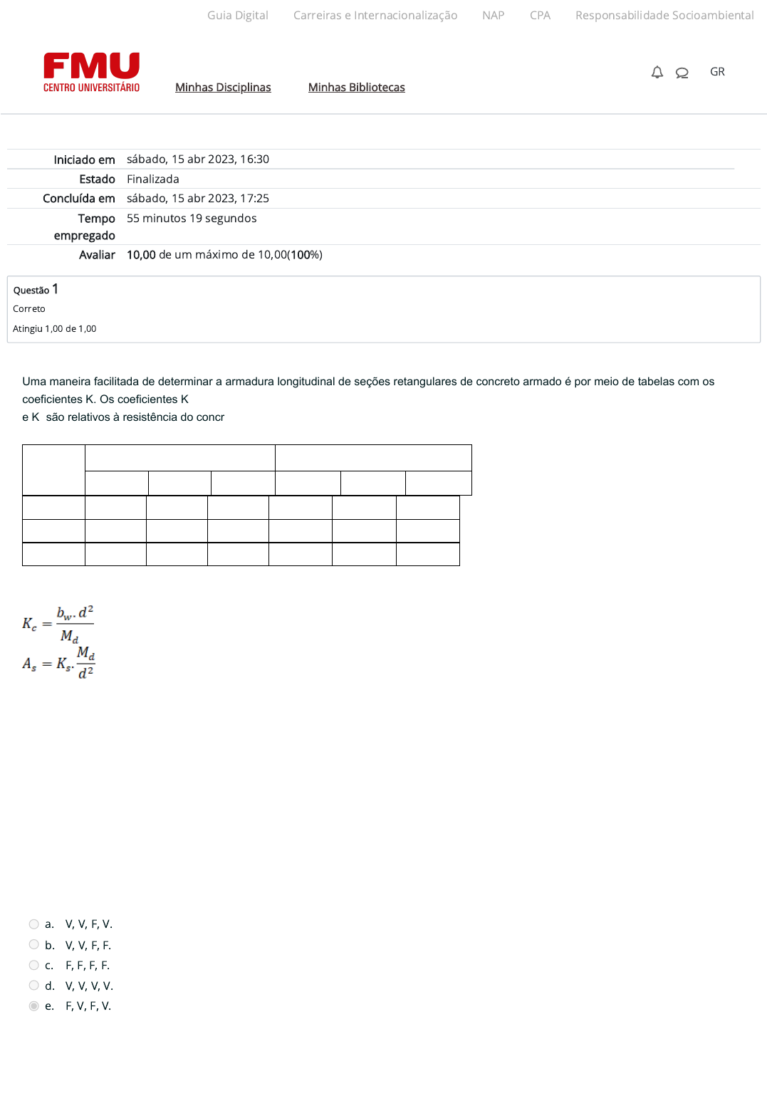 15/04/2023, 17:26 Atividade 2 (A2): Revisão da tentativa https://ambienteacademico.com.br/mod/quiz/review.php?attempt=1980233&cmid=765829 1/6 Iniciado em sábado, 15 abr 2023, 16:30 Estado Finalizada Concluída em sábado, 15 abr 2023, 17:25 Tempo empregado 55 minutos 19 segundos Avaliar 10,00 de um máximo de 10,00(100%) Questão 1 Correto Atingiu 1,00 de 1,00 Uma maneira facilitada de determinar a armadura longitudinal de seções retangulares de concreto armado é por meio de tabelas com os coeficientes K. Os coeficientes K e K são relativos à resistência do concreto e à tensão na armadura tracionada respectivamente, e as Equações que permitem o cálculo através deles são: βx Kc (cm /kN) C20 C30 C35 Ks (cm /kN) CA25 CA50 CA60 0,24 4,7 3,2 2,7 0,051 0,025 0,021 0,27 4,3 2,8 2,4 0,052 0,026 0,021 0,34 3,5 2,3 2,0 0,053 0,027 0,022 A respeito dos elementos geométricos e de resistência dos materiais que compõem uma viga, analise as afirmativas a seguir e assinale V para a(s) Verdadeira(s) e F para a(s) Falsa(s). I. ( ) Para uma viga 20 x 40 cm em concreto armado C30 e CA50, combinação normal e cobrimento de 3 cm na condição de βx=0,27, o momento característico que suporta corresponde a 97,78 kN.m. II. ( ) Para uma viga 15 x 30 cm com βx=0,24, cobrimento de 4 cm, C35, pode ser solicitada por Md= 37,6 kN.m. III. ( ) Uma armadura superior de área 2,0 cm em uma viga 20 x 50 cm que suporta laje e parede de vedação, cobrimento de 4 cm, βx=0,34, concreto C20, CA50 tem capacidade de Md=1.567,4 kN.m. IV. ( ) Para uma viga de altura útil d e solicitada ao momento Md, mesmo βx, a variação de área de armadura necessária para a CA60 é menor em relação à classe CA50, porque a tensão de escoamento é maior. Assinale a alternativa que apresenta a sequência correta. a. V, V, F, V. b. V, V, F, F. c. F, F, F, F. d. V, V, V, V. e. F, V, F, V. c s 2 2 2 Guia Digital Carreiras e Internacionalização NAP CPA Responsabilidade Socioambiental Minhas Disciplinas Minhas Bibliotecas GR https://codely-fmu-content.s3.amazonaws.com/Moodle/GuiaDigital/Guia+digital/index.html https://carreiras.fmu.br/ https://codely-fmu-content.s3.amazonaws.com/Moodle/NAP/inicial/nap/fmu/index.html https://codely-fmu-content.s3.amazonaws.com/Moodle/CPA/landing_CPA/index.html https://portal.fmu.br/sustentabilidade https://ambienteacademico.com.br/ https://ambienteacademico.com.br/ https://ambienteacademico.com.br/course/view.php?id=236 15/04/2023, 17:26 Atividade 2 (A2): Revisão da tentativa https://ambienteacademico.com.br/mod/quiz/review.php?attempt=1980233&cmid=765829 2/6 Questão 2 Correto Atingiu 1,00 de 1,00 Questão 3 Correto Atingiu 1,00 de 1,00 A NBR 6118 estabelece que estado-limite último é caracterizado pela distribuição de deformações do aço e do concreto na seção denominada de domínios. Os domínios variam de 1 a 5, de acordo com a solicitação dos materiais aço e concreto, e servem para dimensionamento das armaduras (ABNT, 2014, p. 122). Com relação aos domínios de deformação para o Estado Limite Último, contidos na NBR 6118, analise as afirmativas a seguir e assinale V para a(s) Verdadeira(s) e F para a(s) Falsa(s). I. ( ) Nos domínios 2 e 3, ocorre o escoamento do aço. II. ( ) Nos domínios 3 e 4, ocorre ruptura a compressão do concreto. III. ( ) No domínio 4, ocorre ruptura da compressão do concreto e escoamento do aço. IV. ( ) No domínio 1, ocorre tração não uniforme, sem compressão. Assinale a alternativa que apresenta a sequência correta. a. F, V, F, V. b. V, V, V, V. c. F, F, F, F. d. V, V, F, V. e. V, V, F, F. Uma viga de concreto armado de 15 x 50 cm, cujo concreto é de classe C20, possui armaduras distribuídas conforme apresentadas na figura a seguir, considerando que ela deve ser dimensionada de forma que a relação x/d atenda a NBR 6118 quanto ao critério de ductilidade do aço. Fonte: Elaborada pela autora. Com relação à viga apresentada, analise as afirmativas a seguir e indique V para a(s) Verdadeira(s) e F para a(s) Falsa(s). I. ( ) A viga deve ter altura da linha neutra de 20,7 cm para atender à ductilidade estabelecida pela NBR 6118. II. ( ) Para que a viga atue no limite dos domínios 2 e 3, a altura da linha neutra deve ser 11,91 cm. III. ( ) A altura útil da viga é 43 cm. IV. ( ) No limite do domínio 3, a viga apresenta altura da linha neutra correspondente a 28,89 cm. Assinale a alternativa que apresenta a sequência correta. a. V, V, F, V. b. F, V, F, V. c. F, F, F, F. d. V, V, F, F. e. V, V, V, V. Guia Digital Carreiras e Internacionalização NAP CPA Responsabilidade Socioambiental Minhas Disciplinas Minhas Bibliotecas GR https://codely-fmu-content.s3.amazonaws.com/Moodle/GuiaDigital/Guia+digital/index.html https://carreiras.fmu.br/ https://codely-fmu-content.s3.amazonaws.com/Moodle/NAP/inicial/nap/fmu/index.html https://codely-fmu-content.s3.amazonaws.com/Moodle/CPA/landing_CPA/index.html https://portal.fmu.br/sustentabilidade https://ambienteacademico.com.br/ https://ambienteacademico.com.br/ https://ambienteacademico.com.br/course/view.php?id=236 15/04/2023, 17:26 Atividade 2 (A2): Revisão da tentativa https://ambienteacademico.com.br/mod/quiz/review.php?attempt=1980233&cmid=765829 3/6 Questão 4 Correto Atingiu 1,00 de 1,00 Questão 5 Correto Atingiu 1,00 de 1,00 Os domínios são utilizados para o dimensionamento de peças fletidas, e o comportamento de uma viga de concreto armado submetido à flexão simples tem relação com as tensões e deformações do aço e concreto, de acordo com o domínio. No dimensionamento da armadura, a NBR 6118 estabelece um valor limite entre essas relações. ABNT – ASSOCIAÇÃO BRASILEIRA DE NORMAS TÉCNICAS. NBR 6118– Projeto de estruturas de concreto – Procedimento. Rio de Janeiro: ABNT, 2014. Analise as afirmativas a seguir: I. A desvantagem de uma viga trabalhar no domínio 2 é a de que o aço não está solicitado ao limite de escoamento, o que torna a peça insegura qua