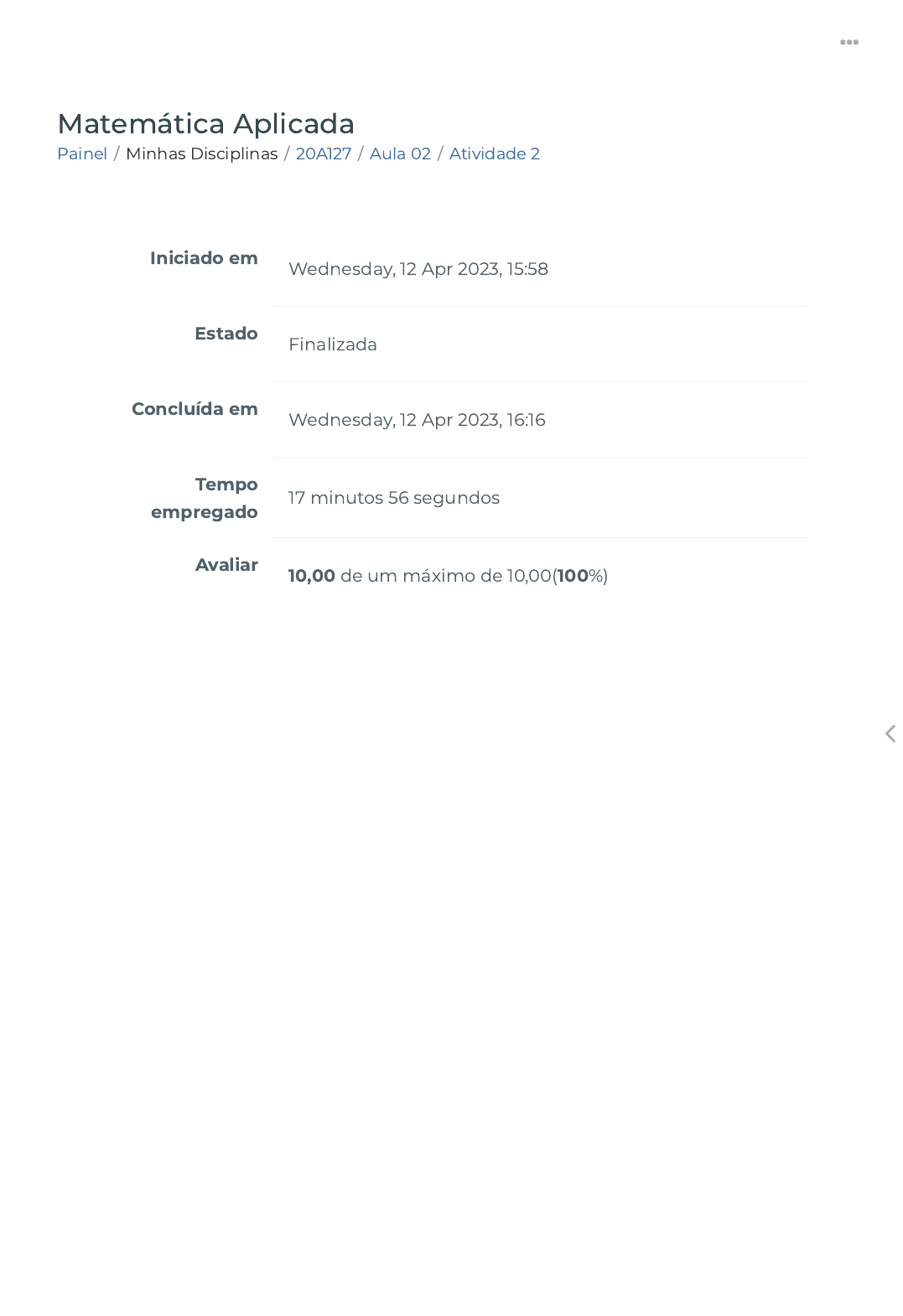 12/04/2023, 16:16 Atividade 2 https://ava.politecnicabr.com.br/mod/quiz/review.php?attempt=4712990 1/8 Painel / Minhas Disciplinas / 20A127 / Aula 02 / Atividade 2 Matemática Aplicada Iniciado em Wednesday, 12 Apr 2023, 15:58 Estado Finalizada Concluída em Wednesday, 12 Apr 2023, 16:16 Tempo empregado 17 minutos 56 segundos Avaliar 10,00 de um máximo de 10,00(100%) https://ava.politecnicabr.com.br/my/ https://ava.politecnicabr.com.br/course/view.php?id=964 https://ava.politecnicabr.com.br/course/view.php?id=964#section-3 https://ava.politecnicabr.com.br/mod/quiz/view.php?id=25955 https://ava.politecnicabr.com.br/ 12/04/2023, 16:16 Atividade 2 https://ava.politecnicabr.com.br/mod/quiz/review.php?attempt=4712990 2/8 Questão 1 Completo Atingiu 1,50 de 1,50 Calcule a área do triângulo de base = 5Km e altura = 4000cm. Escolha uma opção: a. 2.000.000m² b. 100.000m² c. 1.000.000m² d. 10.000m² https://ava.politecnicabr.com.br/ 12/04/2023, 16:16 Atividade 2 https://ava.politecnicabr.com.br/mod/quiz/review.php?attempt=4712990 3/8 Questão 2 Completo Atingiu 1,50 de 1,50 Calcule a área da circunferência com diâmetro de 9 cm. Escolha uma opção: a. 63,6cm² b. 254,5cm² c. 28,3cm² d. 127,2cm² https://ava.politecnicabr.com.br/ 12/04/2023, 16:16 Atividade 2 https://ava.politecnicabr.com.br/mod/quiz/review.php?attempt=4712990 4/8 Questão 3 Completo Atingiu 1,50 de 1,50 Calcule a área do retângulo de base = 7000mm e altura = 5m. Escolha uma opção: a. 350.000mm² b. 0,00035km² c. 35.000cm² d. 35m² https://ava.politecnicabr.com.br/ 12/04/2023, 16:16 Atividade 2 https://ava.politecnicabr.com.br/mod/quiz/review.php?attempt=4712990 5/8 Questão 4 Completo Atingiu 1,50 de 1,50 Calcule a área da circunferência com r = 120mm. Escolha uma opção: a. 37,7cm² b. 452,4cm² c. 75,4cm² d. 4.523,9mm² https://ava.politecnicabr.com.br/ 12/04/2023, 16:16 Atividade 2 https://ava.politecnicabr.com.br/mod/quiz/review.php?attempt=4712990 6/8 Questão 5 Completo Atingiu 2,00 de 2,00 O piso de uma sala retangular, medindo 3,52 m × 4,16 m, será revestido com ladrilhos quadrados, de mesma dimensão, inteiros, de forma que não �que espaço vazio entre ladrilhos vizinhos. Os ladrilhos serão escolhidos de modo que tenham a maior dimensão possível. Na situação apresentada, o lado do ladrilho deverá medir? Escolha uma opção: a. 34cm b. 30cm c. 28cm d. 32cm https://ava.politecnicabr.com.br/ 12/04/2023, 16:16 Atividade 2 https://ava.politecnicabr.com.br/mod/quiz/review.php?attempt=4712990 7/8 Questão 6 Completo Atingiu 2,00 de 2,00 No alto de uma torre de uma emissora de televisão duas luzes “piscam” com frequências diferentes. A primeira, “pisca“ 12 vezes por minuto e a segunda, “pisca“ 15 vezes por minuto. Se num certo instante as luzes piscam simultaneamente, após quantos segundos elas voltarão a piscar simultaneamente? Escolha uma opção: a. 24s b. 12s c. 30s d. 20s Entre em Contato https://www.politecnicabr.com.br 0800 084 2627 0800 084 2627 Links Úteis Dicas da nossa Diretora Acadêmica Planner de Estudos Declaração de Matrícula Orientações do AVA Abertura de Ticket Fale com o Tutor Cronograma de Estudos Manual de Estágio Manual de Competência https://www.politecnicabr.com.br/ https://soundcloud.com/user-501638417/sets/escola-politecnica-brasileira https://storage.googleapis.com/sirius-pubstore/semestre_plannerdeestudo%20poli.pdf https://storage.googleapis.com/sirius-pubstore/declaracao_matricula.pdf https://storage.googleapis.com/sirius-pubstore/orientacoes_ava.pdf https://storage.googleapis.com/sirius-pubstore/abertura_ticket.pdf https://storage.googleapis.com/sirius-pubstore/fale_com_tutor.pdf https://storage.googleapis.com/sirius-pubstore/cronograma_estudos.pdf https://storage.googleapis.com/sirius-pubstore/manual_estagio.pdf https://storage.googleapis.com/sirius-pubstore/manual_competencia.pdf https://ava.politecnicabr.com.br/ 12/04/2023, 16:16 Atividade 2 https://ava.politecnicabr.com.br/mod/quiz/review.php?attempt=4712990 8/8 © 2022 - Escola Politécnica Brasileira Siga-nos nas redes sociais https://ava.politecnicabr.com.br/mod/quiz/0 https://www.facebook.com/politecnicabr https://www.instagram.com/politecnicabr_oficial https://ava.politecnicabr.com.br/