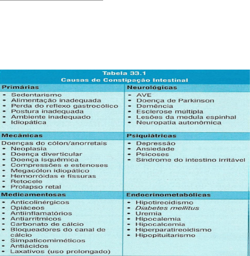 Gustavo Moreno T19 Aula 10: Obstipação intestinal: -Uma das queixas mais comuns -50% nos pacientes que vivem nas ILP (instituições de longa permanência) -15 - 20% em comunidade -Mais frequentes em mulheres** -Normalmente é multifatorial (Medicamentoso, falta de exercício, dietas…) -Funcional ou primária – sedentarismo, imobilidade, dieta inadequada, perda do reflexo da evacuação, idiopática. -Orgânica ou secundária – doenças neurológicas, metabólicas, medicamentos e doença do cólon. Obs: Medicamentos: (+) → carbonato de cálcio (causa mais calculo renal), tricíclicos e serotoninérgicos, AINES, antiácidos (hidróxido de alumínio), uso prolongado de laxantes (deterioração do intestino) Quadro clínico: -Diminuição do número e esforço excessivo nas evacuações -Obs – 1 dia sim e outro não → pode ser normal!! -Sensação de evacuação incompleta -Fezes endurecidas Diagnóstico: –Clínico para obstipação funcional: Ter pelo menos 2 ou mais critérios abaixo pelos últimos 3 meses do inicio dos sintomas e pelo menos 6 meses antes do diagnóstico. 1. Esforço para evacuar 2. Sensação de evacuação incompleta ou bloqueio anorretal 3. Fezes em cíbalos 4. Necessidade de manobras manuais 5. Menos de 3 evacuações semanais Critério de Roma IV: –Manobras manuais para facilitar pelo menos 25% das defecações (por exemplo, evacuação digital, suporte do assoalho pélvico) –Menos de 3 evacuações por semana Anamnese: Quanto tempo ? 1. Início recente – causa mais orgânica, a crônica é mais funcional 2. Pesquisar sobre a dieta, pobre em fibras 3. Hidratação 4. Atividade física, sedentarismo 5. Postura inadequada na evacuação 6. Indagar emagrecimento, apatia, dor abdominal, sangramento intestinal, tenesmo 7. Pesquisar medicamentos → opiáceos (tramadol / codeína / metadona / morfina), antidepressivos, cálcio 8. Pesquisar patologias existentes – AVC, demências, parkinson, hipotireoidismo 9. Toque retal e ectoscopia perianal 10. Alternância de diarreia e obstipação (doença diverticular → complicações: diverticulite e hemorragia digestiva baixa) 11. Histórico de CA GI Suspeitar de causas secundária: 1. Anemia 2. Sonolência, dores musculares 3. Dificuldade para deglutição 4. Histórico familiar de CA intestino 5. Aumento ou diminuição do peso 6. Dor abdominal ou perianal 7. Enterorragia 8. Histórico recente de mudança do hábito intestinal 9. Mudança do calibre das fezes 10. Obstipação alternada com diarreia Escala de Bristol Complicações: -Crônico ⇒ Fecaloma → tenesmo, incontinência fecal, anorexia, náuseas, dor e desconforto abdominal, confusão mental, incontinência urinária, úlceras estercorais. (pode ter diarreia paradoxal – cuidar → fazer o toque) // (devido ao fecaloma que está machucando o reto) -Crônico ⇒ Megacólon idiopático ⇒ distensão abdominal, impactação e incontinência fecal Exame físico -Fácies mixedematosa, parkinsoniana -Hálito fétido e alterações da cavidade oral -Grau de hidratação -Presença de massas abdominais, cicatrizes, timpanismo, hérnias -Movimentos peristálticos -Toque retal, exames retal Exames complementares: -Para ver se tem doenças orgânicas -Hemograma, glicemia de jejum, TSH, uréia, creatinina, potássio, cálcio, magnésio, pesquisa de sangue oculto nas fezes -Rx simples de abdômen -Enema opaco -Trânsito colônico -Colonoscopia -Manometria anorretal – defecação dissinérgica: contração paradoxal ou relaxamento inadequado dos músculos do assoalho pélvico durante a tentativa de defecação. → Volvo de sigmóide ⇒ sinal do grão de café ⇒ tratamento é cirúrgico! (quadro obstrutivo que cursa com náuseas e vômitos – vômito com conteúdo fecal) →CA do intestino ⇒ + no lado esquerdo Tratamento: -Tratar as causas secundárias -Dieta rica em fibras e líquidos, atividade física, fazer uma rotina, postura adequada -Farelo de trigo -Estimular o reflexo gastrocólico -Óleo mineral → não se usa no idoso!!** Laxativos: 1. Osmóticos -Sais de magnésio e sódio, lactulose, sorbitol** e Macrogol -Salinos – retenção de água e liberação de colecistocinina -Cuidar com o sais de magnésio → hipomagnesemia, ir grave, diminuição na absorção fármacos -Manitol -Lactulona – boa indicação no idoso -Polietilenoglicol → PEG (se usa bastante) 0. Formadores de bolo fecal: -Metilcelulose, carboximetilcelulose, plantago ovata, ágar, psyllium, farelo, policarbofila cálcica. -Flatulência, desconforto abdominal -Orienta boa hidratação concomitante -Evitar em pacientes demenciados, megacólon, confinados ao leito (pouco movimento / sem atividade física) 0. Estimulantes (evitar em usar): -Antraquinonas – senne, cáscara sagrada → evitar: (piora a obstipação, dar cólica intestinal, e dão um melanosis coli ….), distúrbios hidroeletrolíticos, carcinogênese, cólon catártico. -Difenilmetanos – fenolftaleína, bisacodil, picossulfato de sódio, dermatite, stevens-johnson, lesões hepática (fenolftaleína) 0. Lubrificantes e emolientes: Obs: cuidar pois se o paciente tiver disfagia pode desenvolver pneumonia lipoídica que pe grave) -Óleos minerais e emolientes -Evitar em pacientes com disfafia e demenciados, no periodo noturno -Diminuem a absorção de vitaminas lipossolúveis (B12) -Óleo minerais → evitar o uso -Óleo minerais → cuidar para não broncoaspirar → pneumonia 0. Enemas, supositórios e clister: -Enemas (fosfato de sódio) – impactação fecal e tratamento intermitente da constipação -Supositório de glicerina – pode fazer de 2 a 3 vezes por semana, mas nem todos os pacientes respondem ao tratamento. -Clister glicerinado – 150 a 500 ml via retal em 60 minutos 0. Drogas procinéticas: Domperidone, bromoprida (pouca eficácia, mas pode ajudar) 0. Outros – colchicina, orlistat, acupuntura 0. Secretagogos colônicos: lubiprostone (retirada do mercado!!) OBS – as vezes se faz com